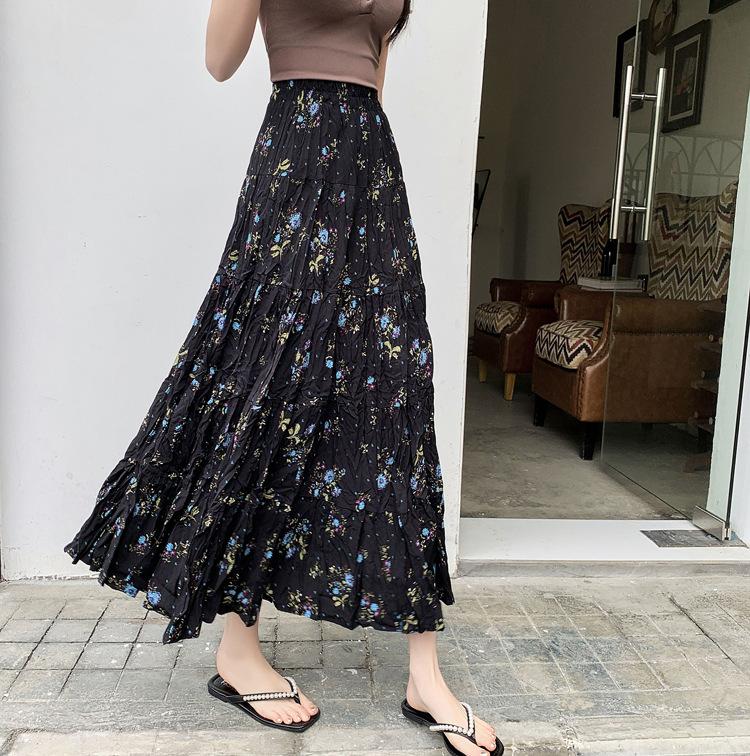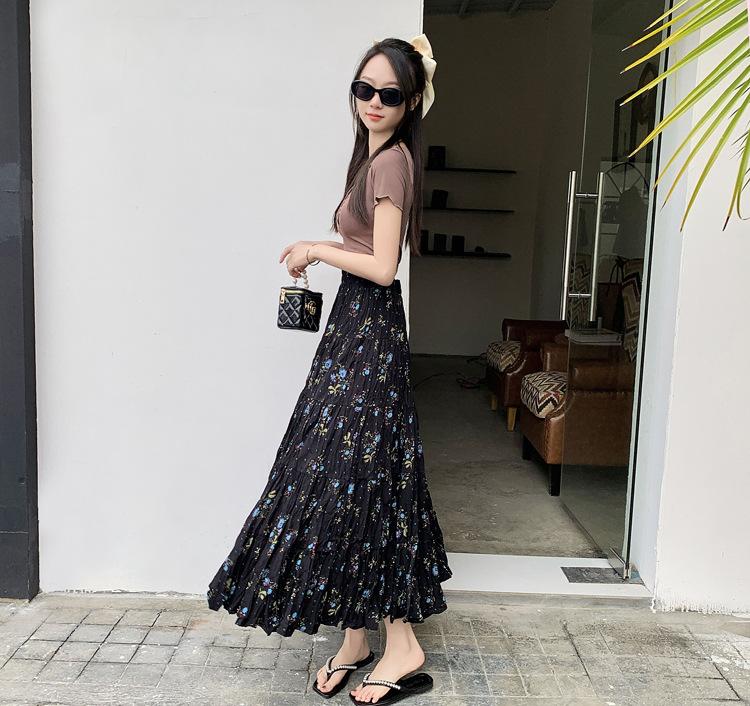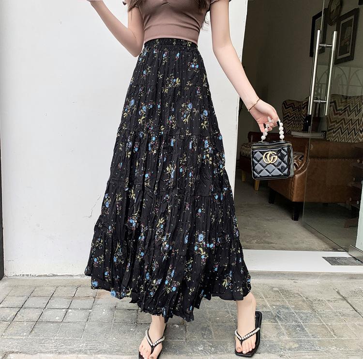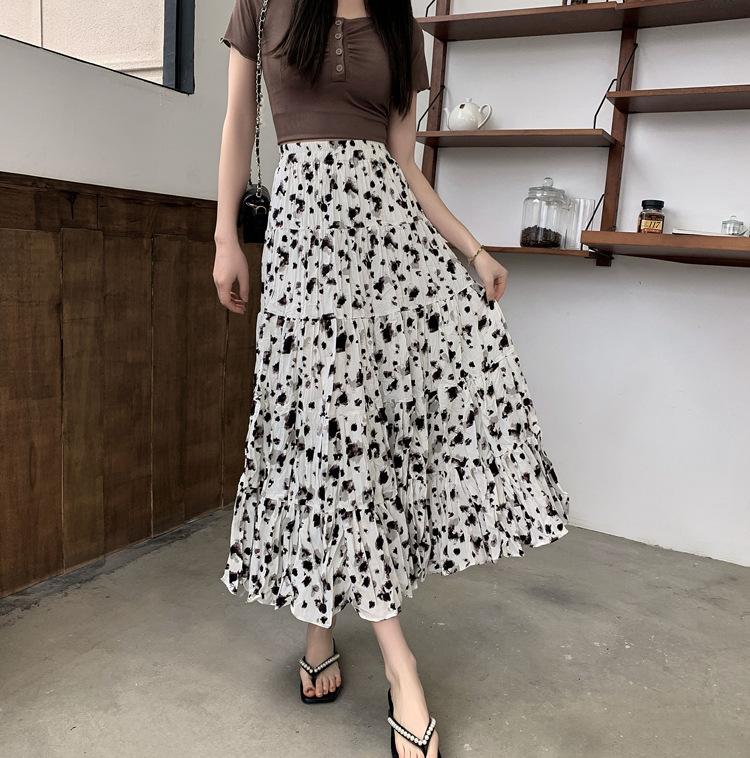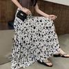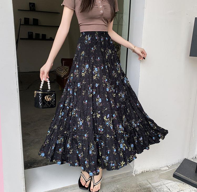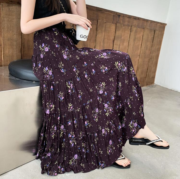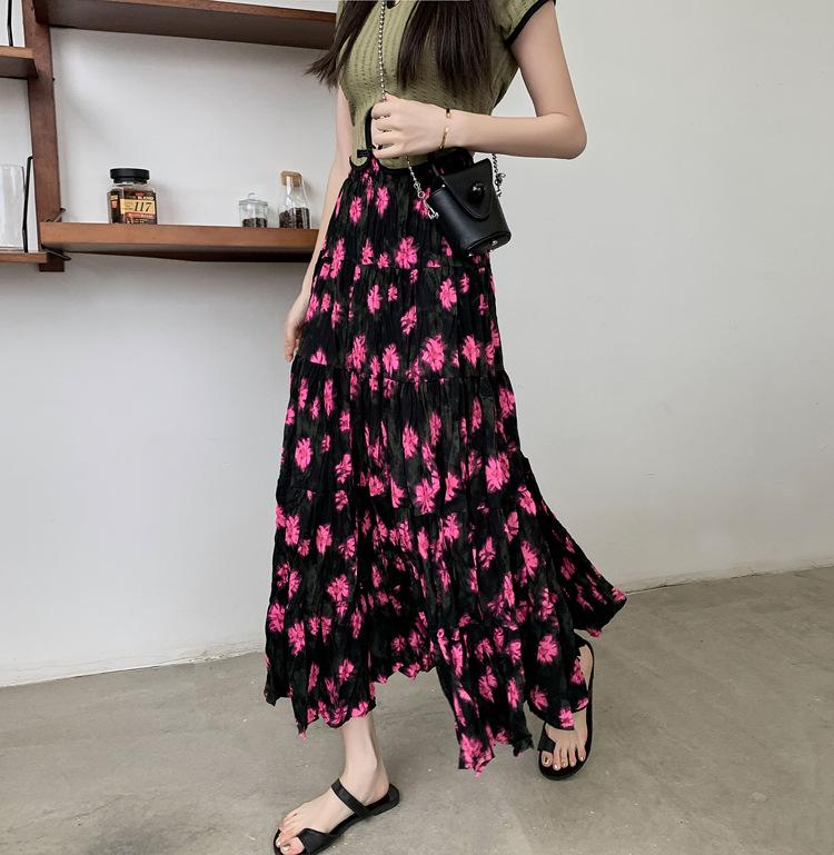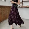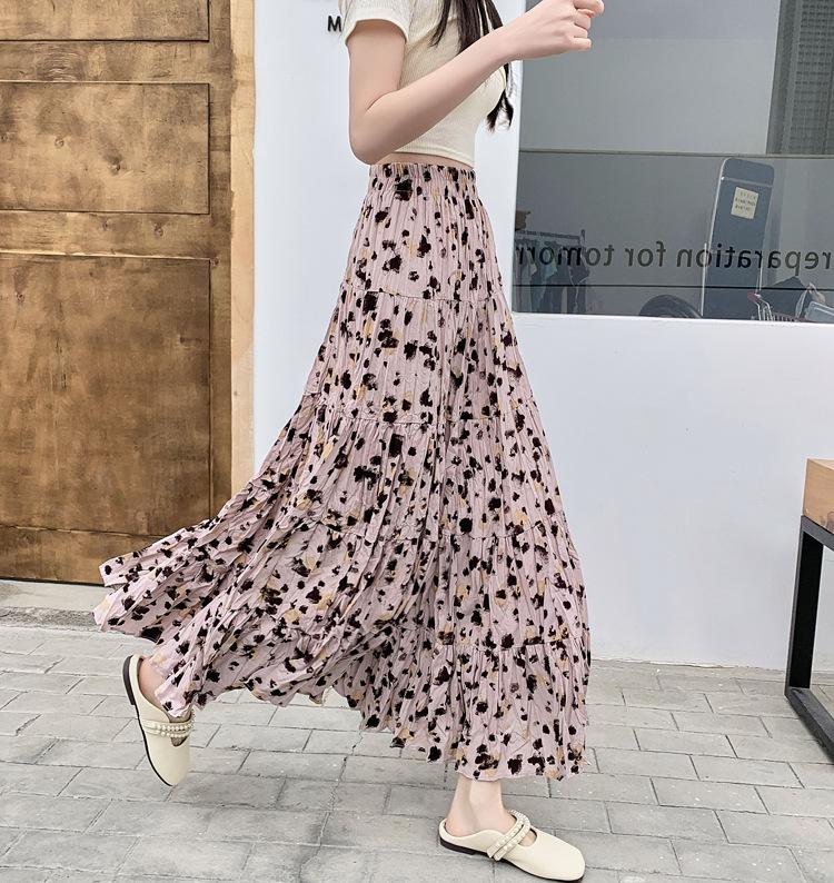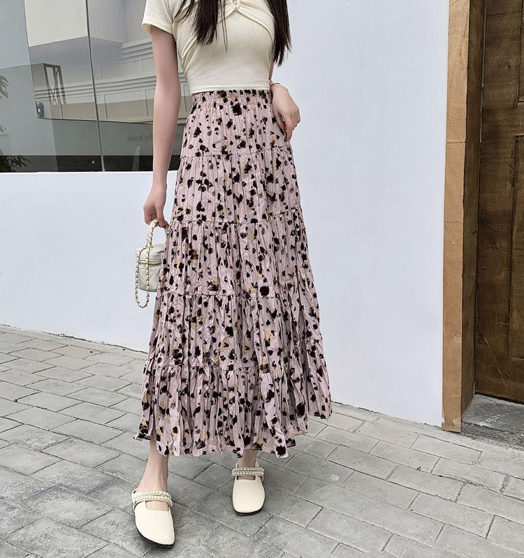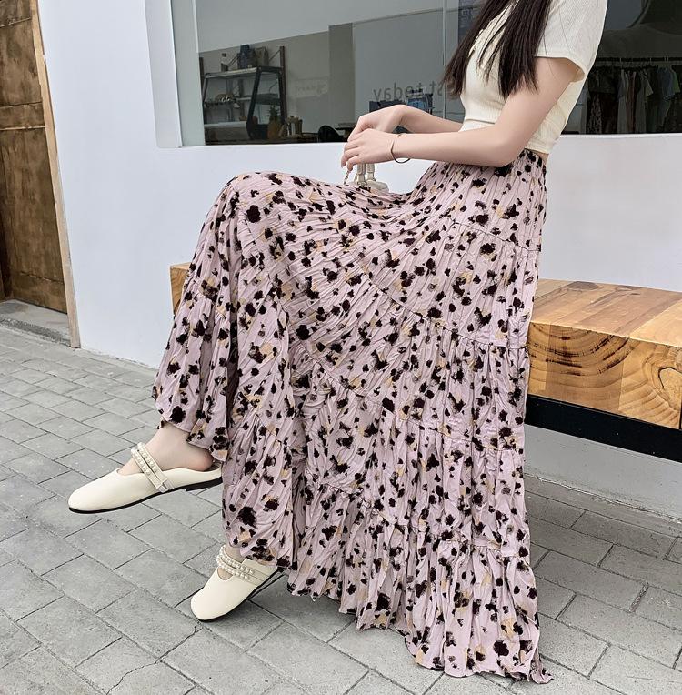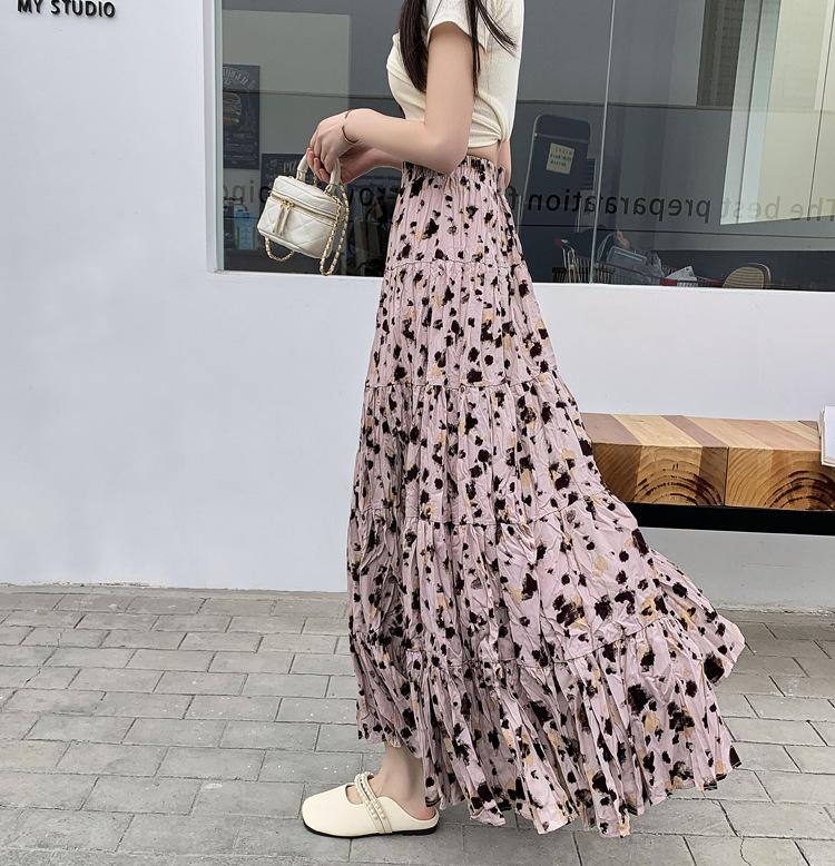Falda midi plisada estilo francés retro con costuras florales de gran vuelo en chifón estampado plisado de cintura alta falda larga 2024