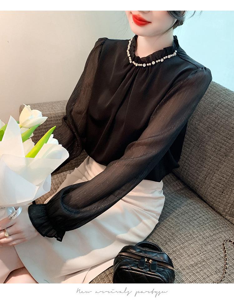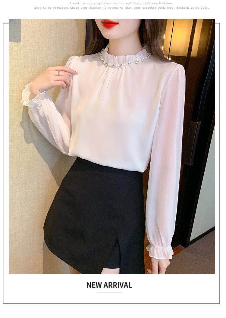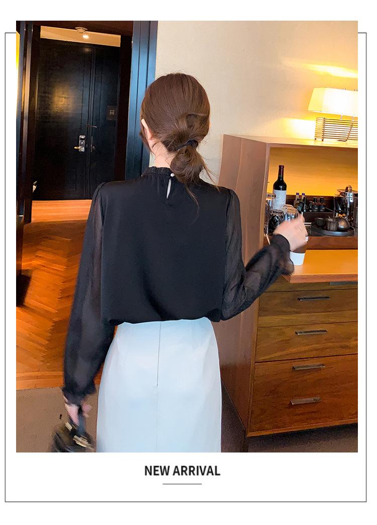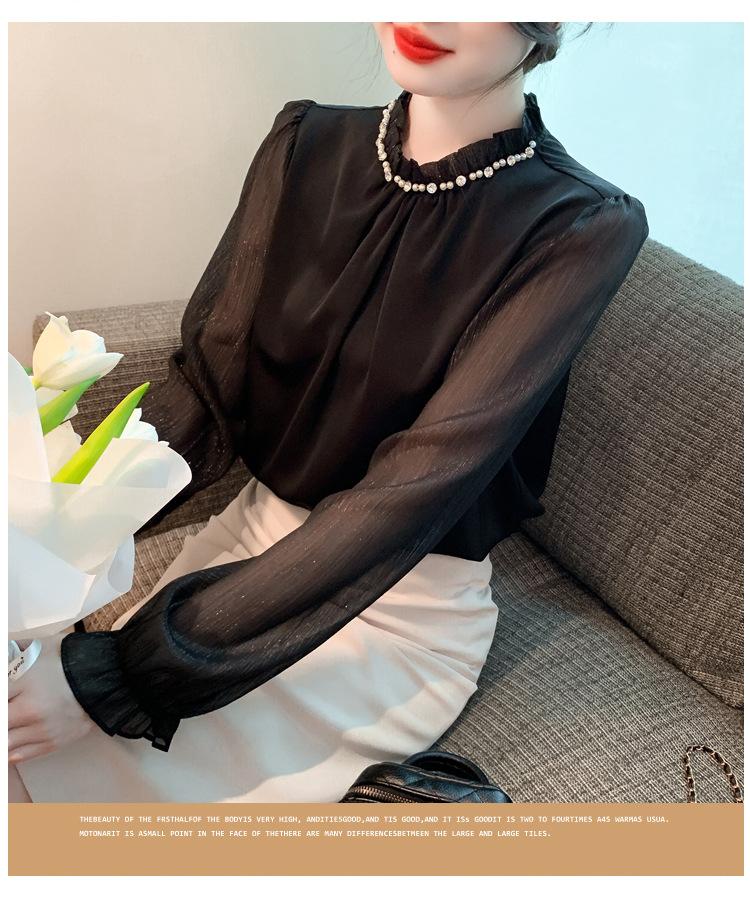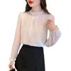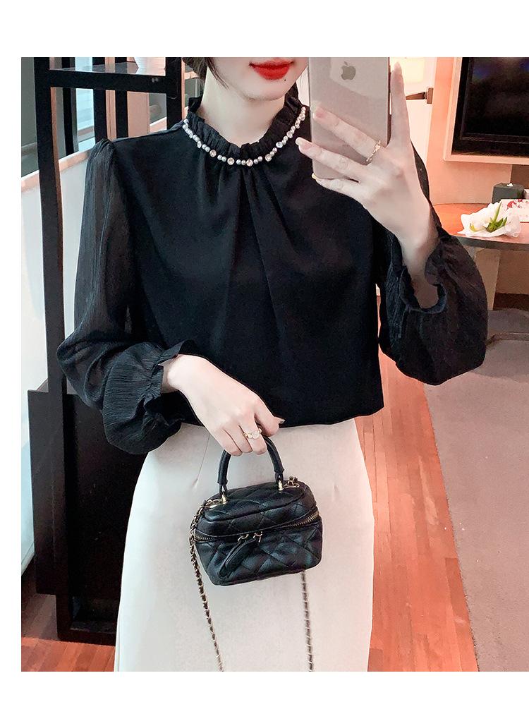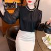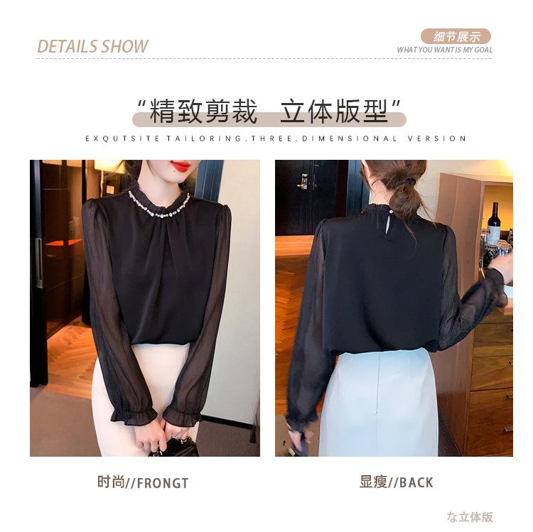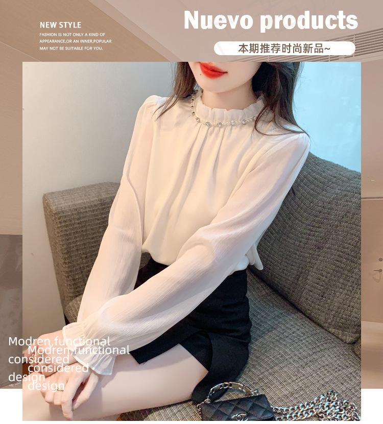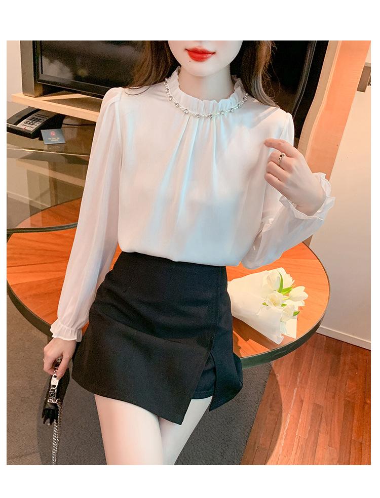 Camisa Francesa para Mujer Camisa de Chifón de Bajo Alto 2024 Otoño Nuevo Top de Cuello Alto Camisa Básica con Cuentas con Camiseta Interior