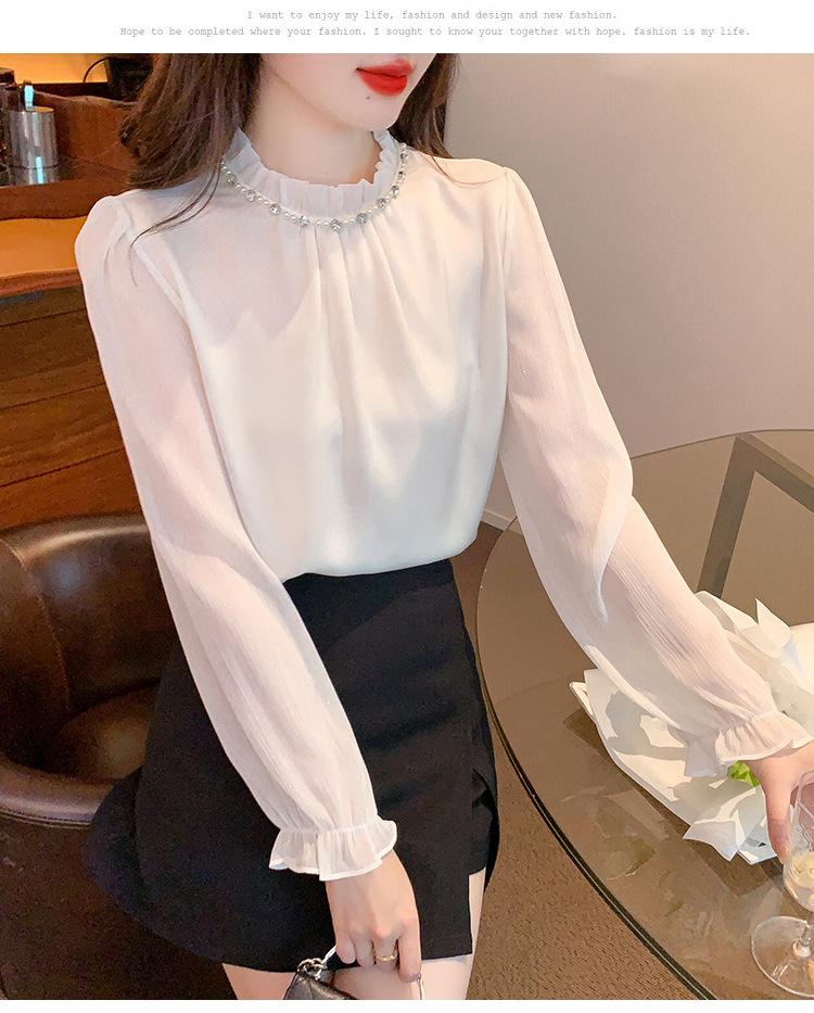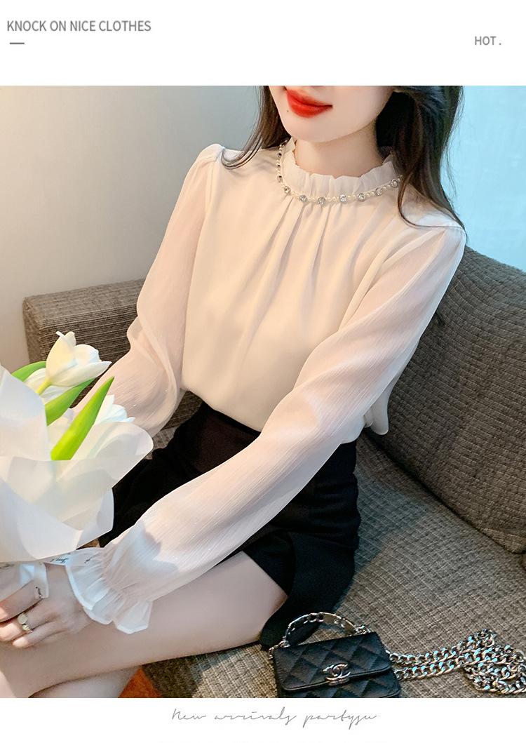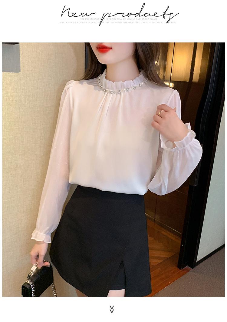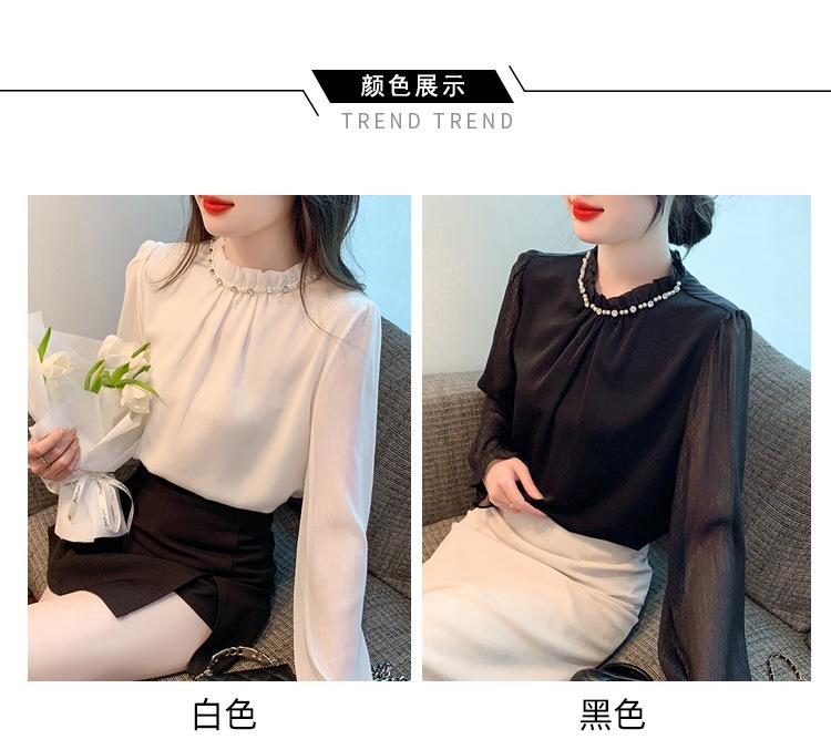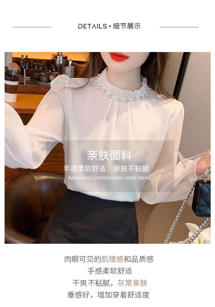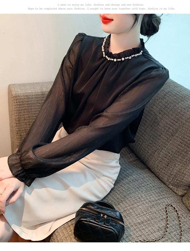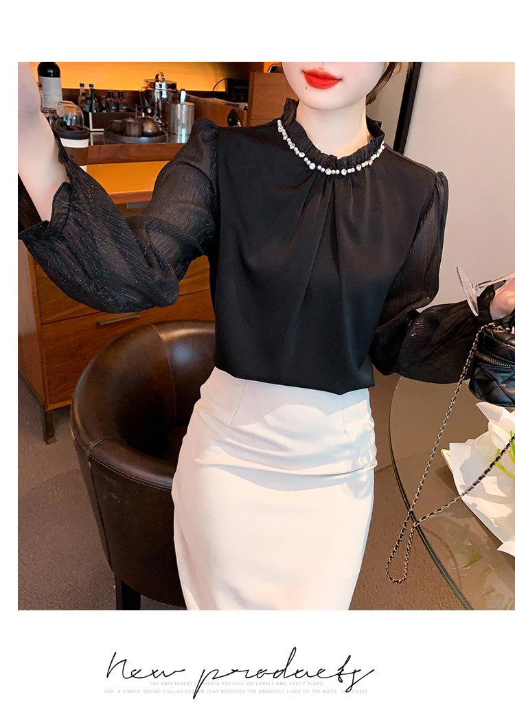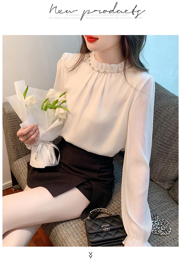 Camisa Francesa para Mujer Camisa de Chifón de Bajo Alto 2024 Otoño Nuevo Top de Cuello Alto Camisa Básica con Cuentas con Camiseta Interior