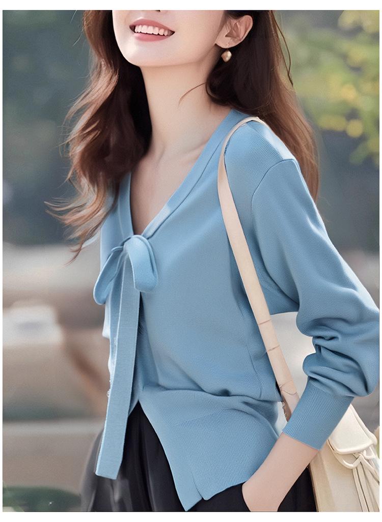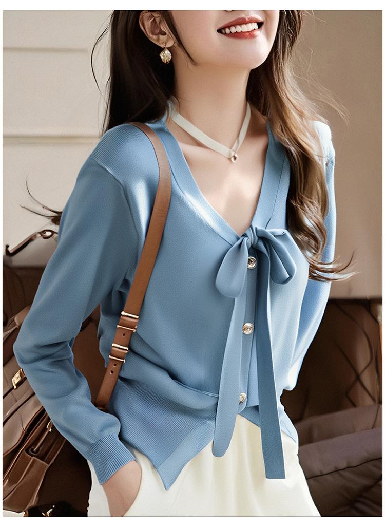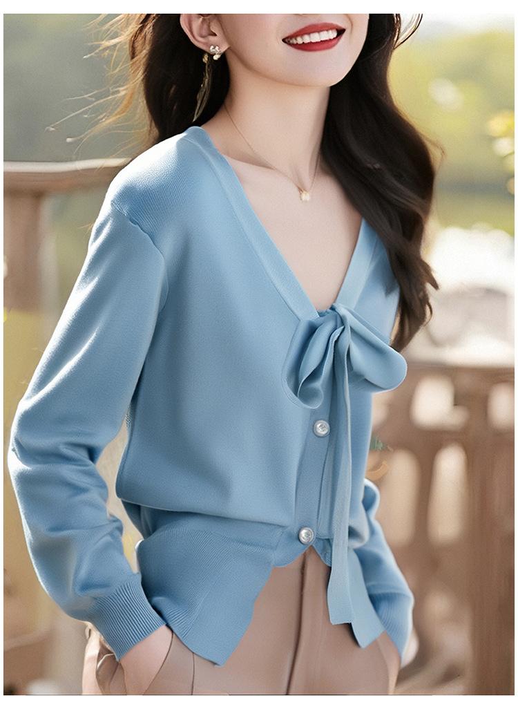Cárdigan de Punto Nuevo Primavera 2025 Cuello en V con Lazo para Mujer Color Sólido Casual Más Fácil de Combinar Temperamento Manga Larga Top Camisa Pequeña
