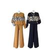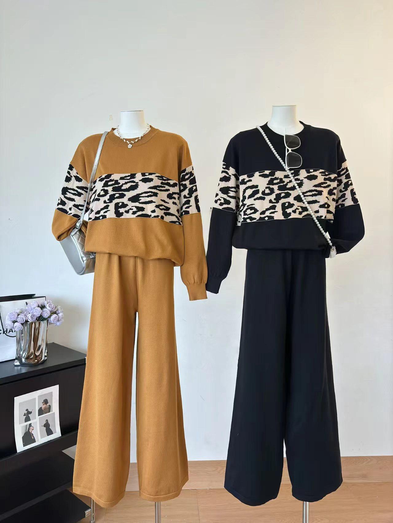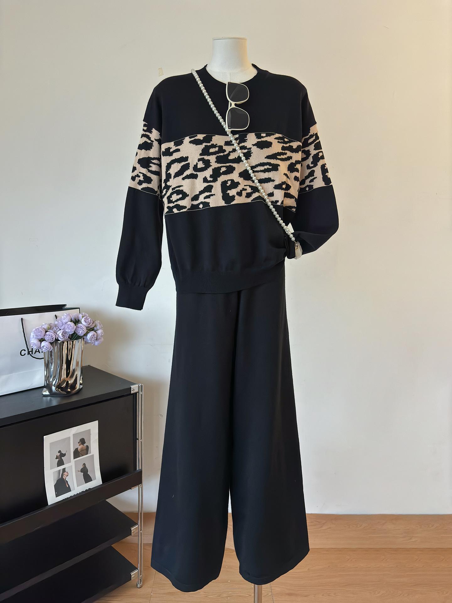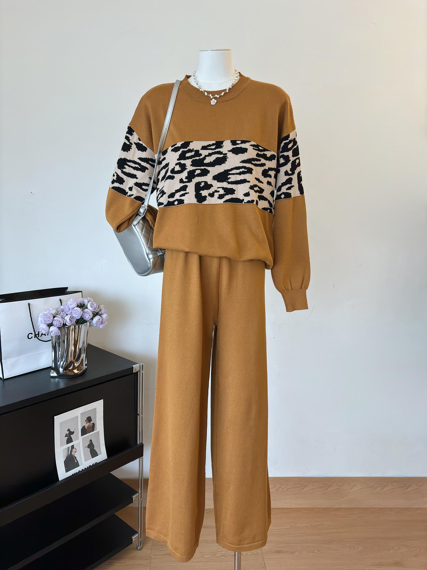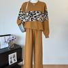 Conjunto de dos piezas de alta gama con estampado de leopardo y cuello redondo para mujer, de fábrica.