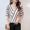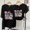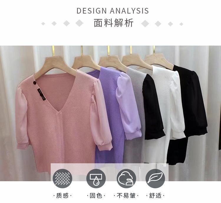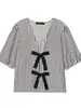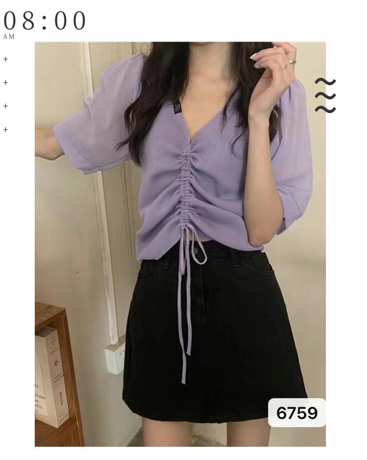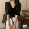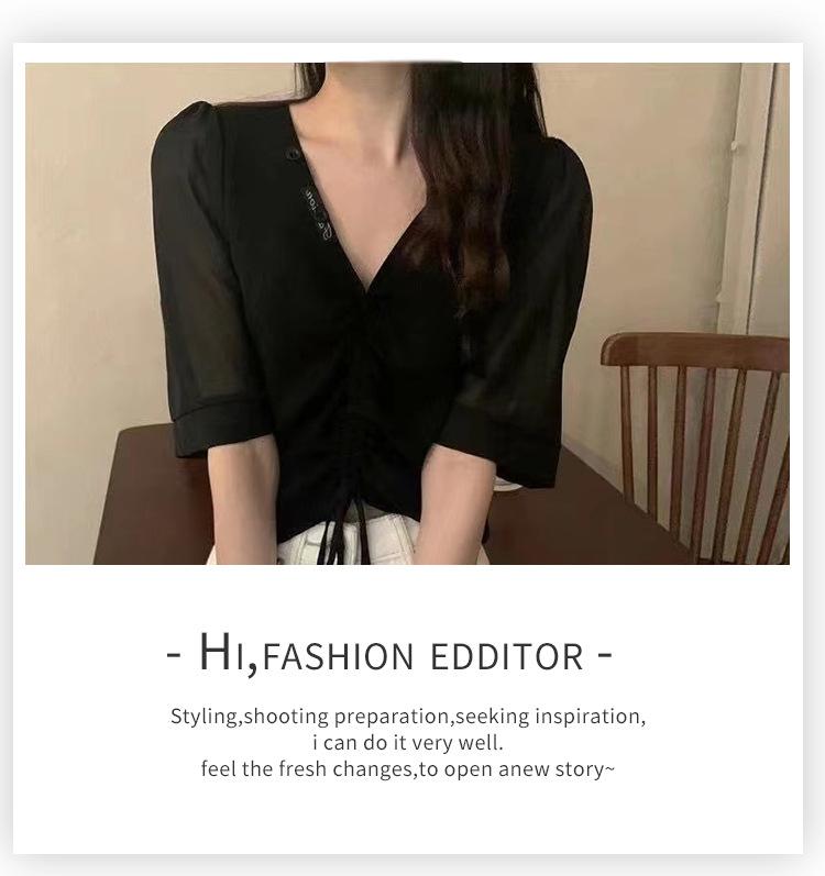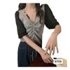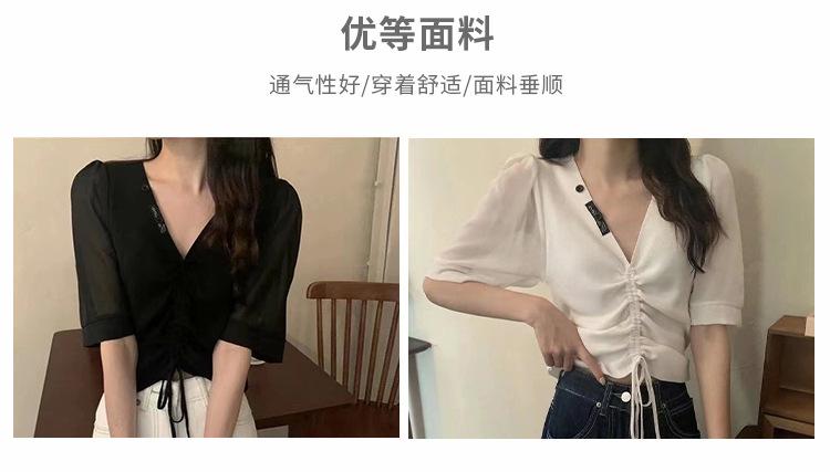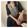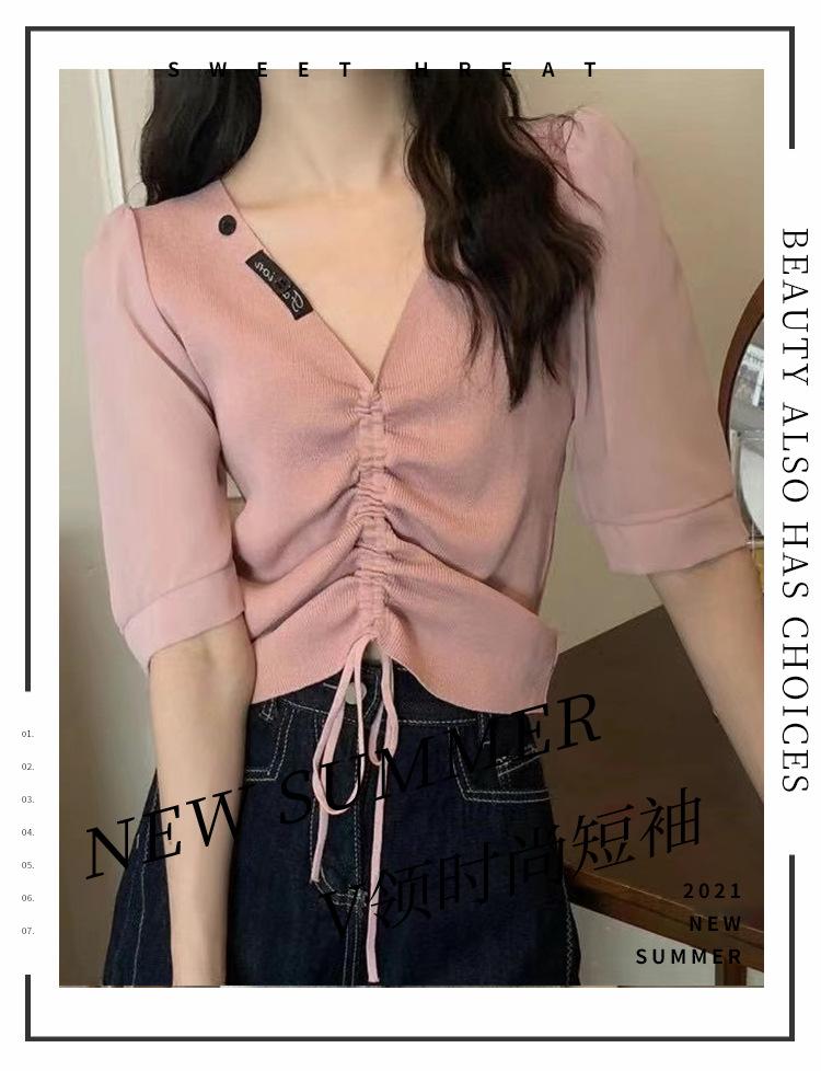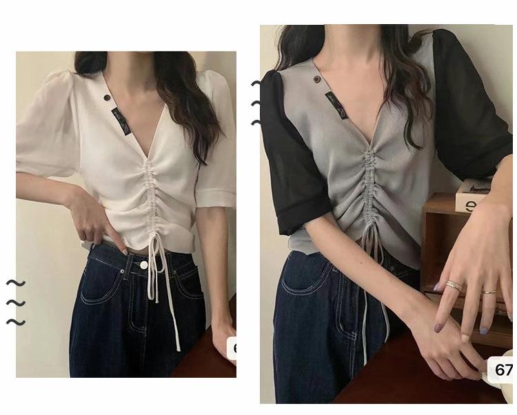 Nuevo Verano Transfronterizo Estilo Coreano Cuello en V Plisado Cordón Corto Punto Top de Manga Corta para Mujer