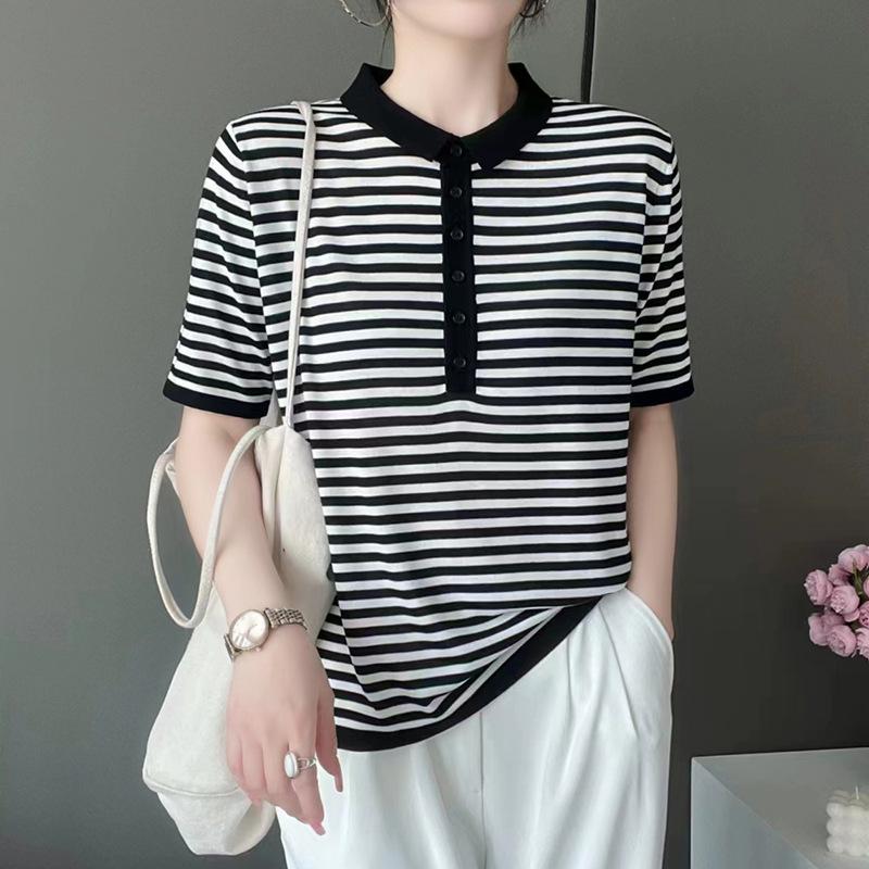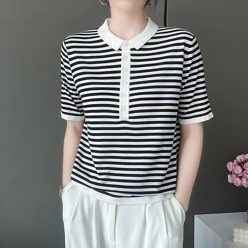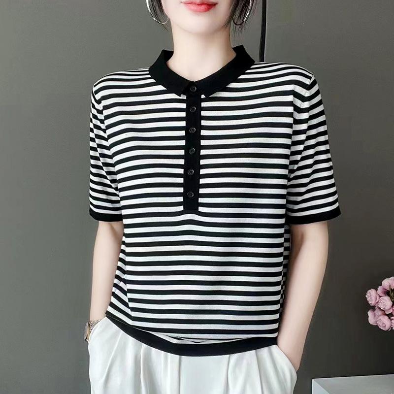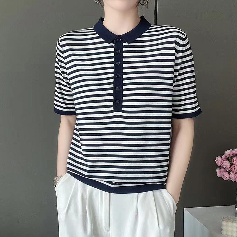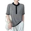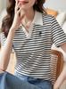 Suéter pulóver de solapa a rayas con bloques de color para mujer, verano 2025, nuevo, elegante, adelgazante, con botones, casual, manga corta