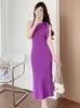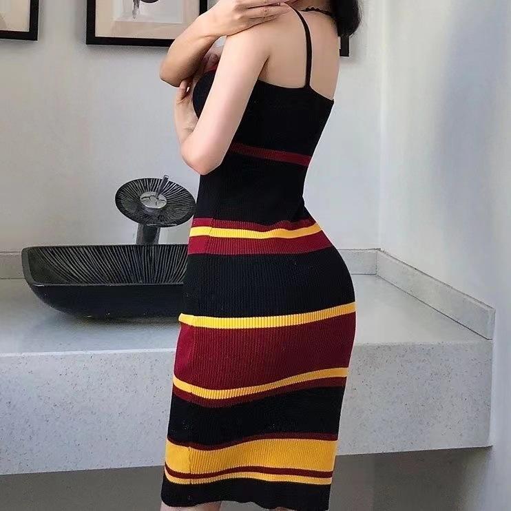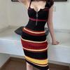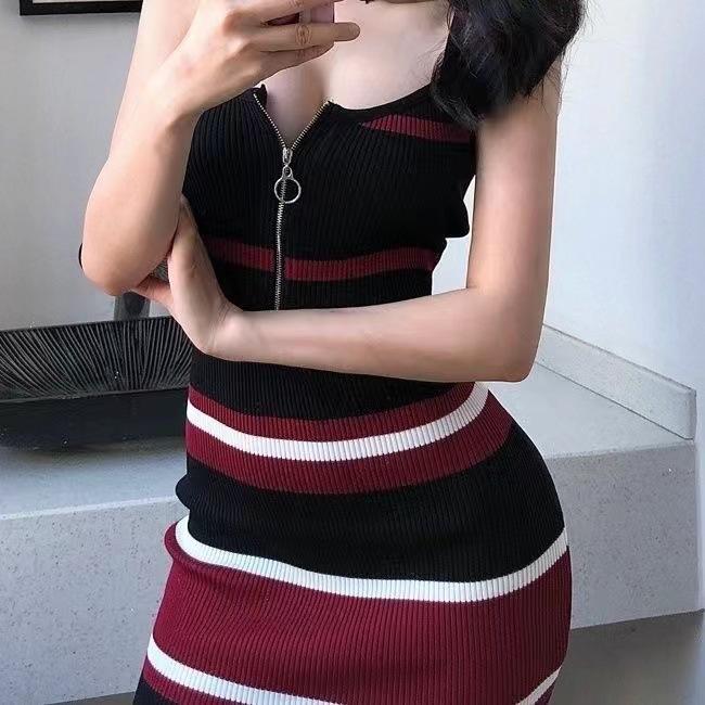 Vestido de verano estilo coreano elegante, sin mangas, con cremallera, escote en V, color contrastante, de longitud media, de punto, estilo chaleco, vestido a la cadera para mujer