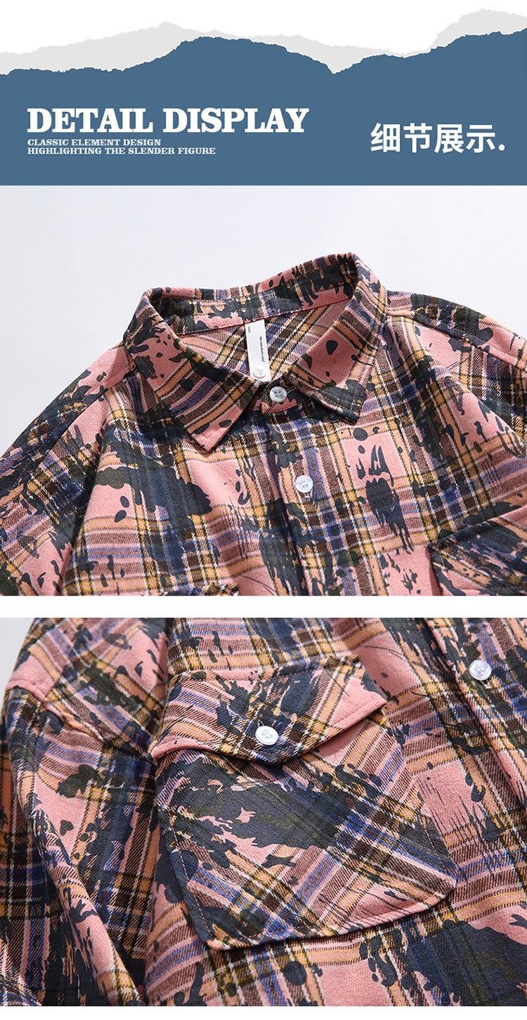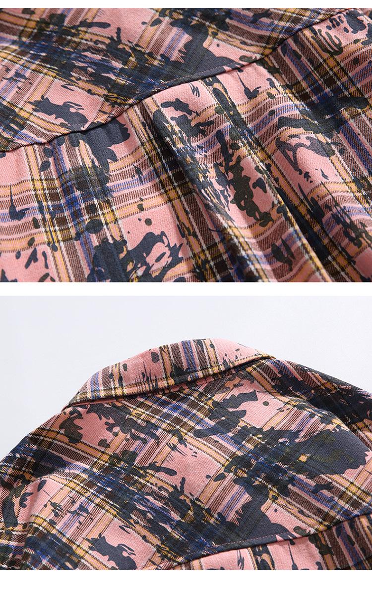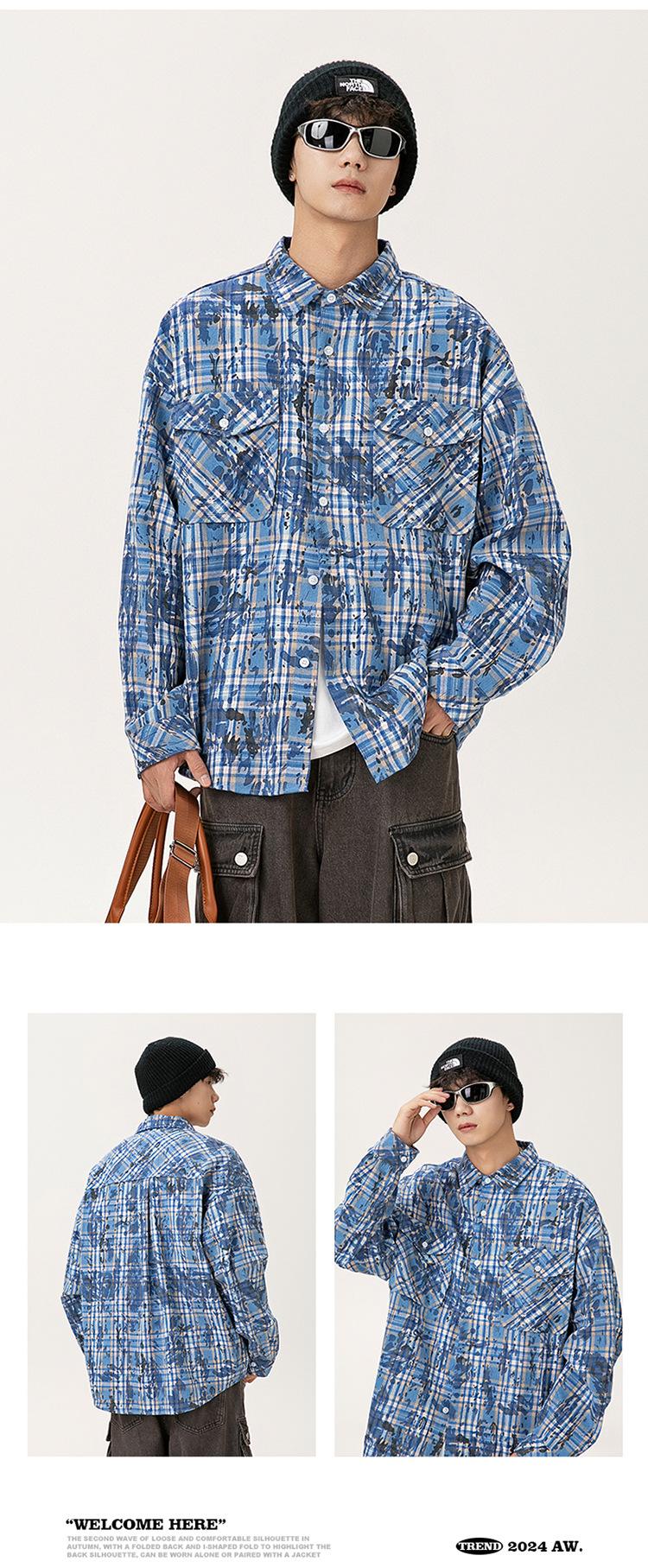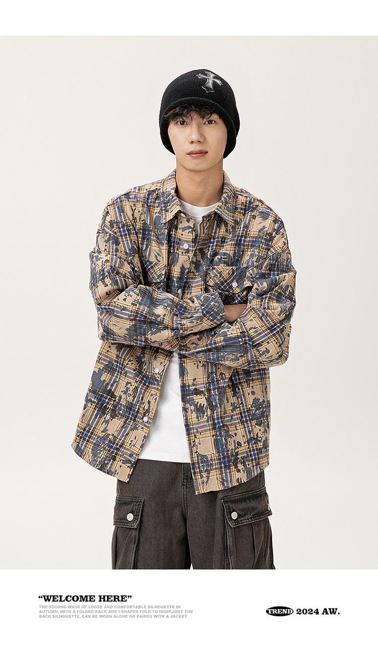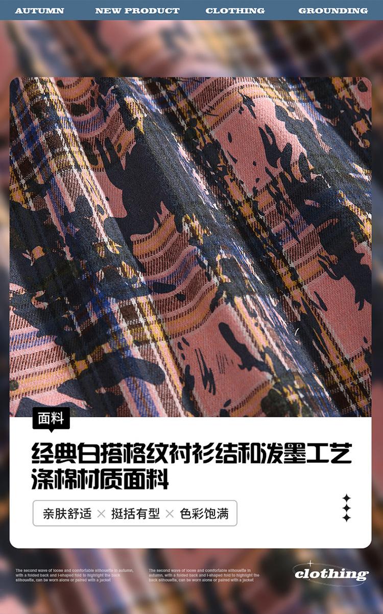 24 Nueva Camisa Clásica Versátil de Otoño a Cuadros con Salpicaduras de Tinta, Marca de Moda, Holgada, de Manga Larga