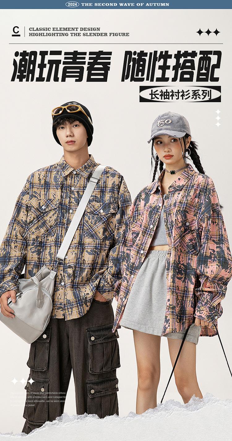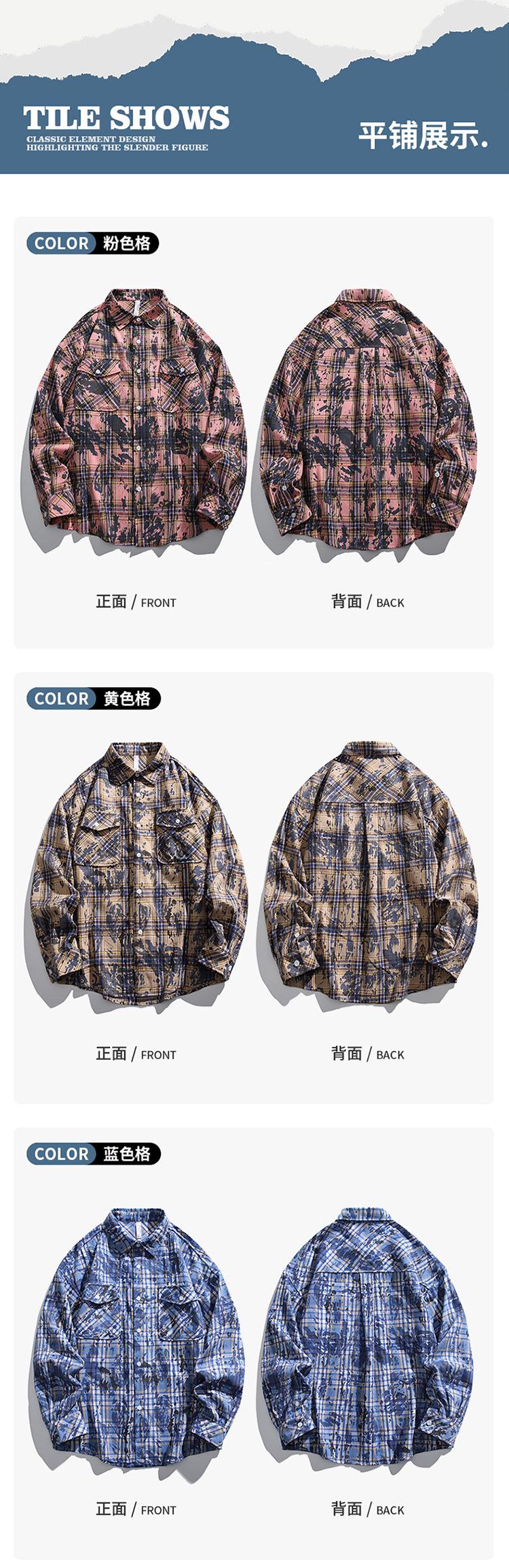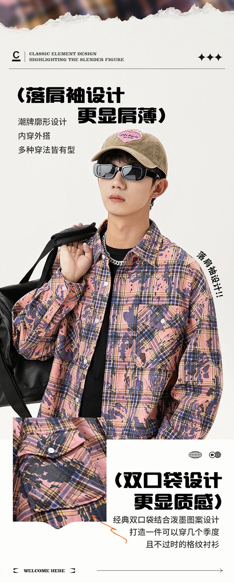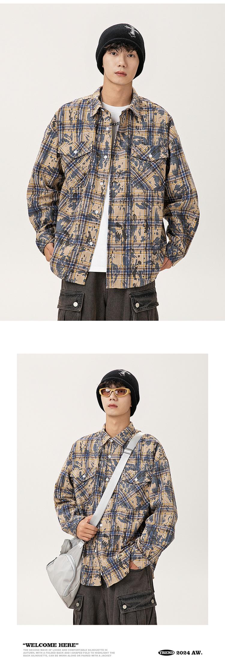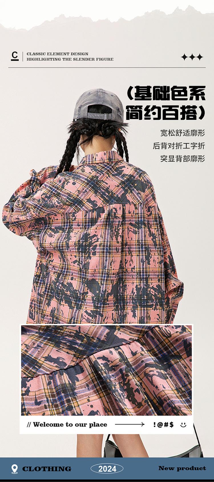 24 Nueva Camisa Clásica Versátil de Otoño a Cuadros con Salpicaduras de Tinta, Marca de Moda, Holgada, de Manga Larga