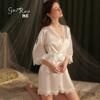Lencería Sexy Deseo Puro Estampado de Mariposas Perspectiva con Cordones Profundo V Cárdigan Kimono Camisón Traje de Bata