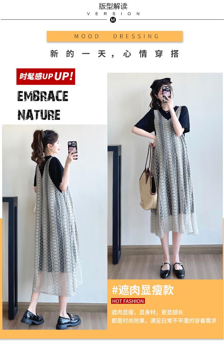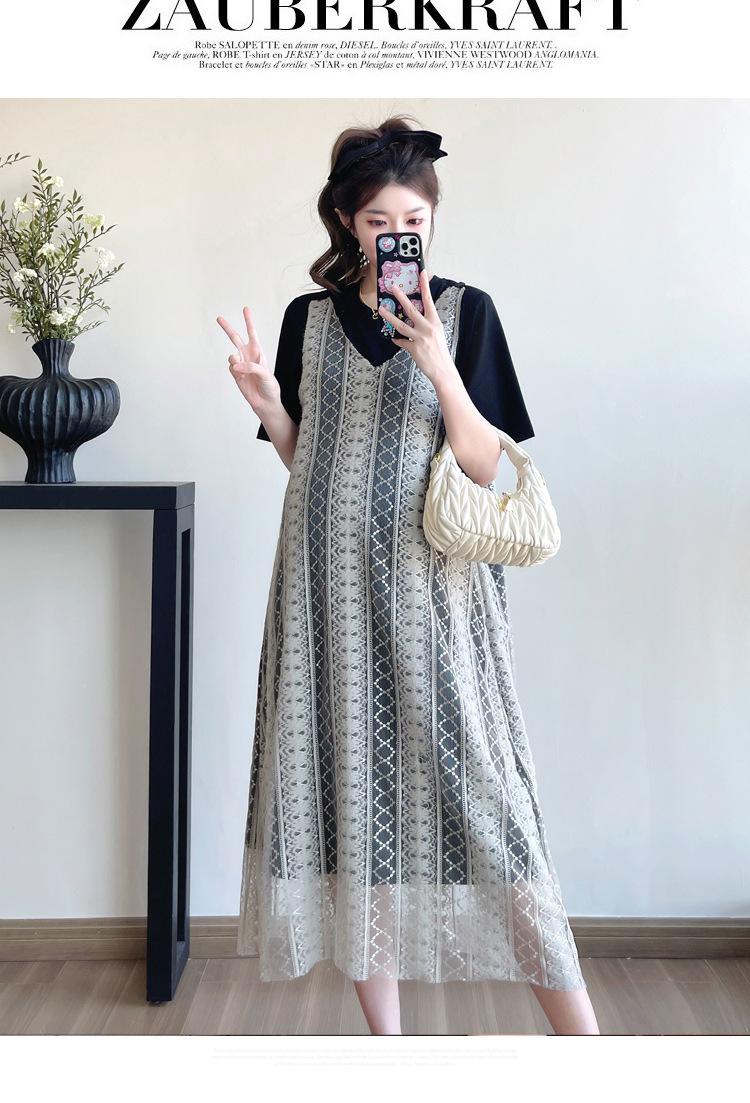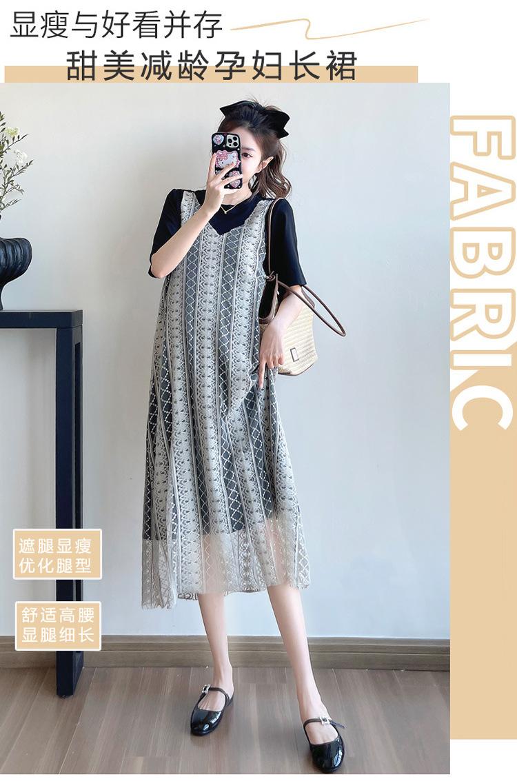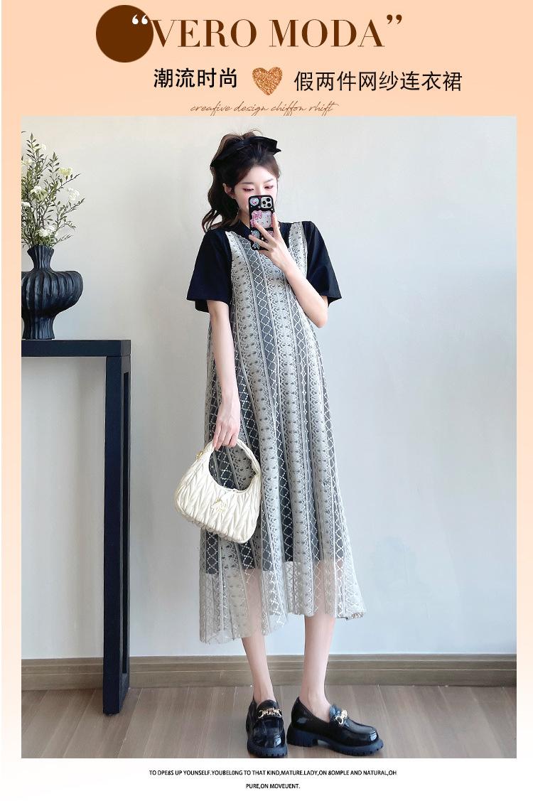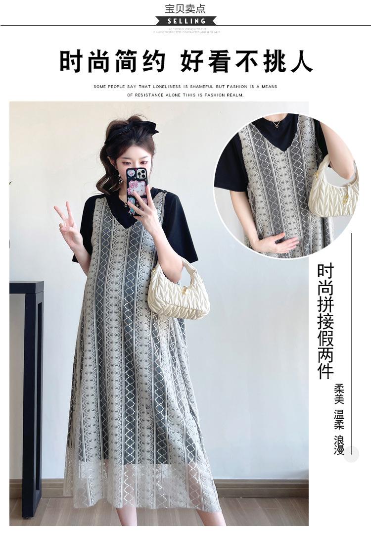 Ropa de Maternidad 2025 Verano Nuevo Diseño Francés de Empalme de Dos Piezas Falsas Vestido de Maternidad de Encaje con Aberturas