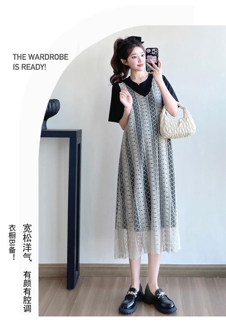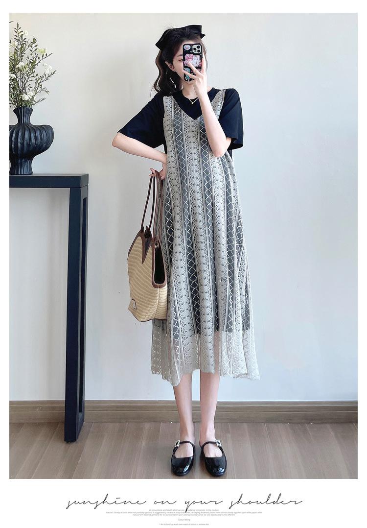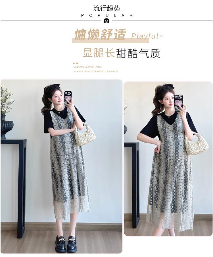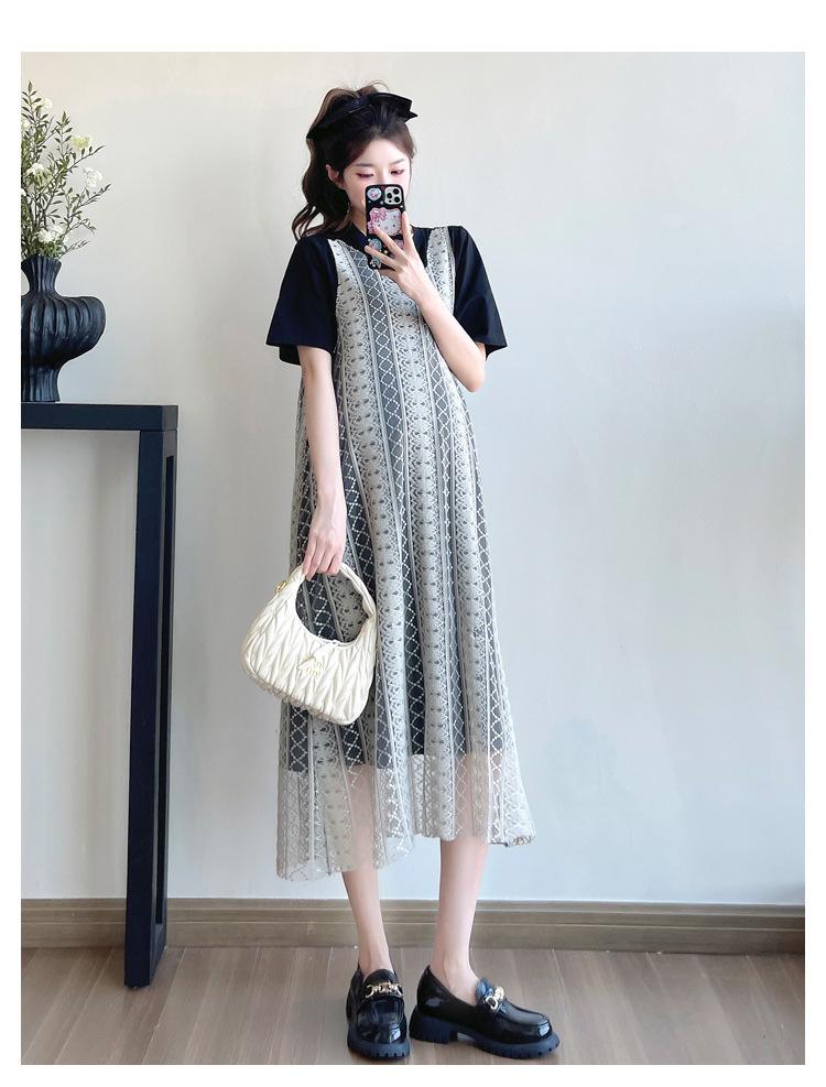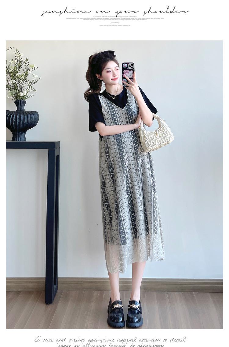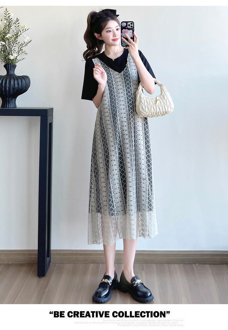 Ropa de Maternidad 2025 Verano Nuevo Diseño Francés de Empalme de Dos Piezas Falsas Vestido de Maternidad de Encaje con Aberturas