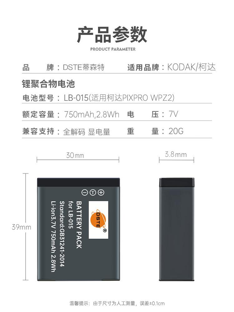 Tysent LB-015 para KODAK KODAK PIXPRO WPZ2 Cargador de Batería para Cámara de Acción