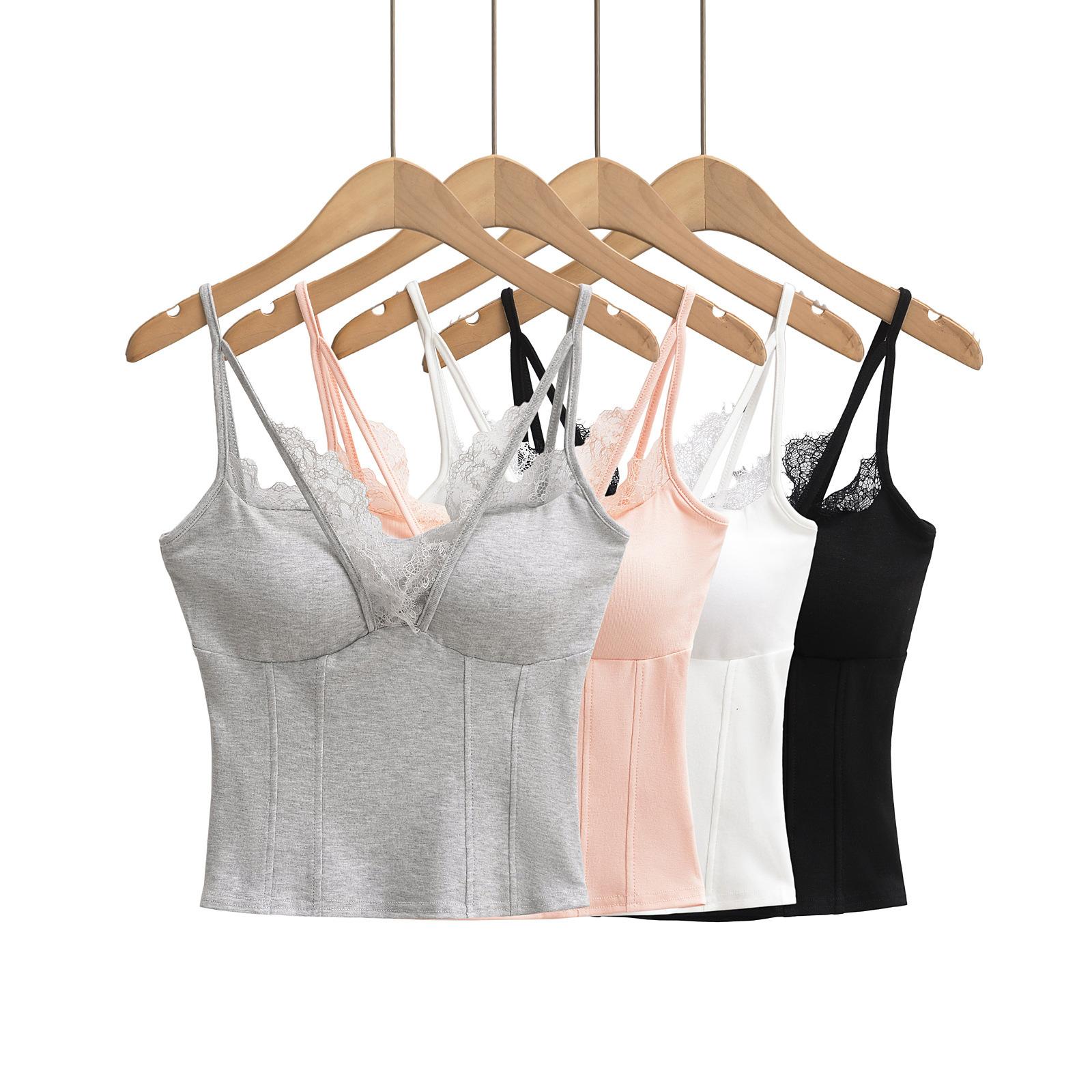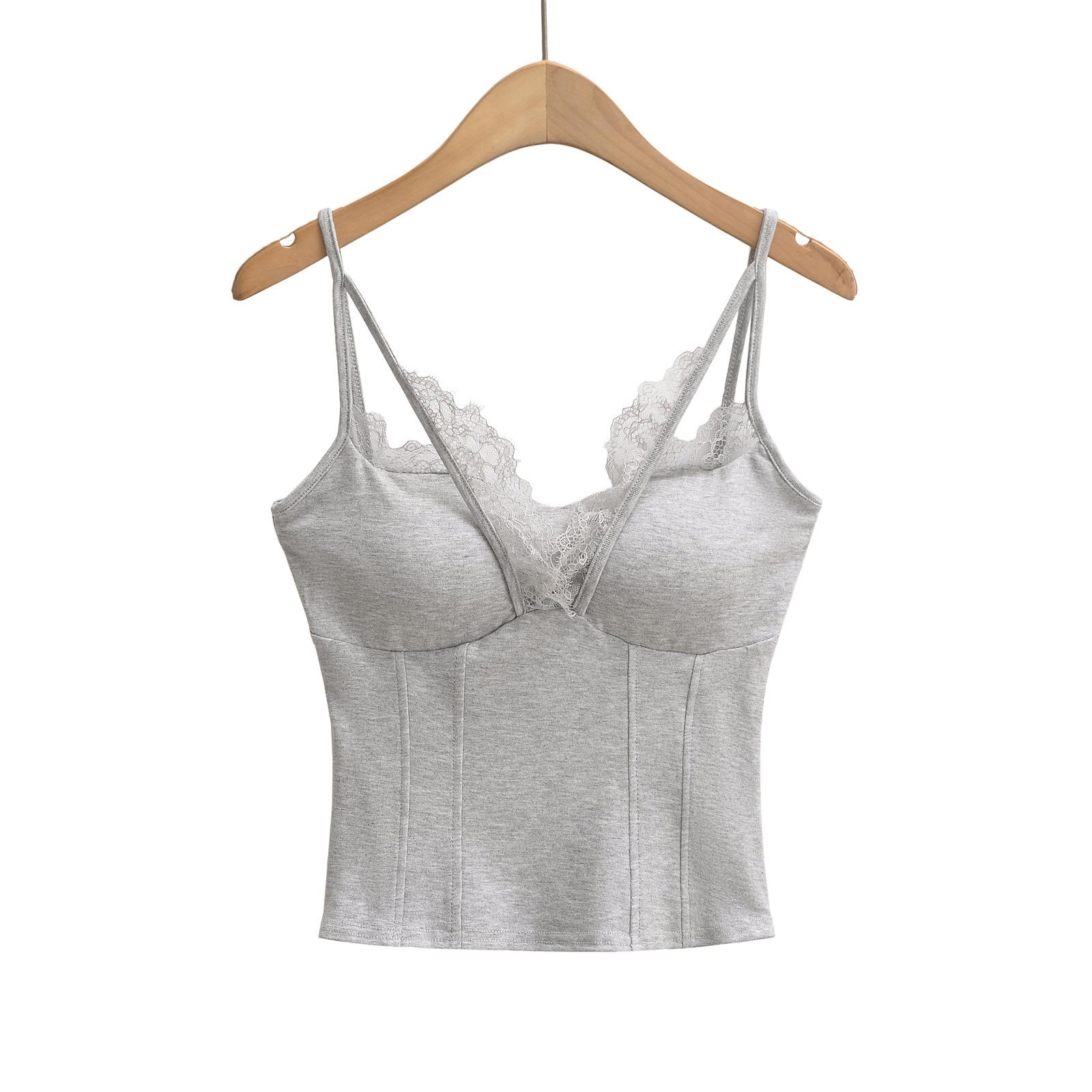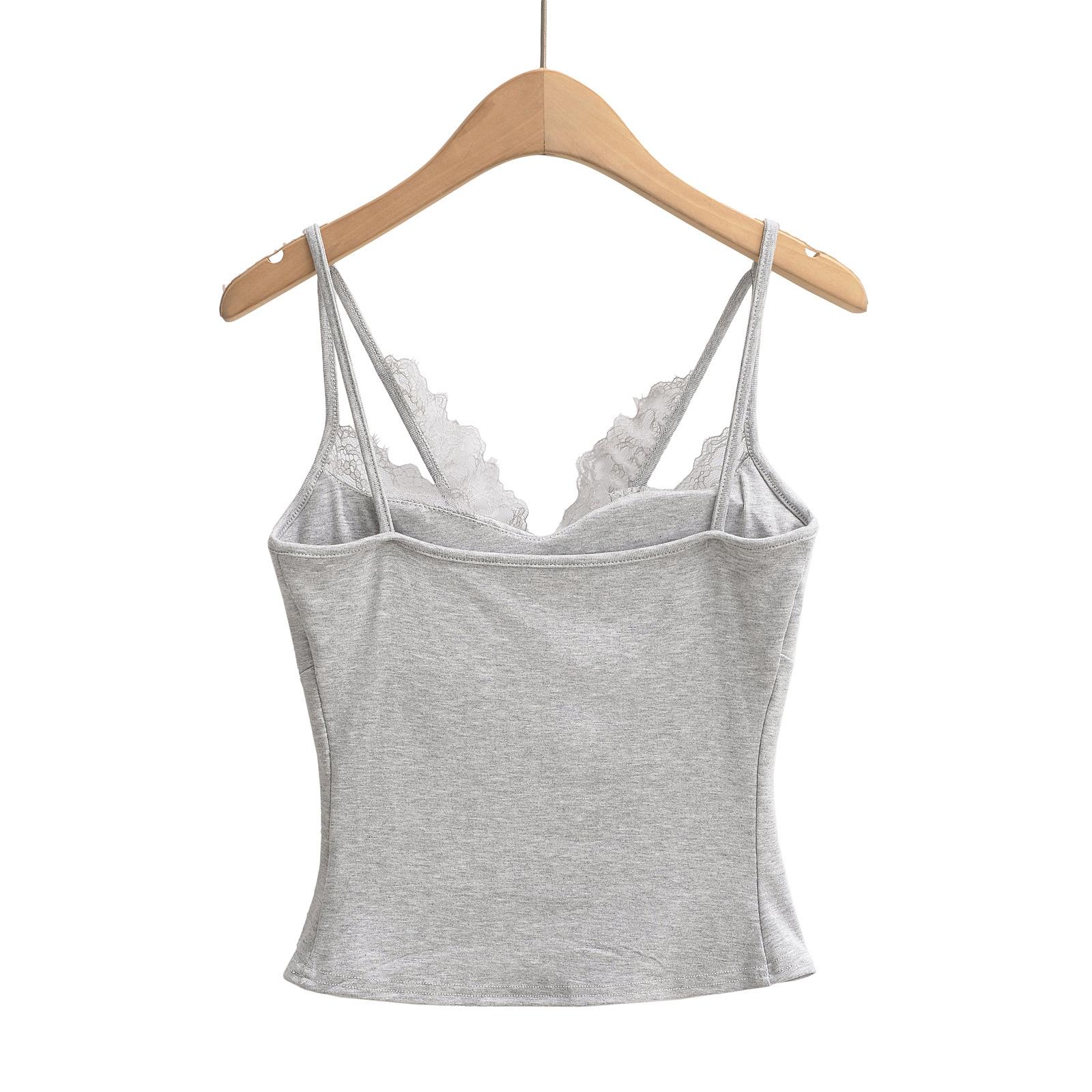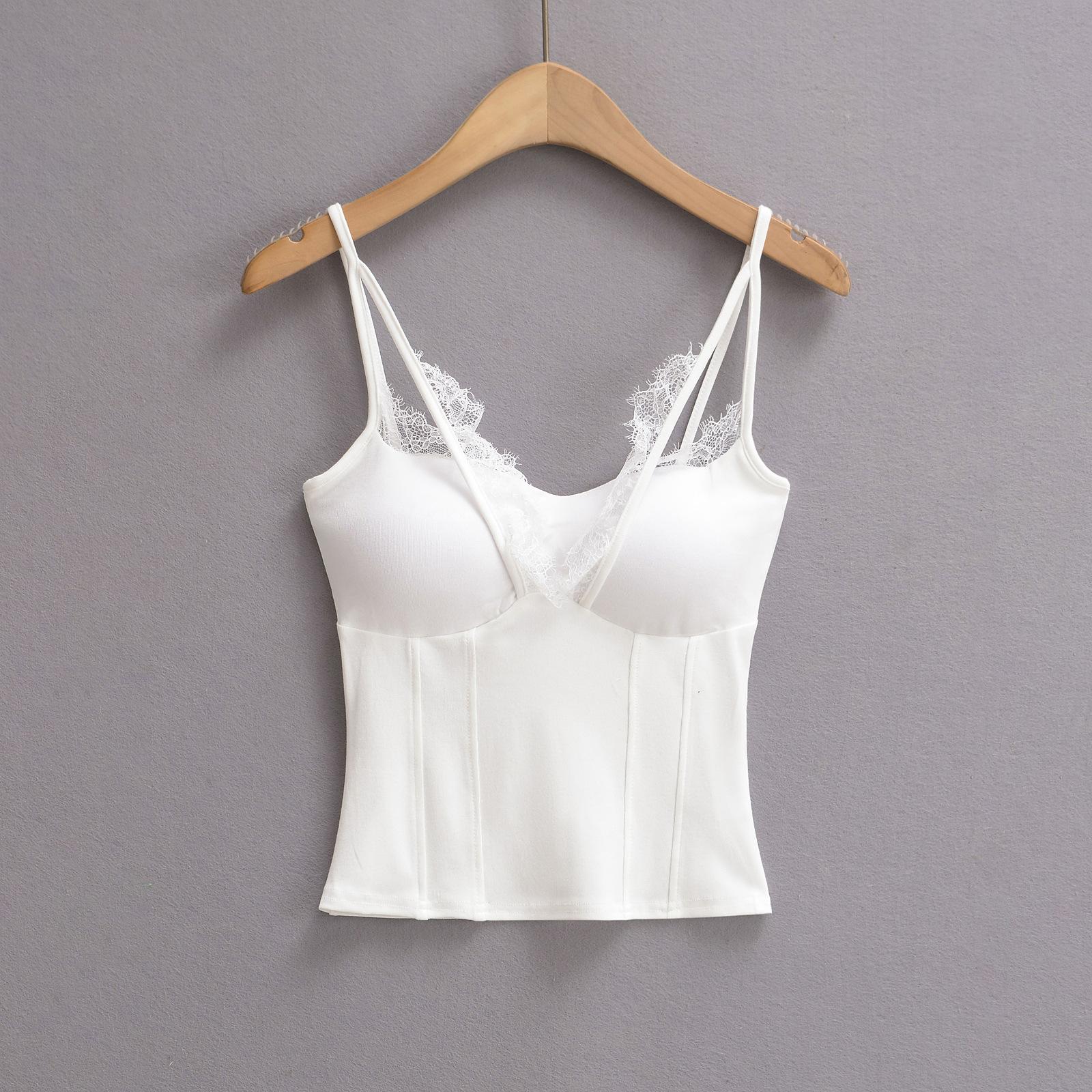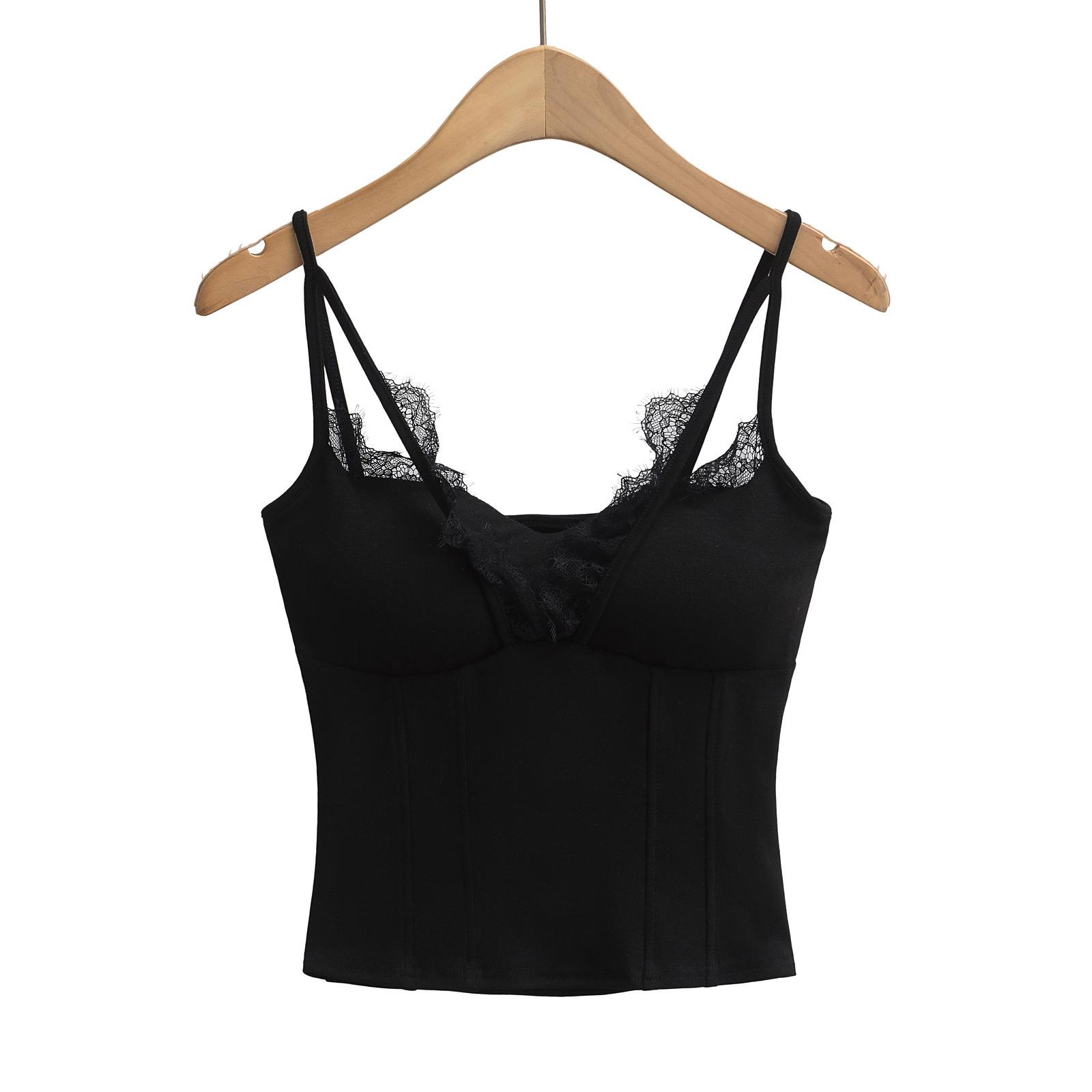 Primavera Nuevo Top Corto Ajustado para Fondo Puro Lujurioso Sexy Encaje Empalmado Camisola para Mujer