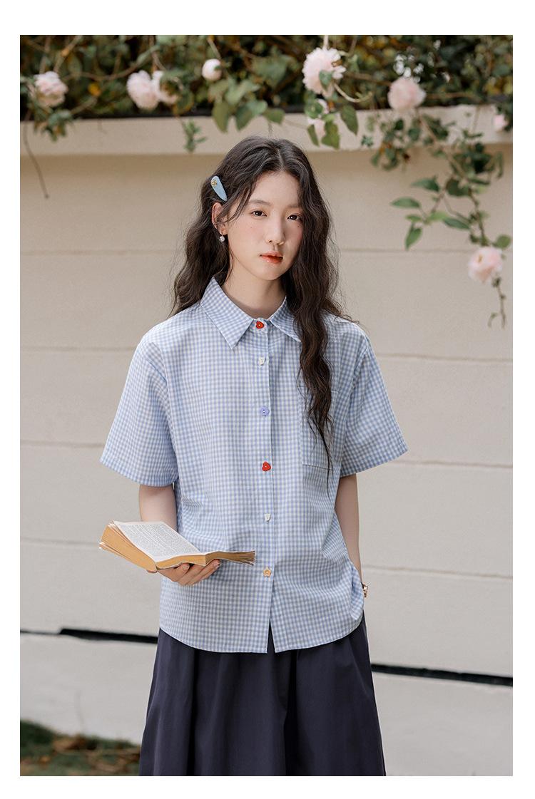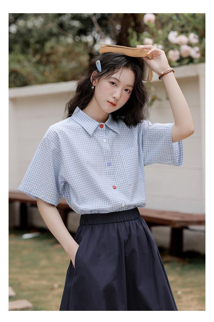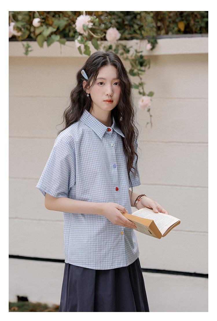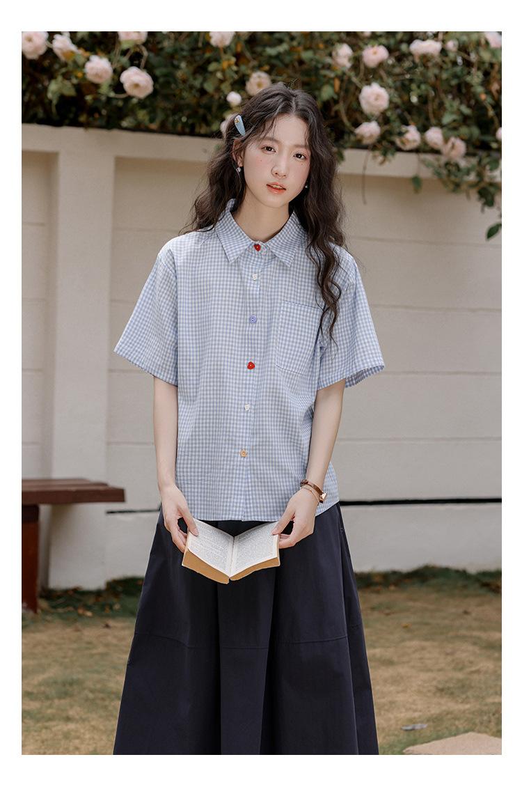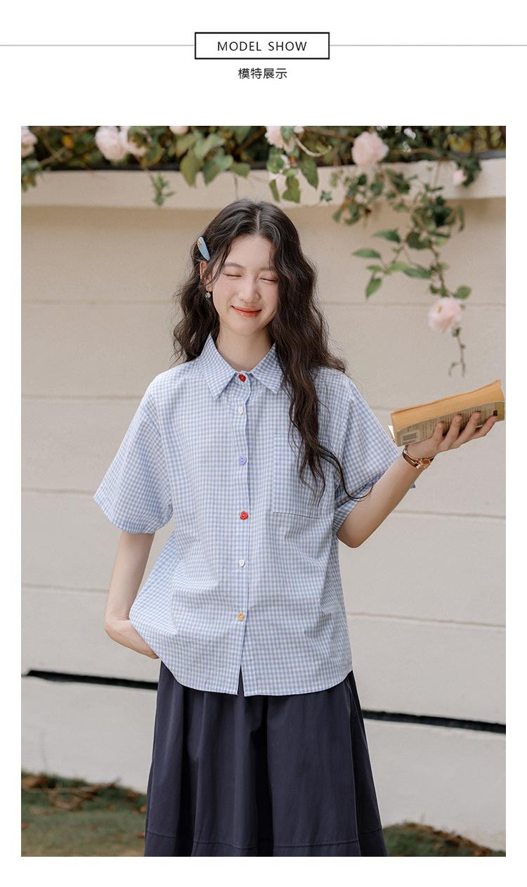 Verano 2025 Nuevo Estilo Japonés Estilo Universitario Botón Colorido Reductor de Edad Cuadros Manga Corta Cuello Polo Camisa Top para Mujer