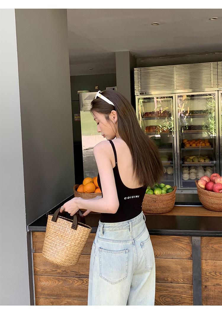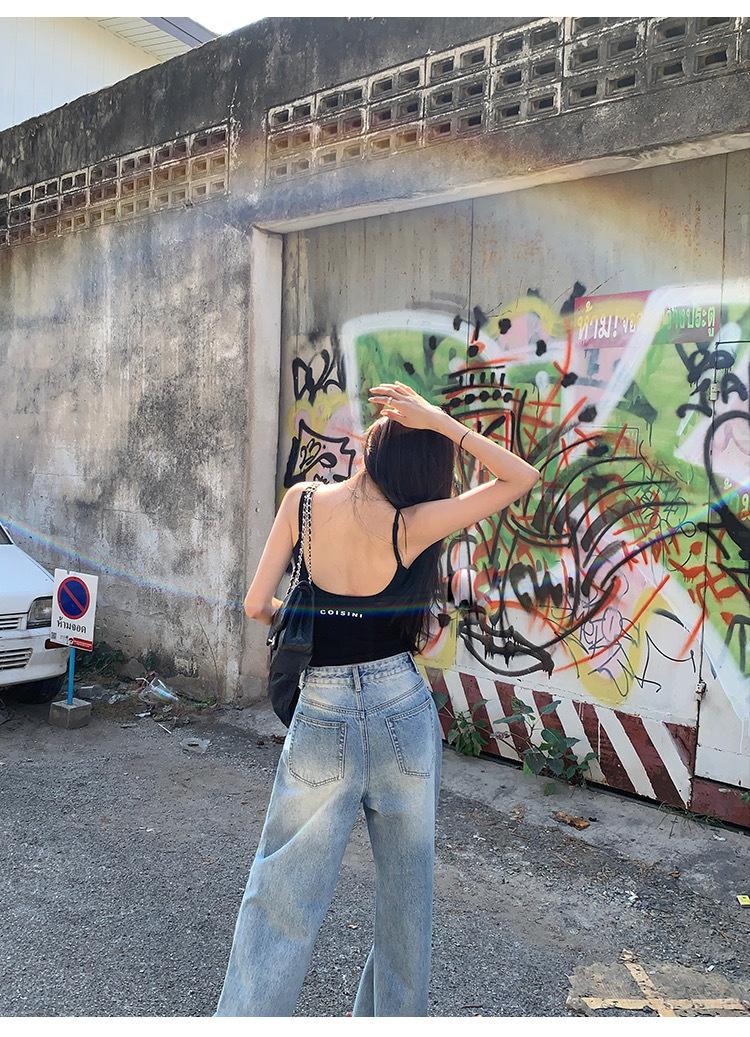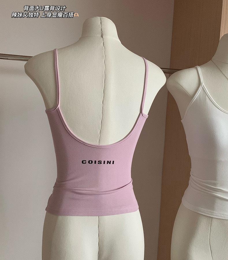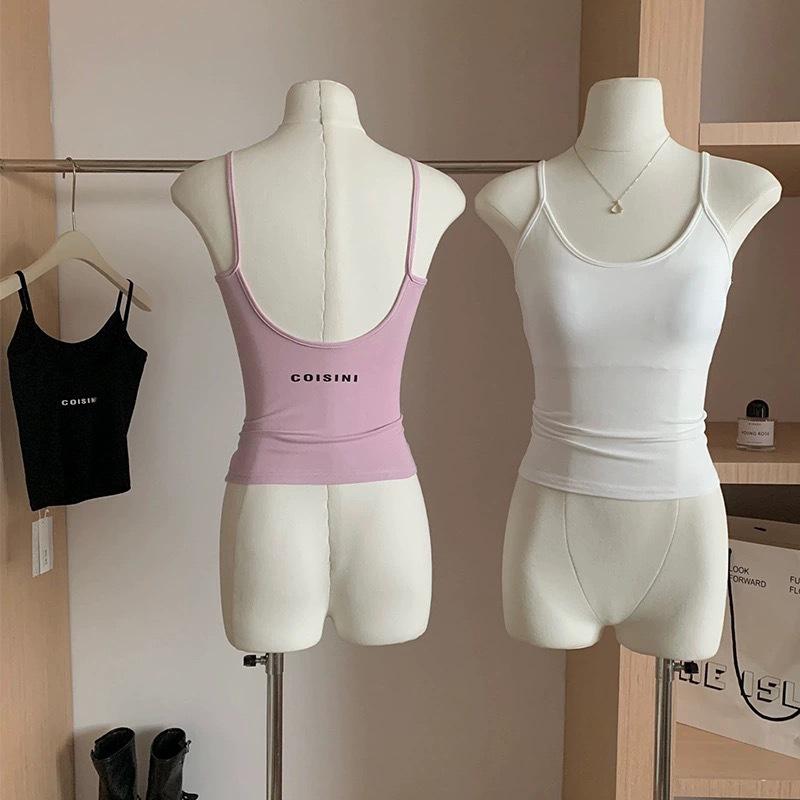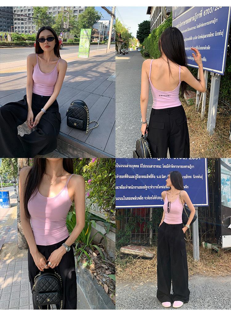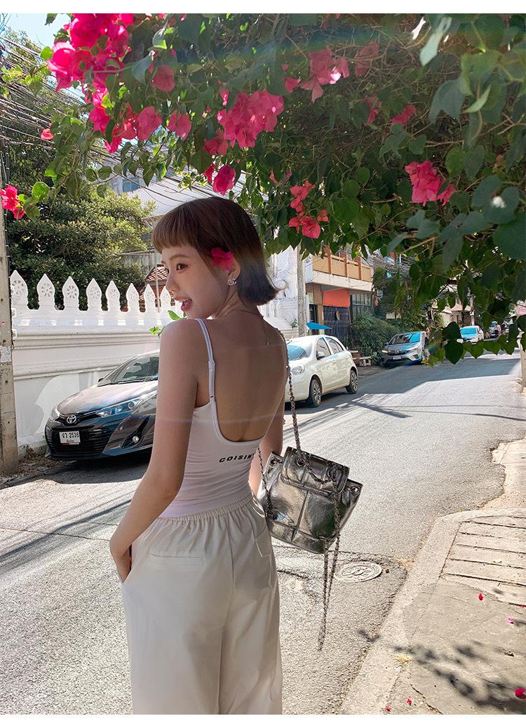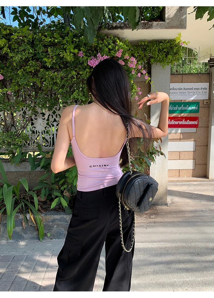Top de tirantes finos con espalda descubierta y estampado de letras estilo coreano, sexy, ajustado, con espalda descubierta, de hada, sencillo, combinable con todo, con copa fija.