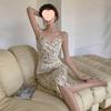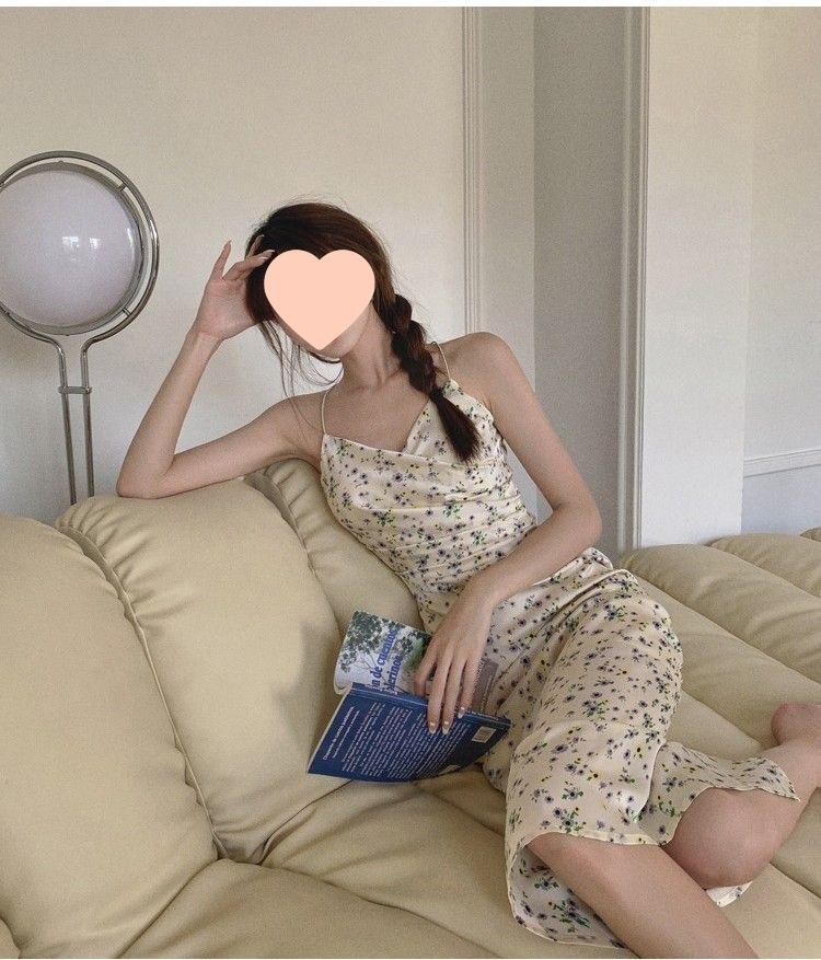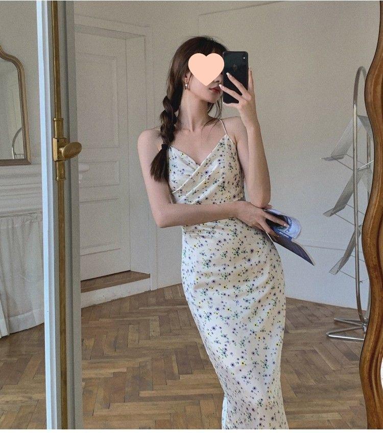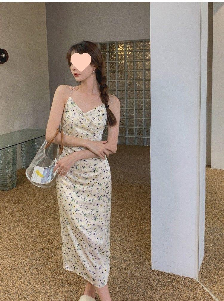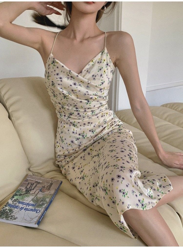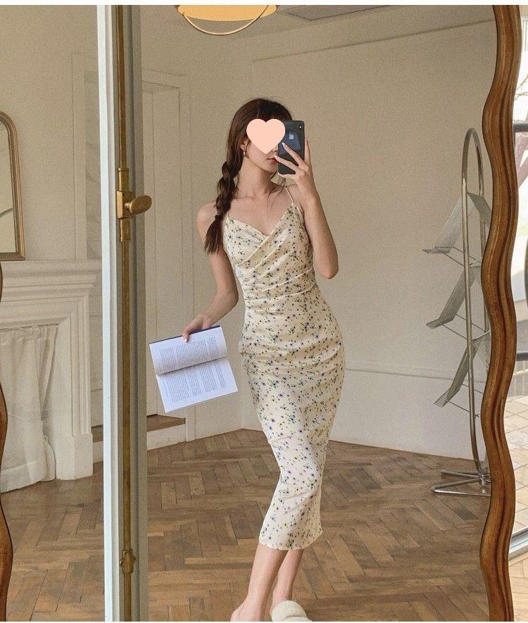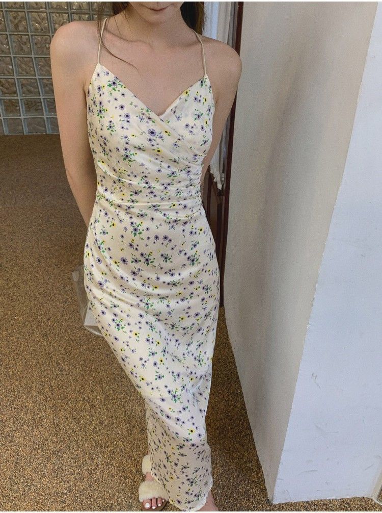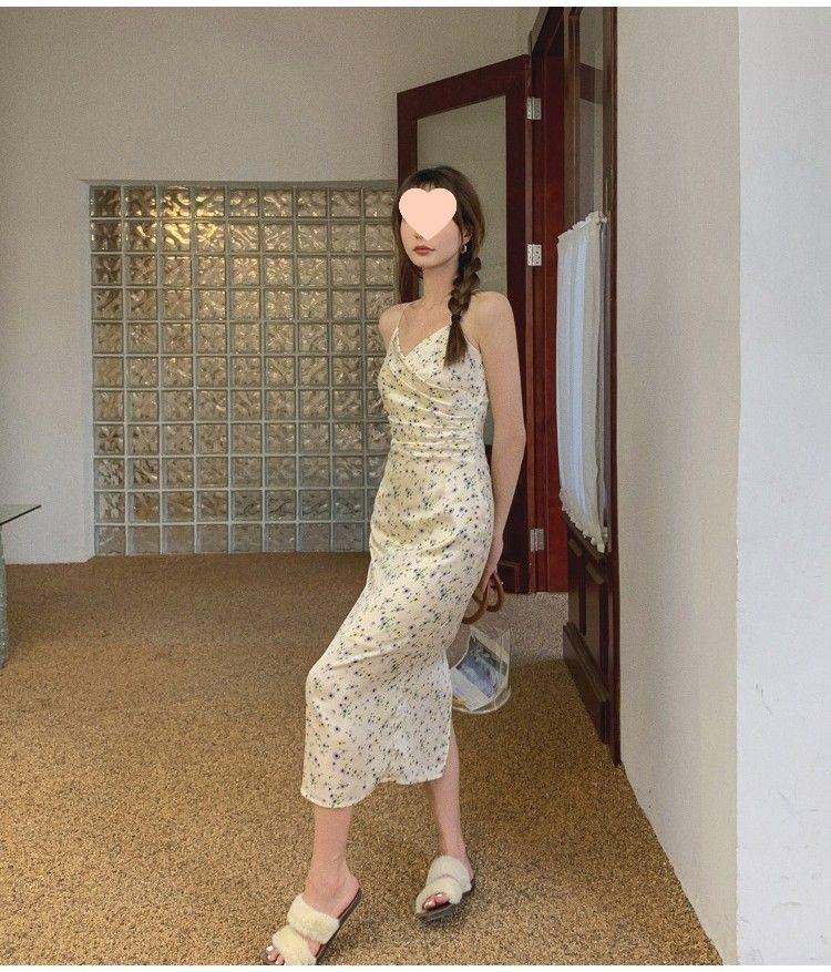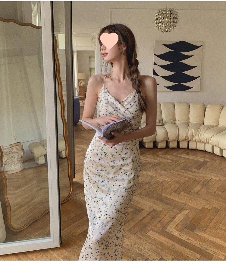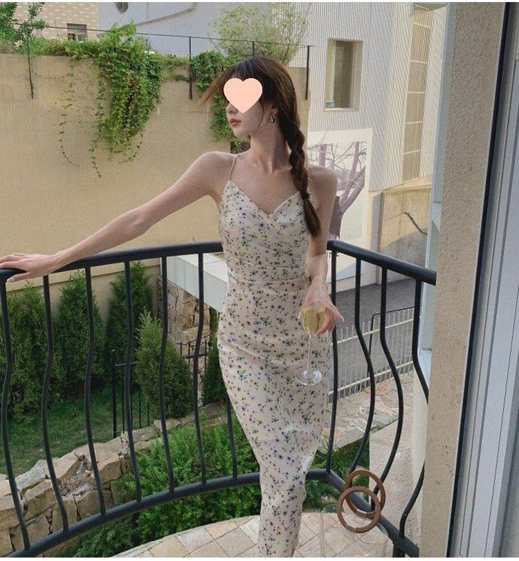 Vestido de tirantes floral de gasa estilo francés para la hora del té para mujer, verano elegante, largo medio, entallado a la cintura, corte ajustado, falda con abertura en la cadera