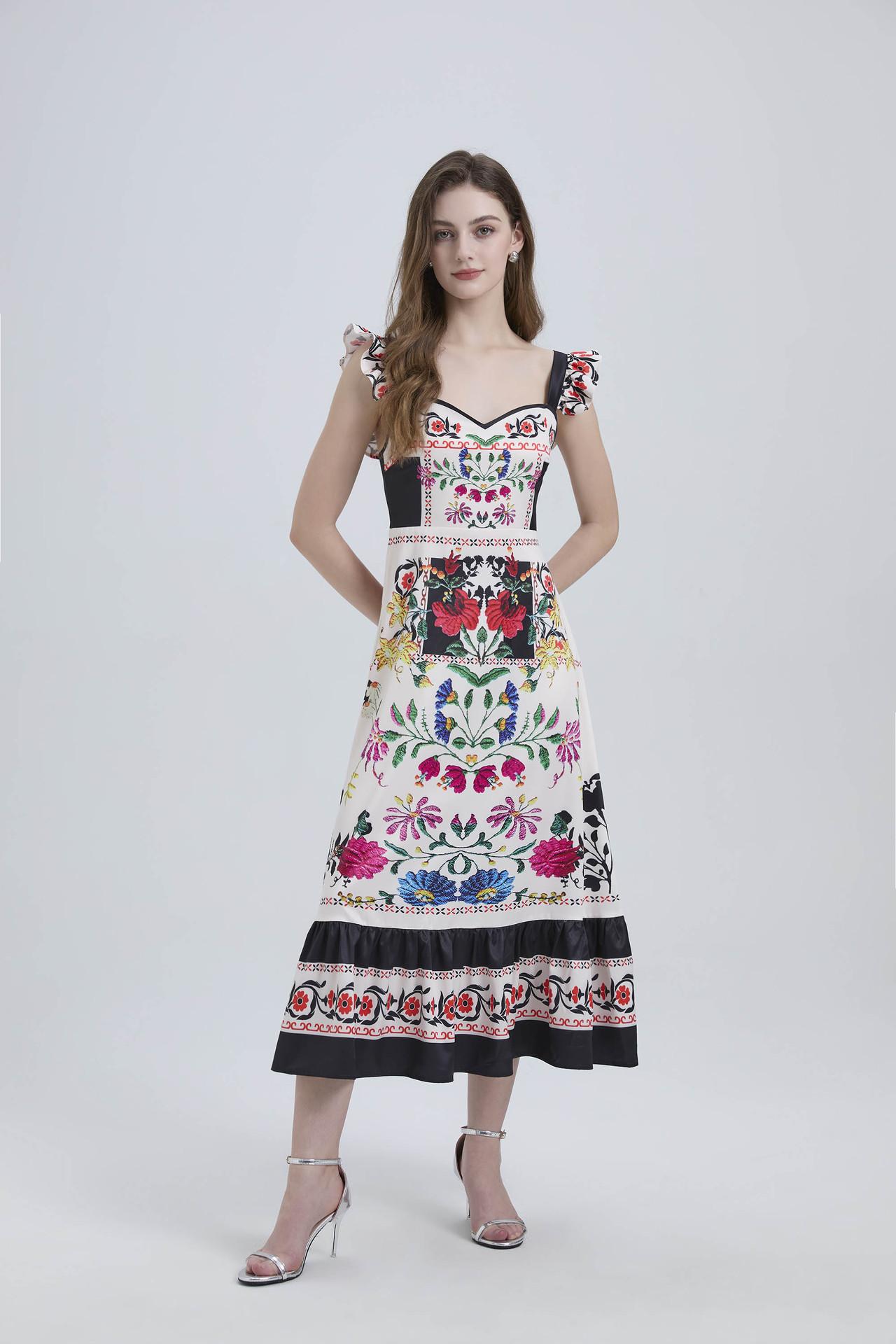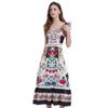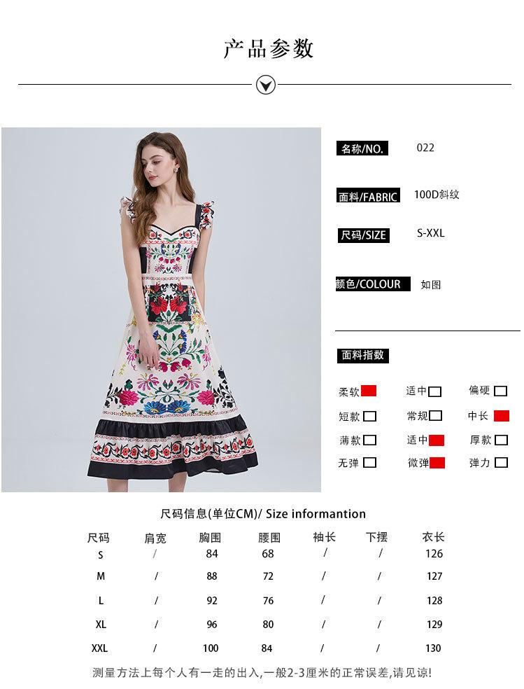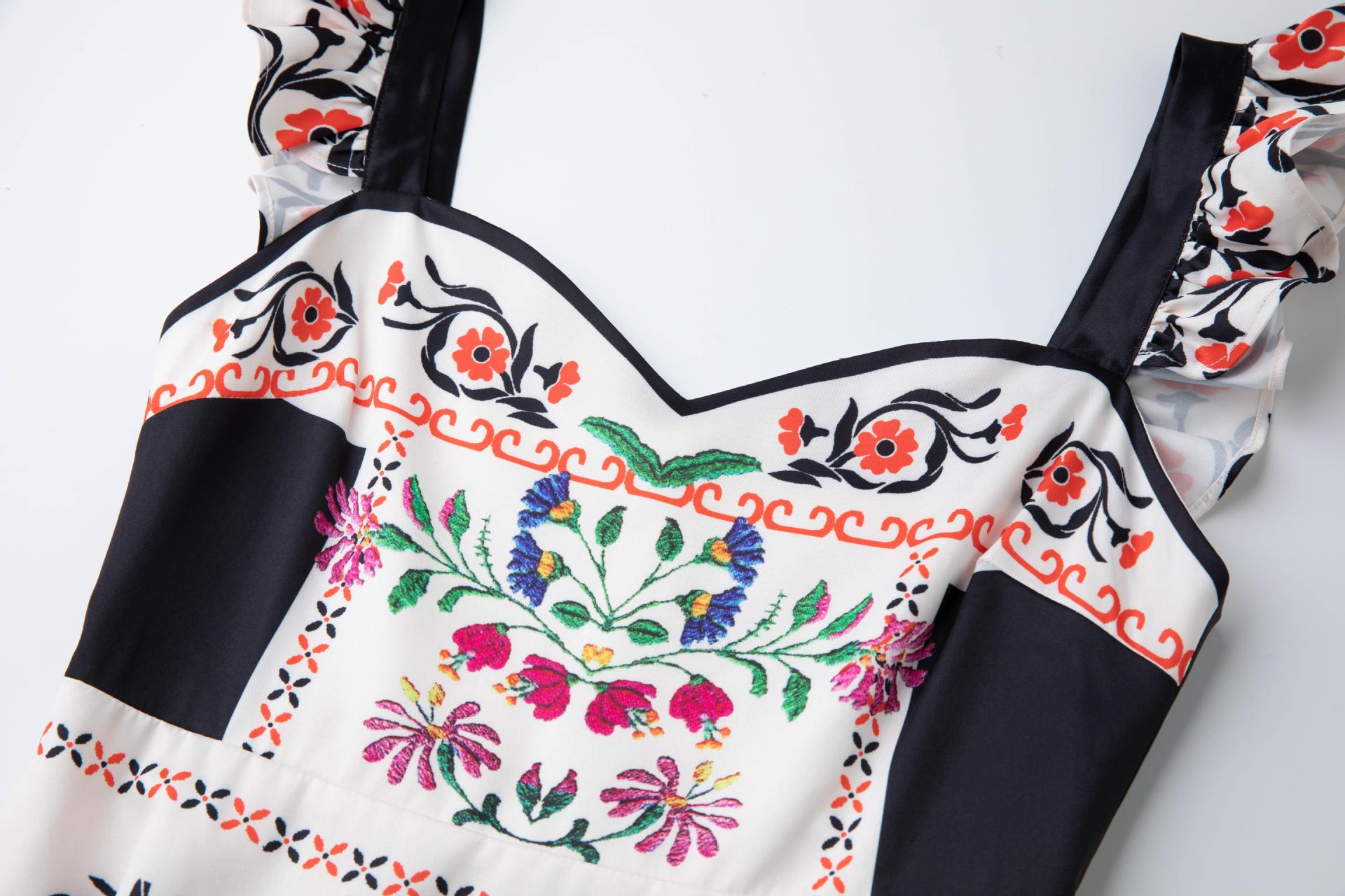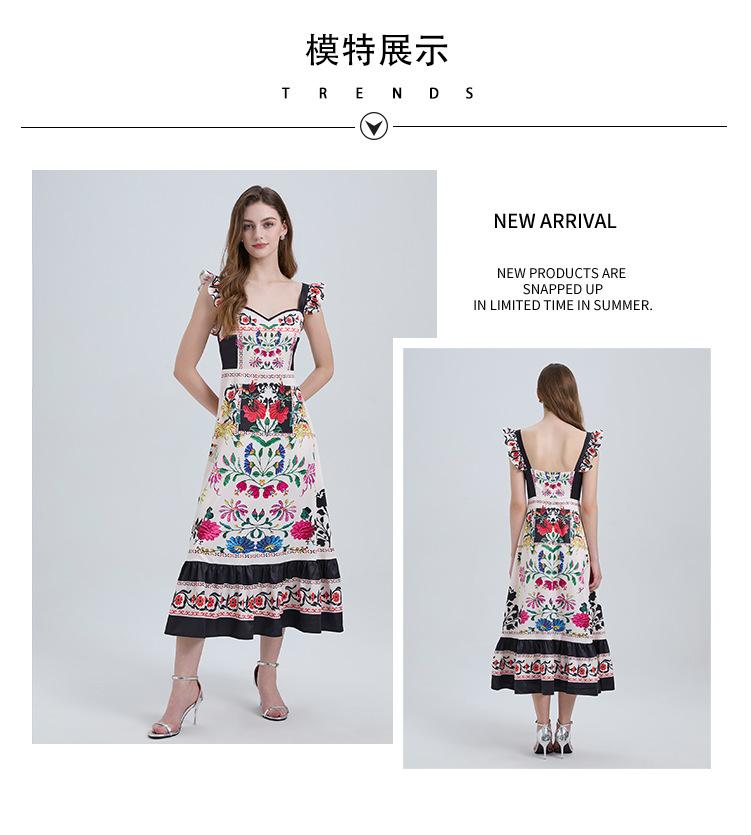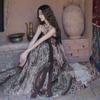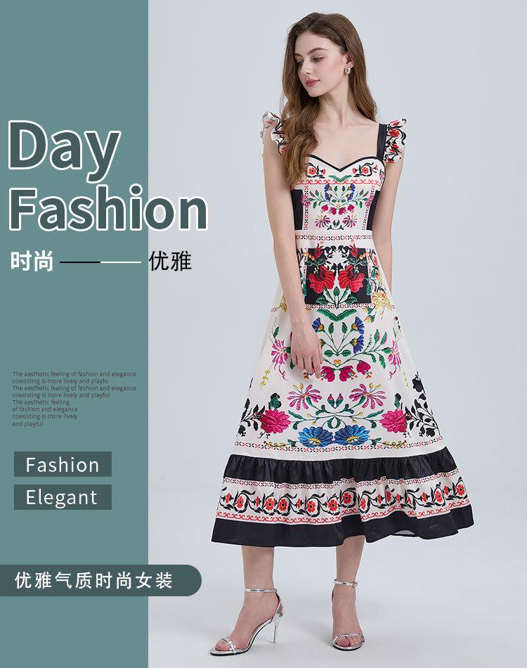 Moda Europea y Americana Nicho Elegante Volantes Tirantes Cintura Alta Dobladillo Grande Posicionamiento Estampado Vestido Línea A