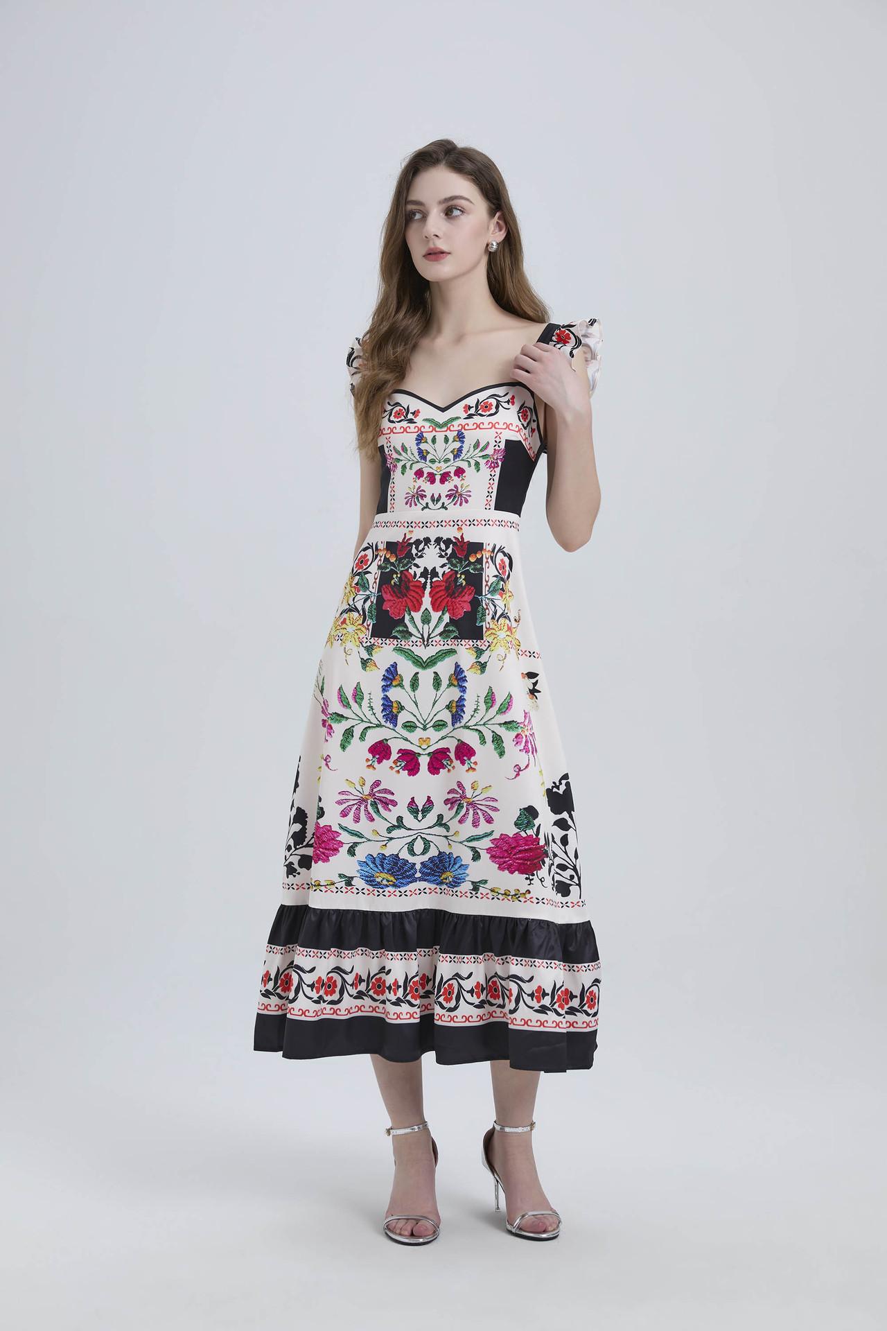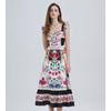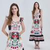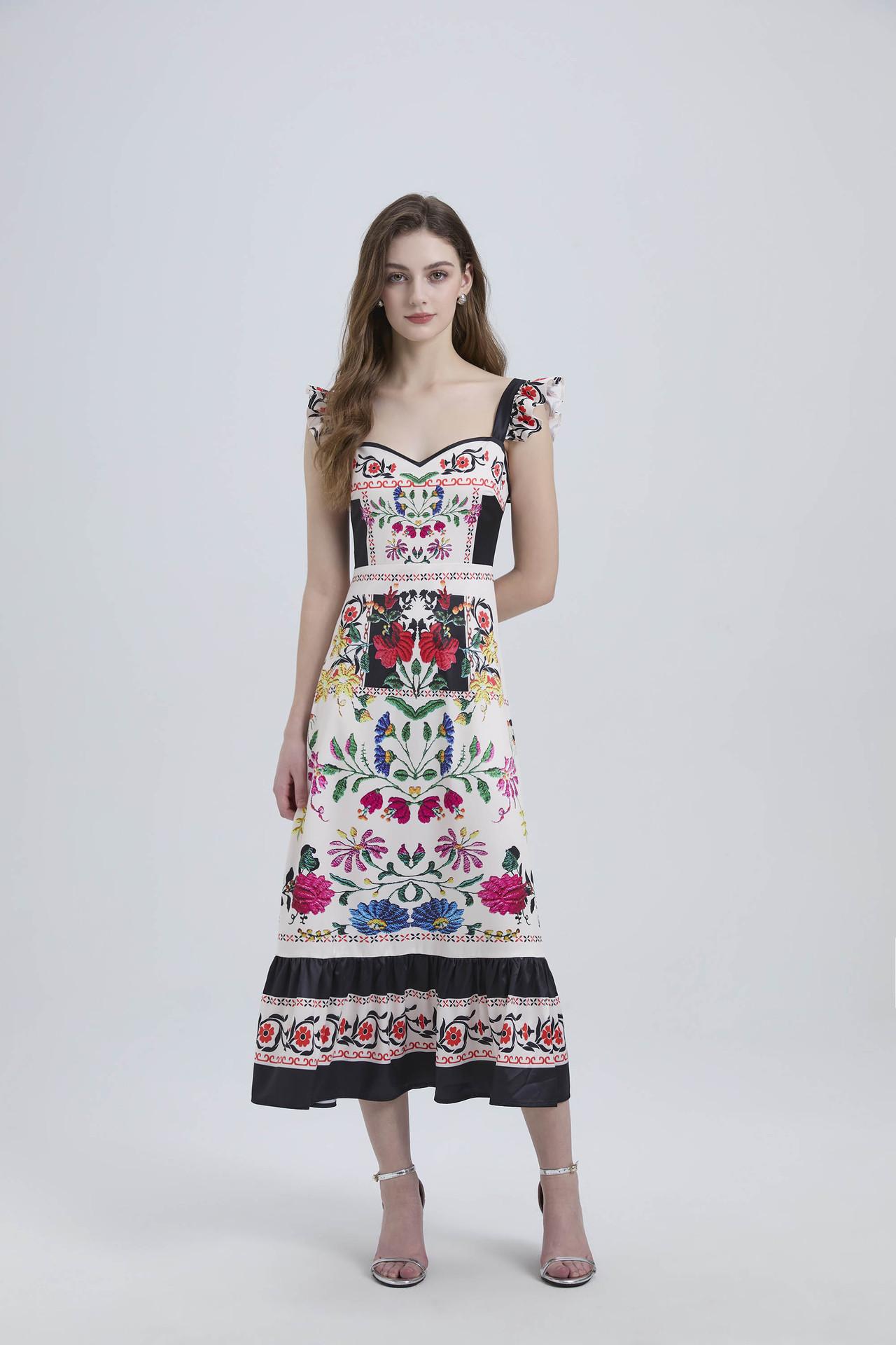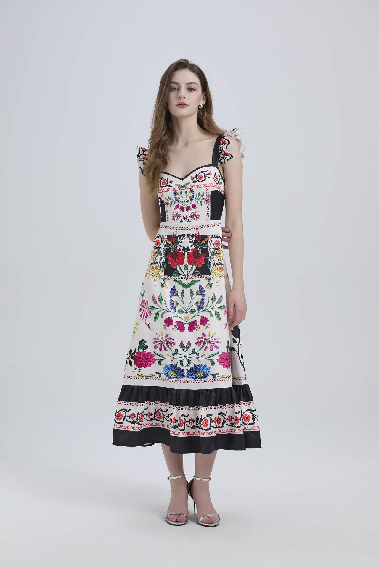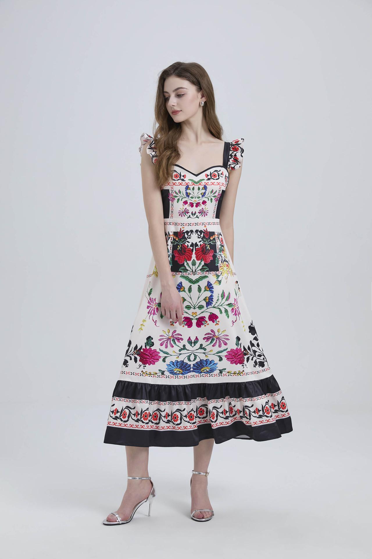 Moda Europea y Americana Nicho Elegante Volantes Tirantes Cintura Alta Dobladillo Grande Posicionamiento Estampado Vestido Línea A