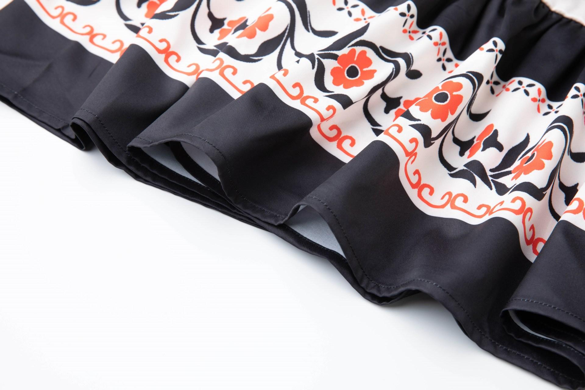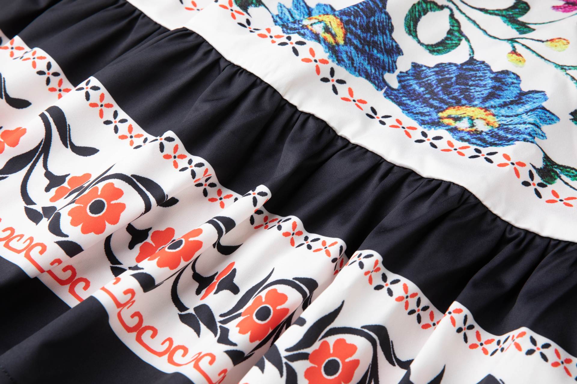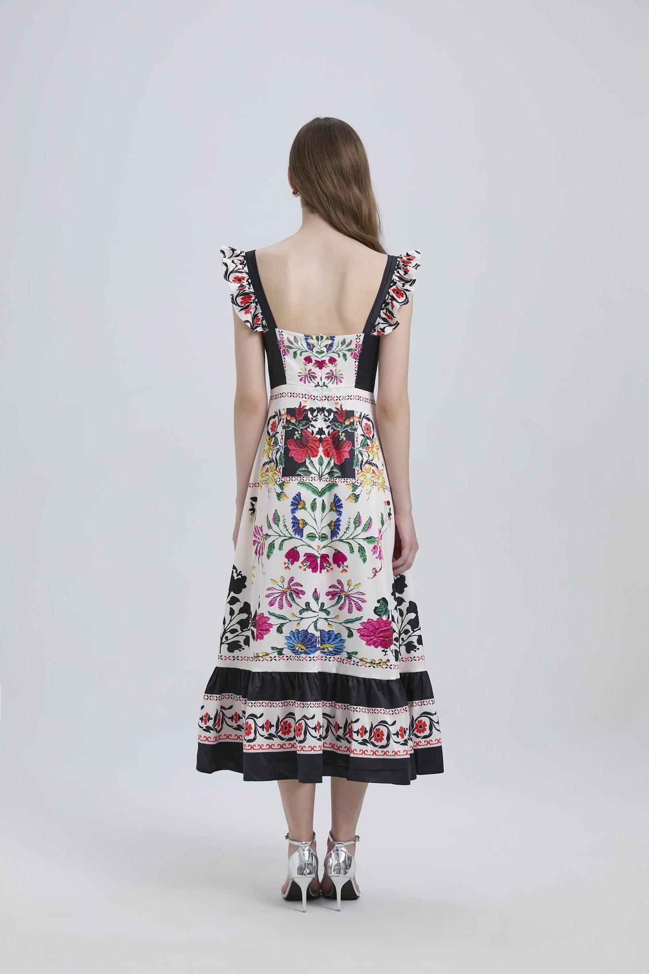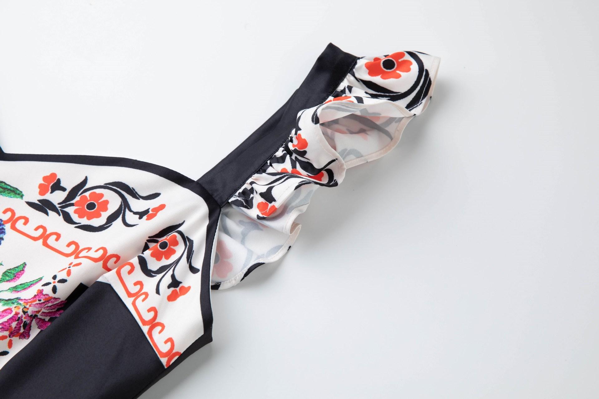 Moda Europea y Americana Nicho Elegante Volantes Tirantes Cintura Alta Dobladillo Grande Posicionamiento Estampado Vestido Línea A