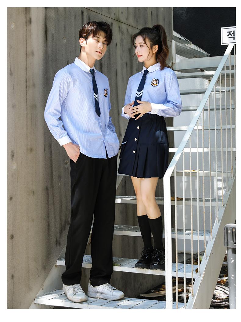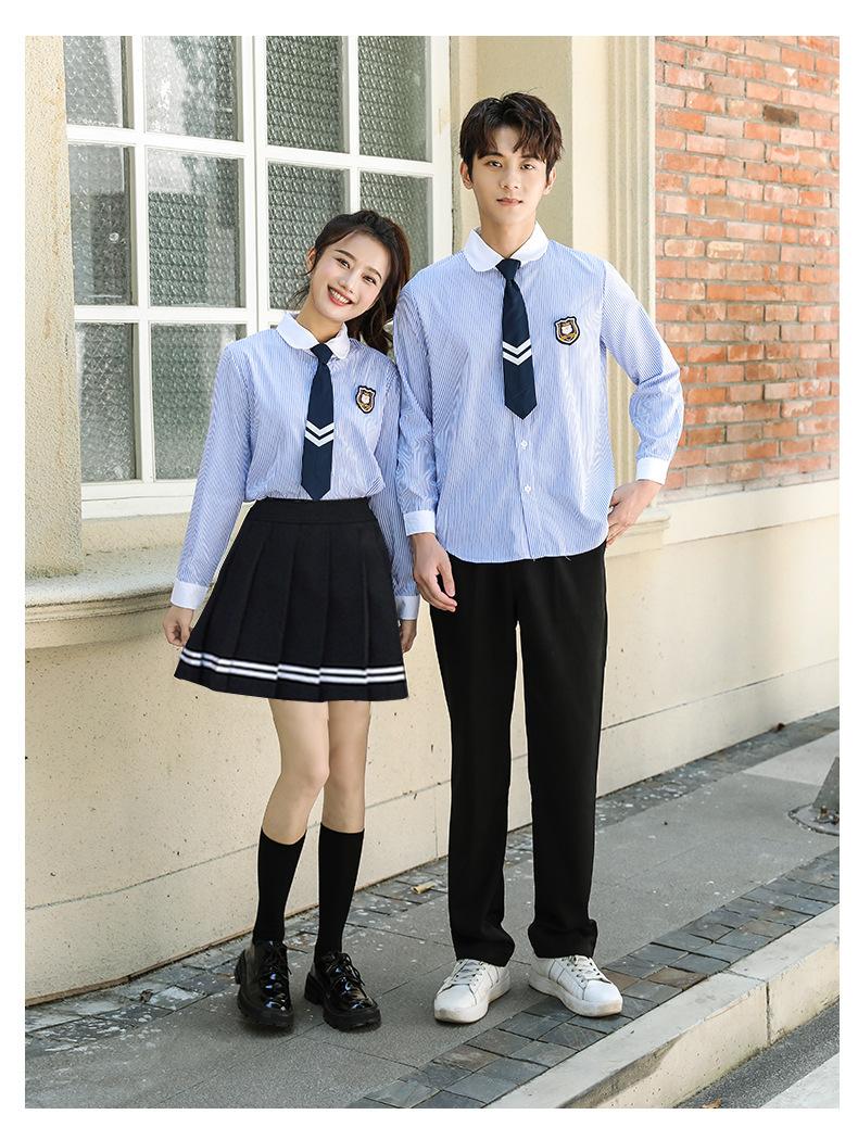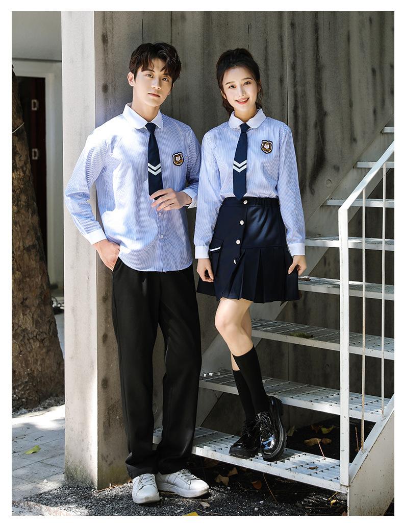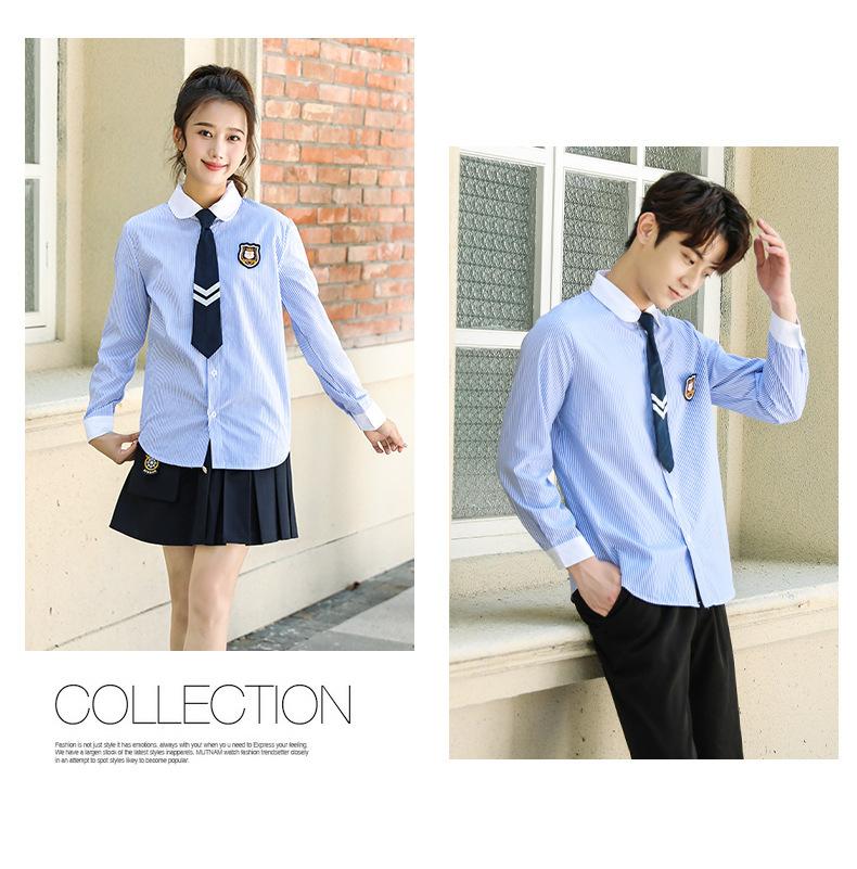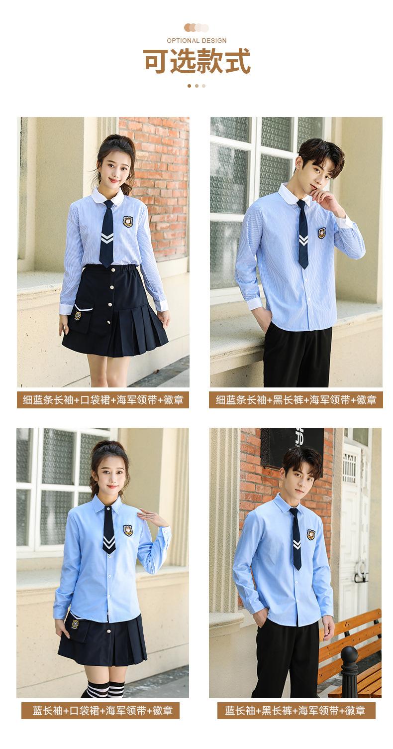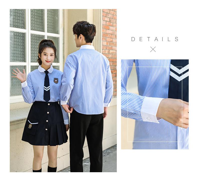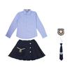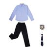 Women's thin blue stripe long sleeve + Pocket Skirt + navy tie + badge, Men's thin blue stripe long sleeve + b...