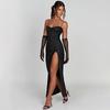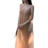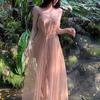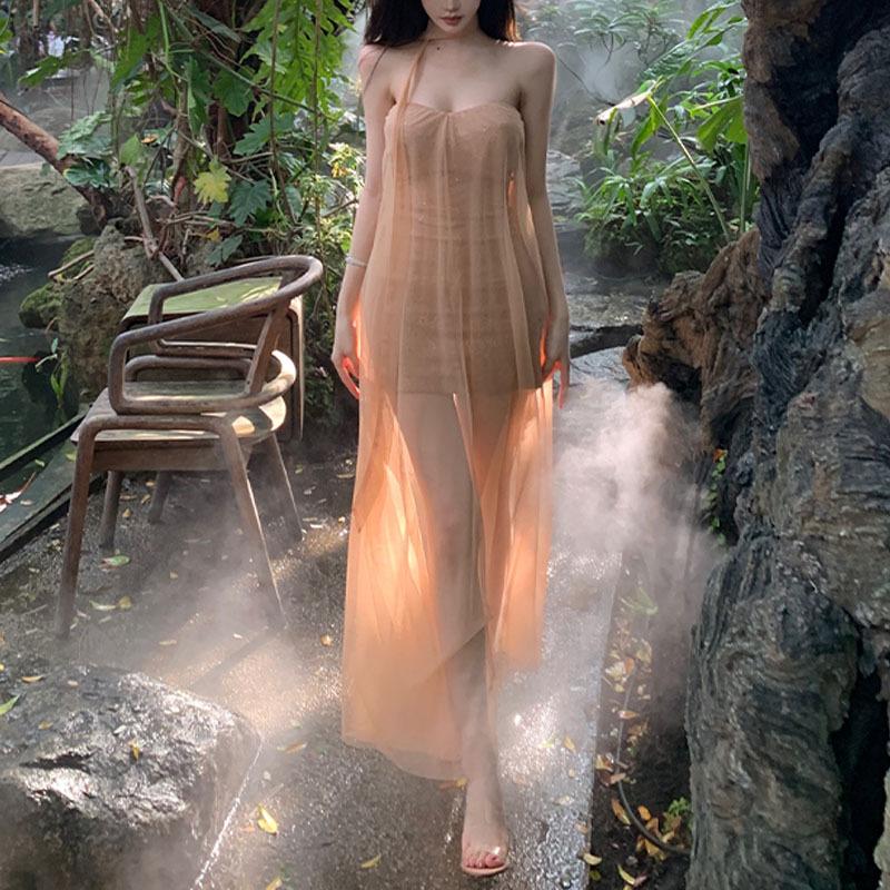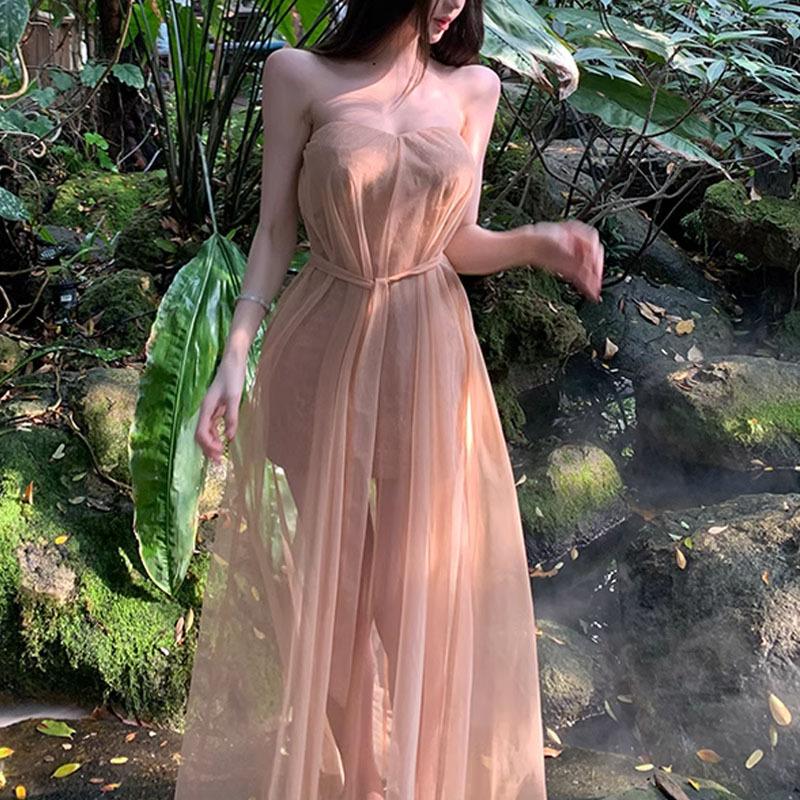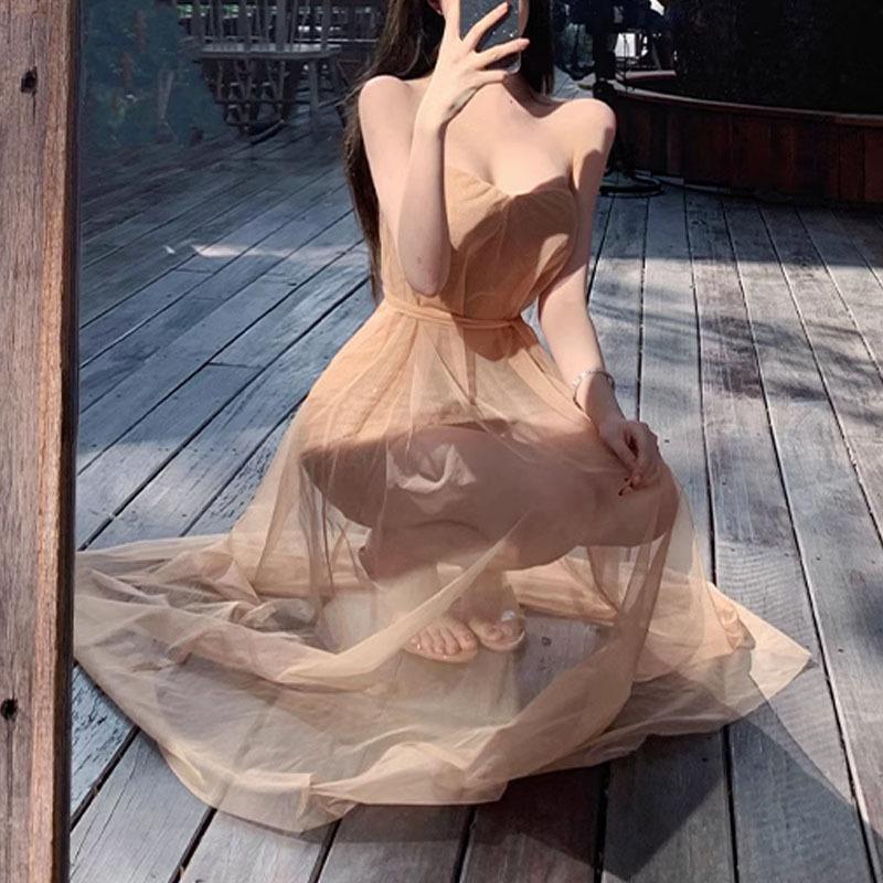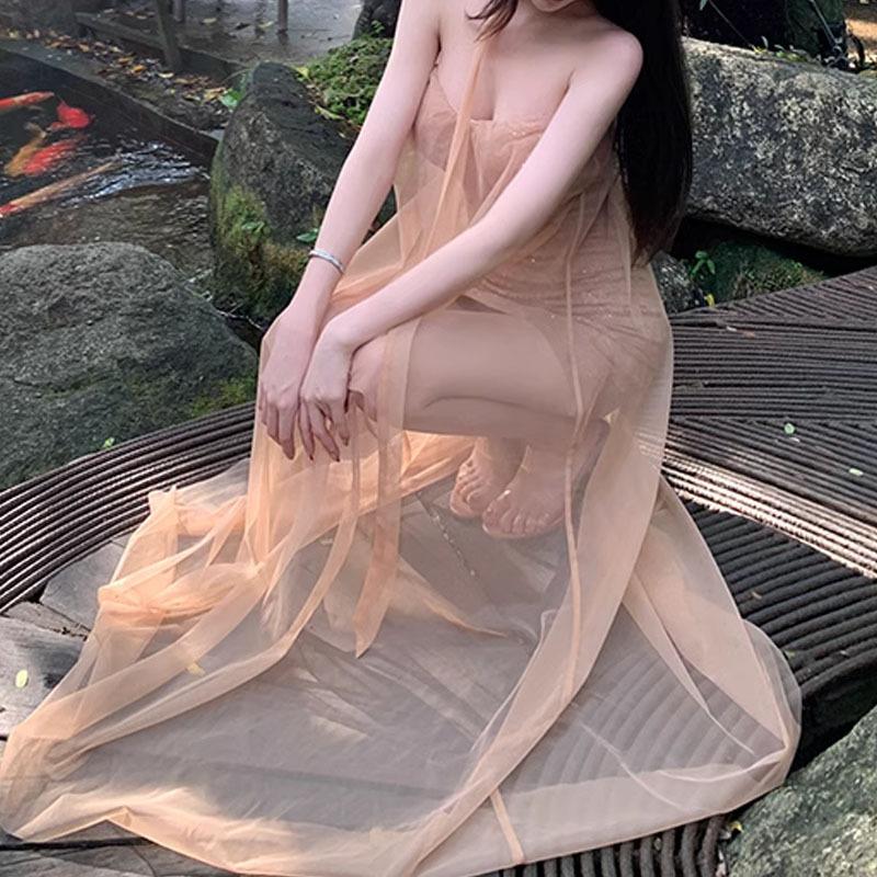 Pian Yanxian Vestido de malla color albaricoque sin tirantes para mujer, estilo sexy de primavera y verano, encaje cosido, vestido de cadera