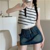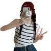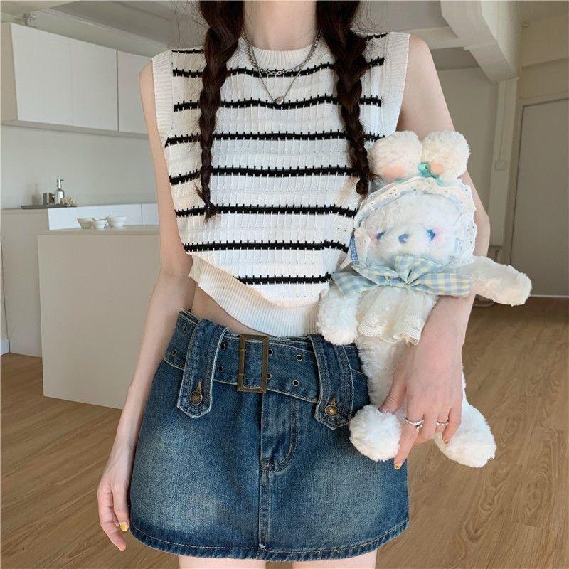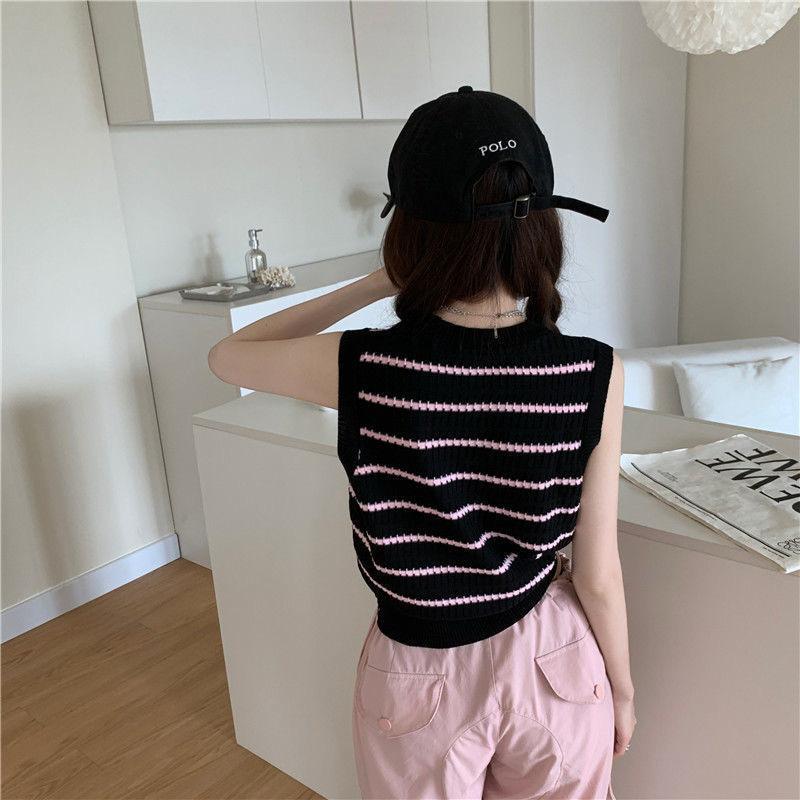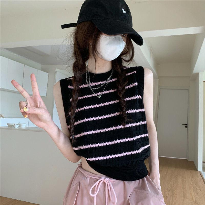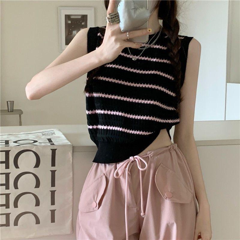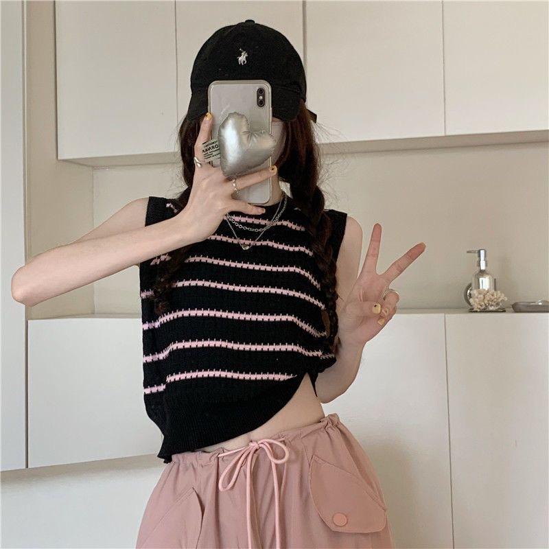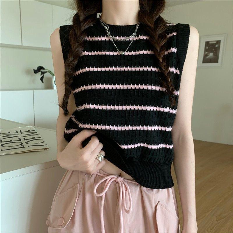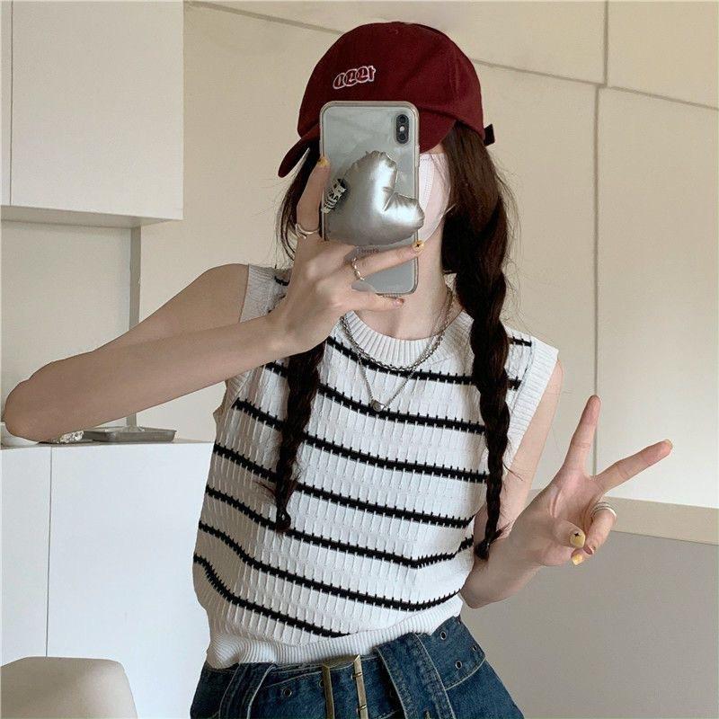 Chaleco de Verano para Mujer Nuevo Estilo Coreano Diseño Versátil Color Nicho Rayado Ajustado Adelgazante Sin Mangas Top de Punto