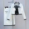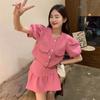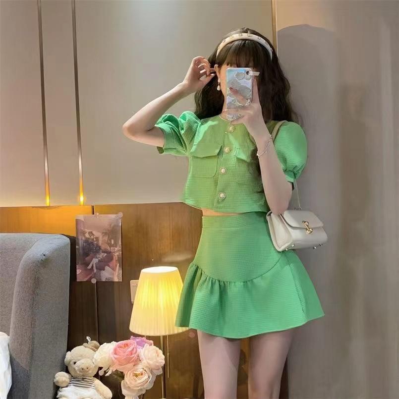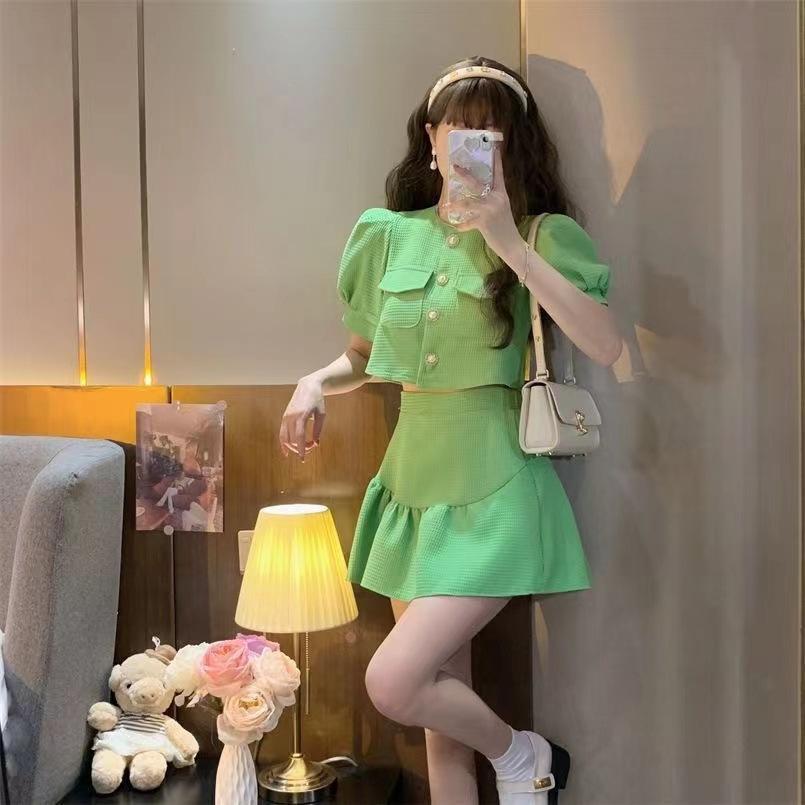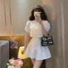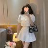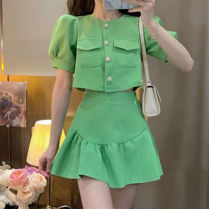 Traje estilo Chanel para mujer, verano elegante, nuevo top de camisa de manga abullonada de socialité, falda plisada de cintura alta, conjunto de dos piezas