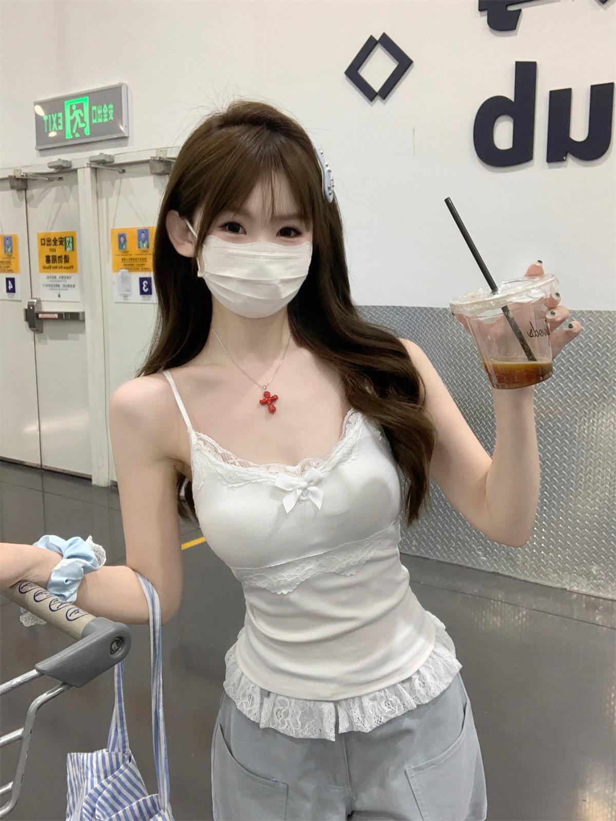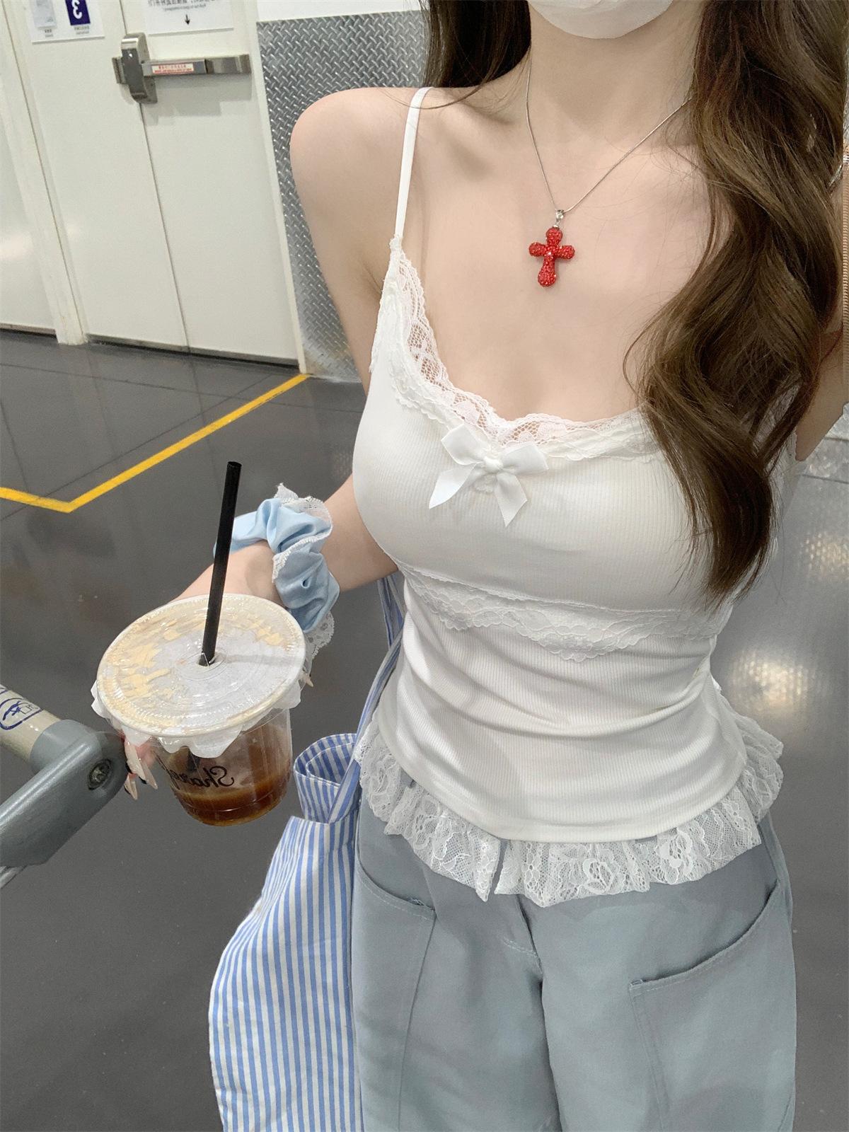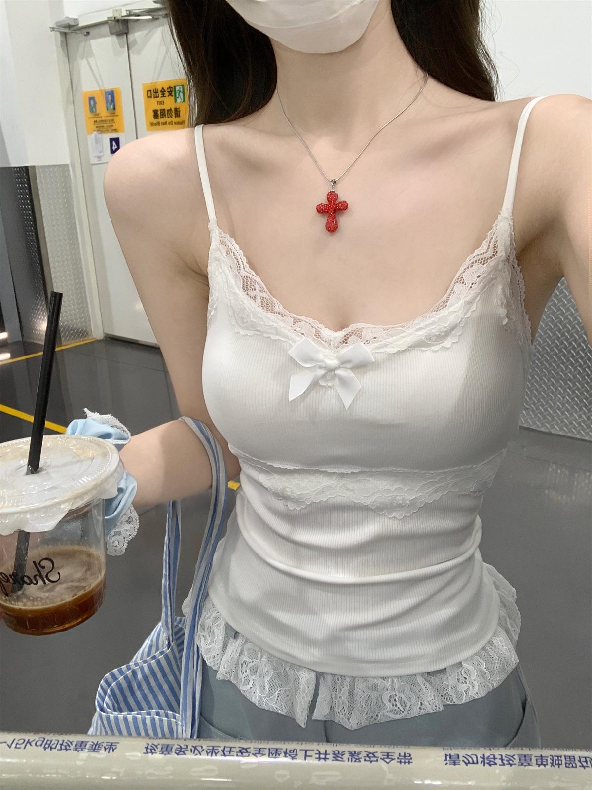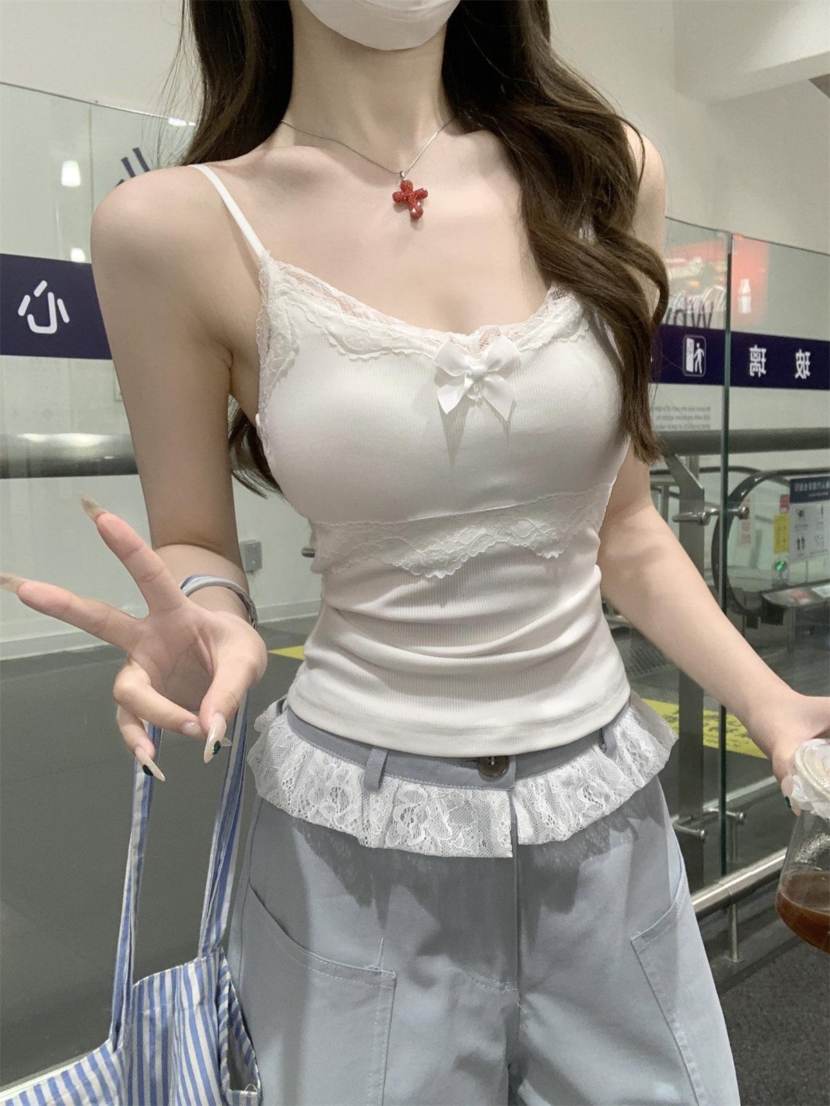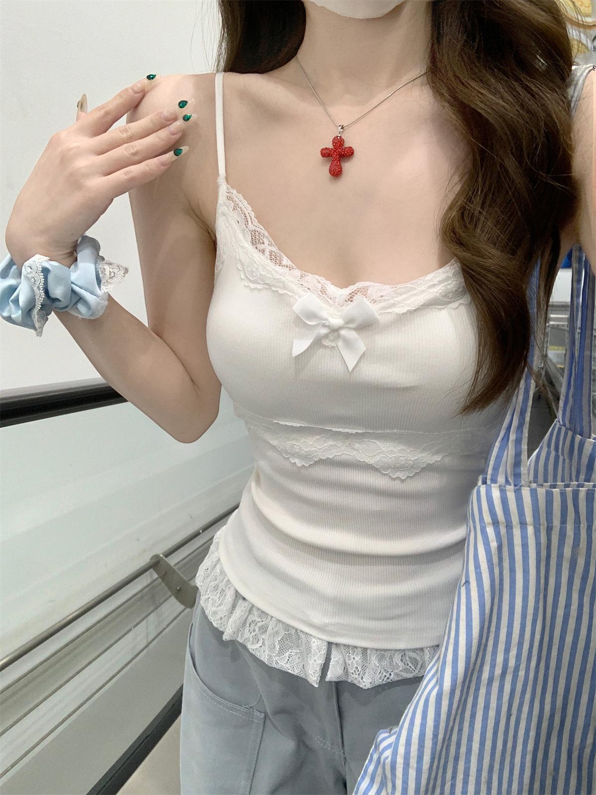 Francés 2025 Verano Estilo Coreano Deseo Puro Slim Costuras de Lazo Encaje Dulce Camiseta Interior de Tirantes