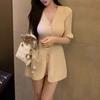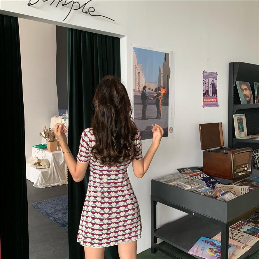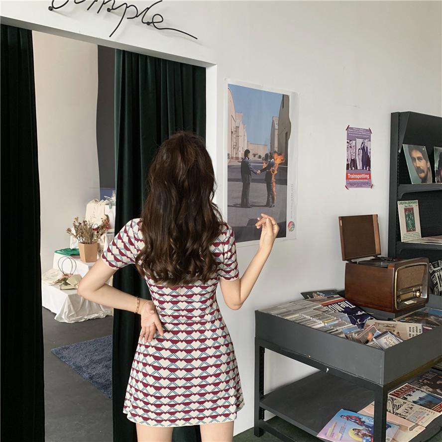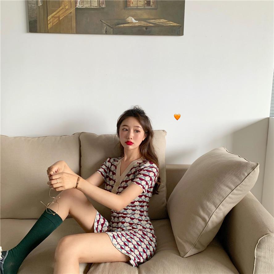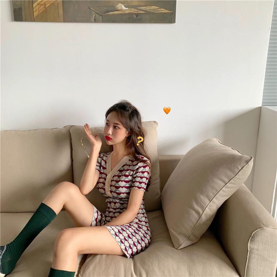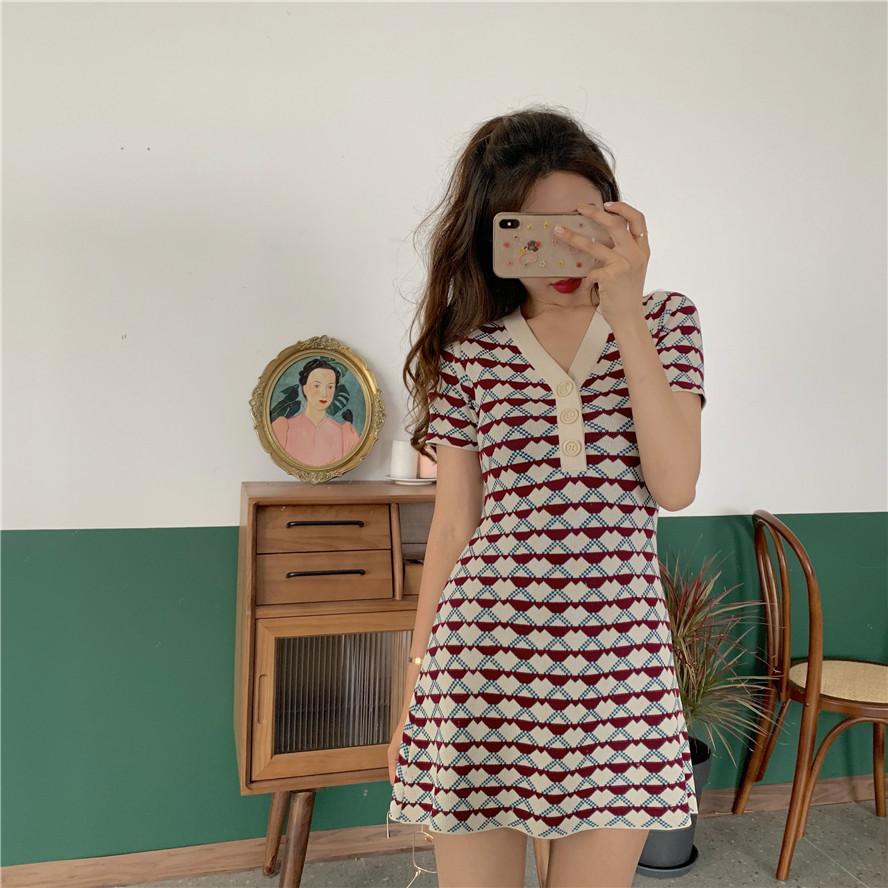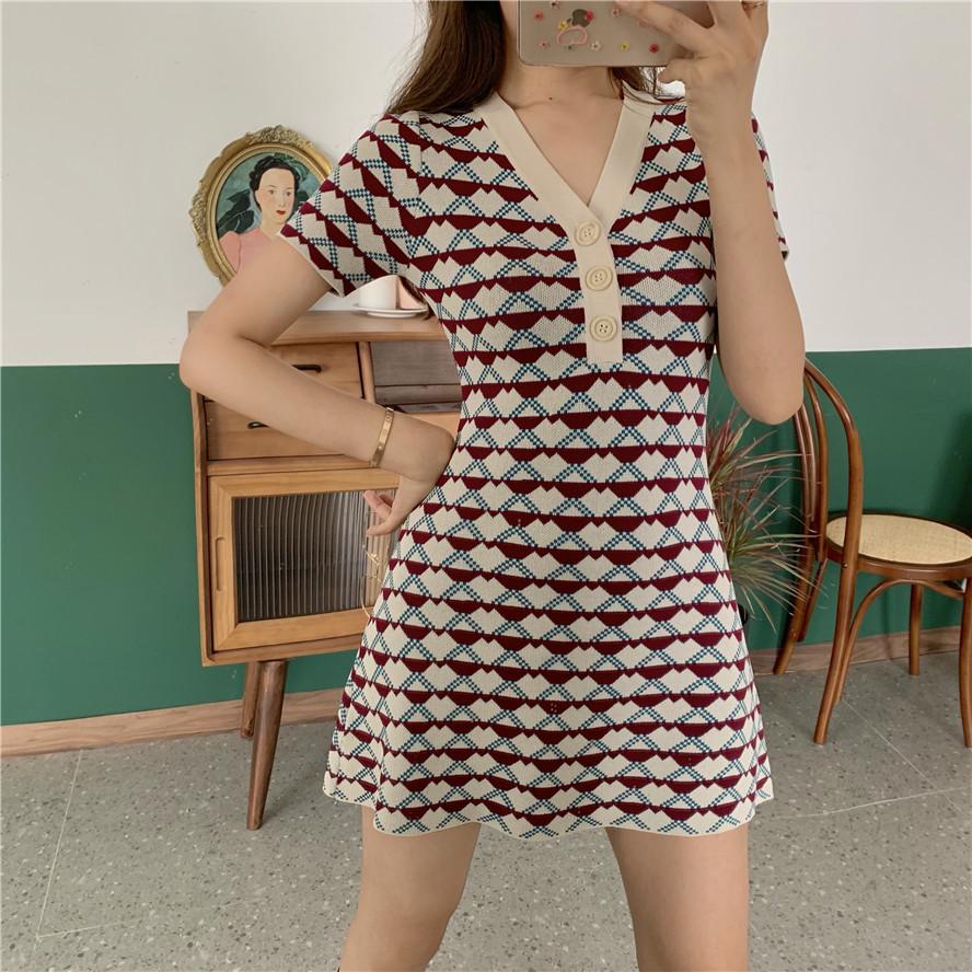Vestido de Punto de Manga Corta Delgado y Elegante para Mujer Cuello en V Delgado Cintura Alta Falda Corta Verano y Otoño 2024 Nuevo Falda Línea A