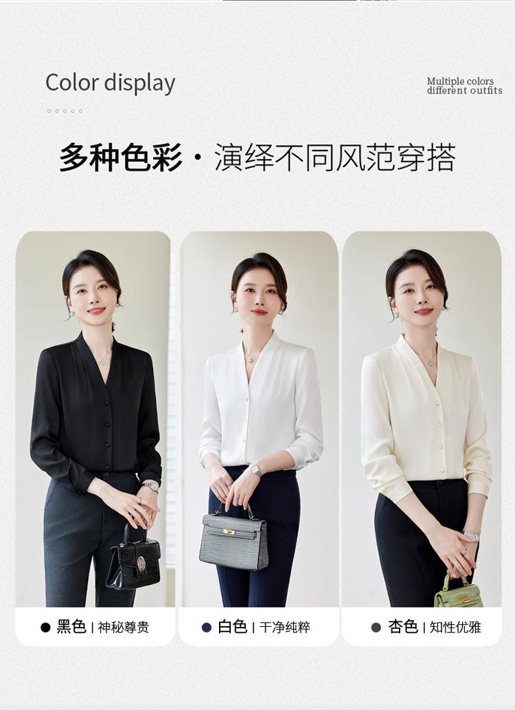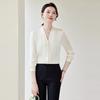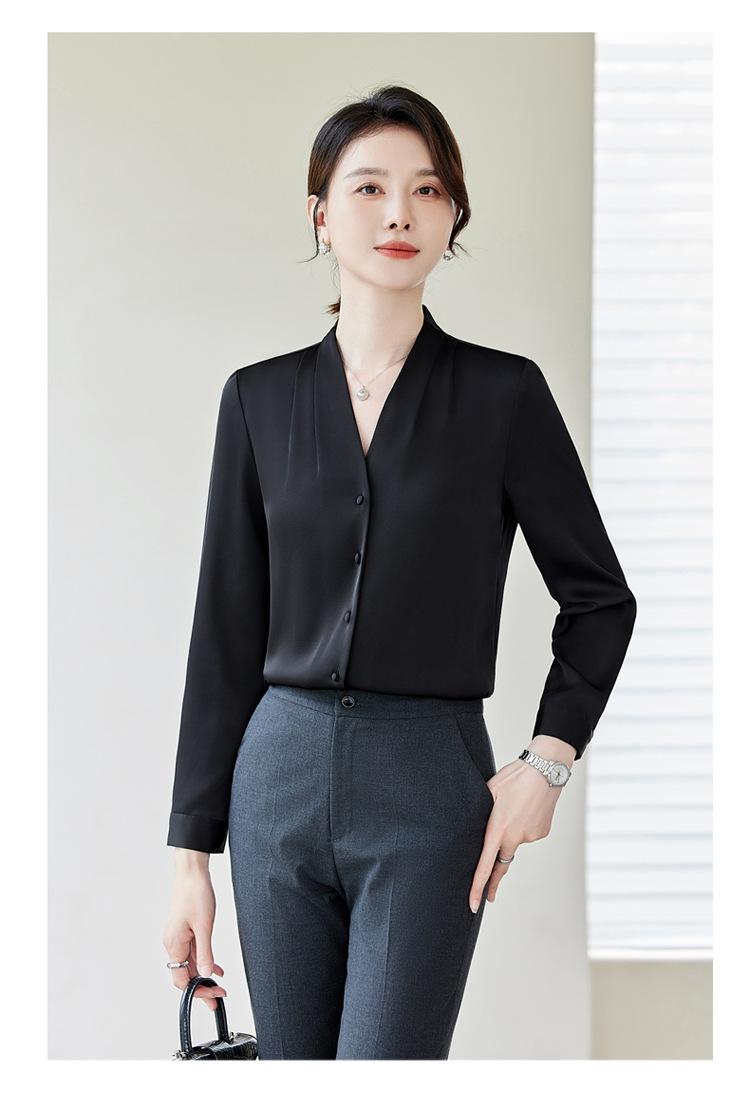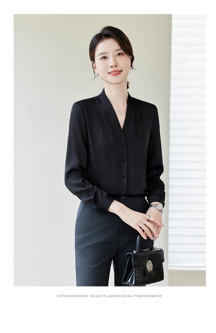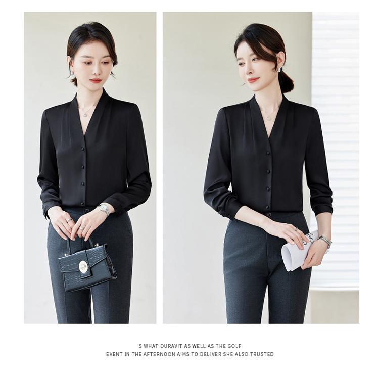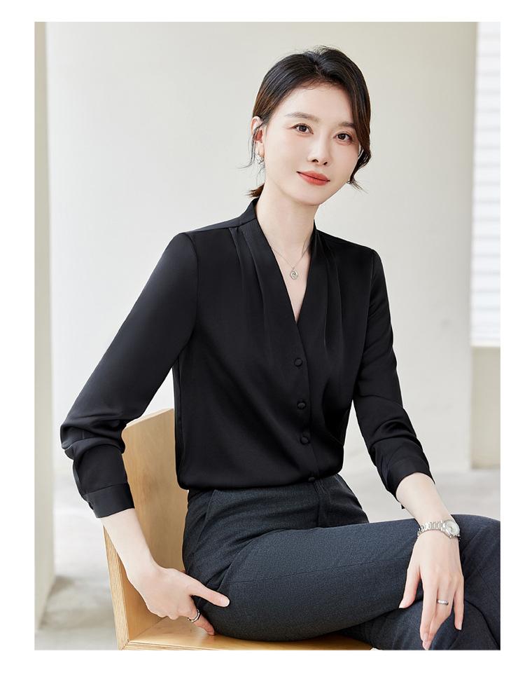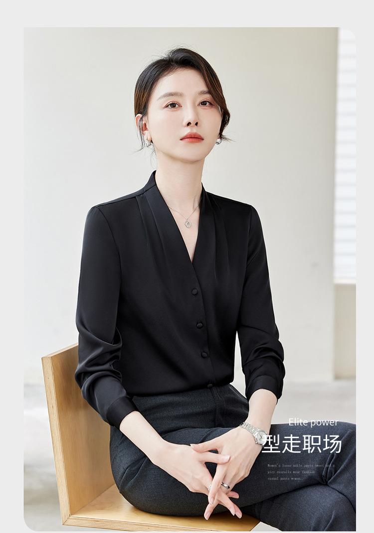 Venta al por mayor Otoño Nuevo Chifón Elegante Ropa de Trabajo Cuello en V con Camisa Cuello en V Entrevista Profesional Camisa Negra Mangas Largas para Mujer