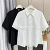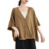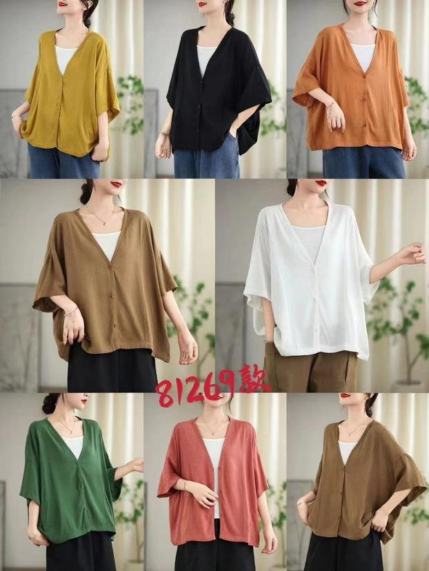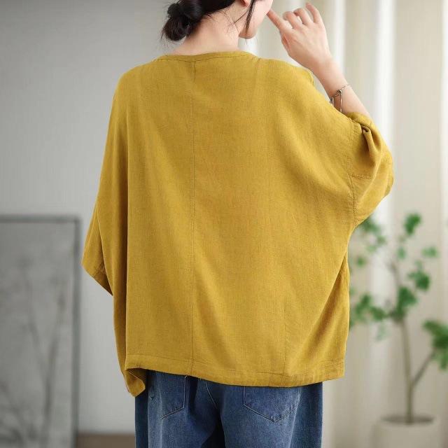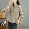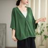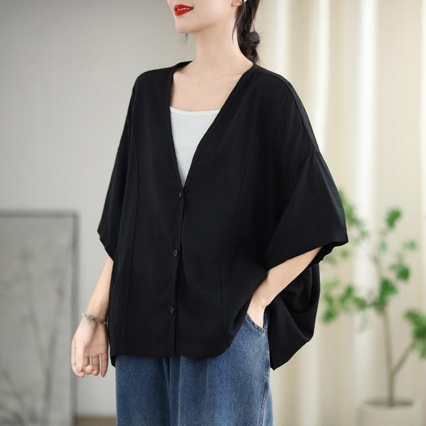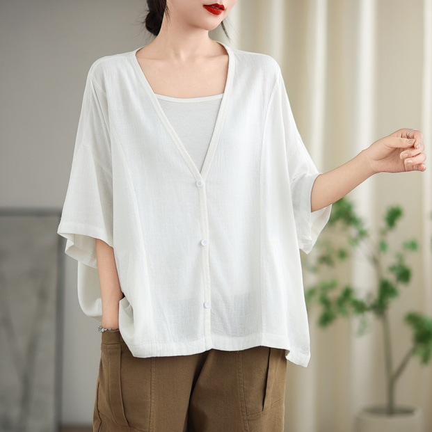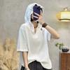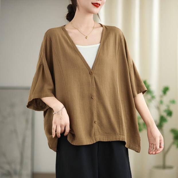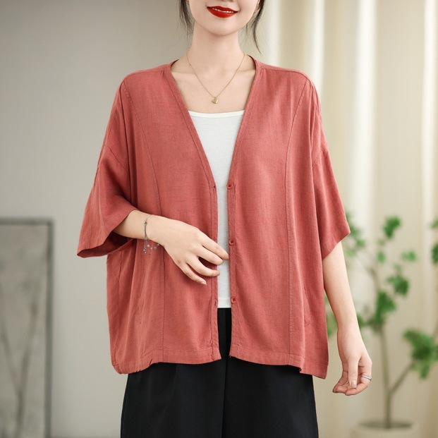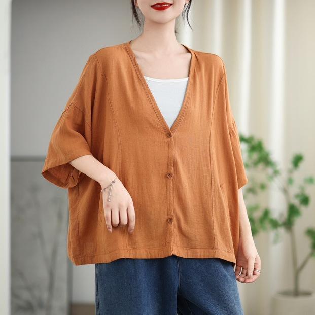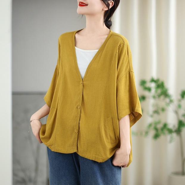 Primavera y Verano 2025 Nuevo Diseño de Camisa Holgada de Talla Grande Sentido Artístico Cáñamo Manga Corta Cárdigan Pequeño Top Combinable para Mujer