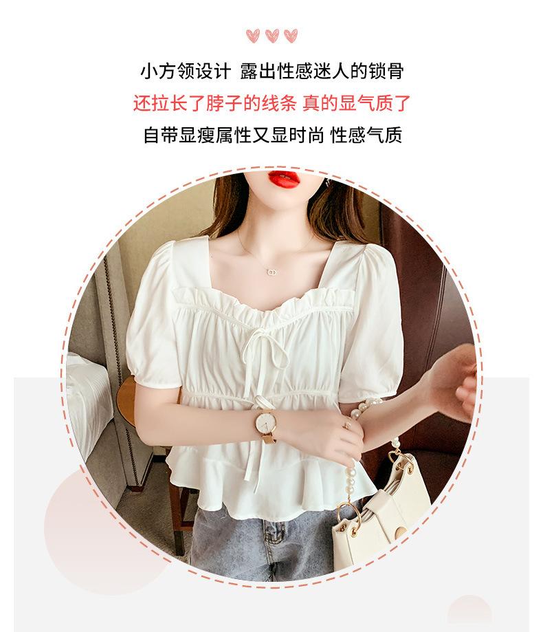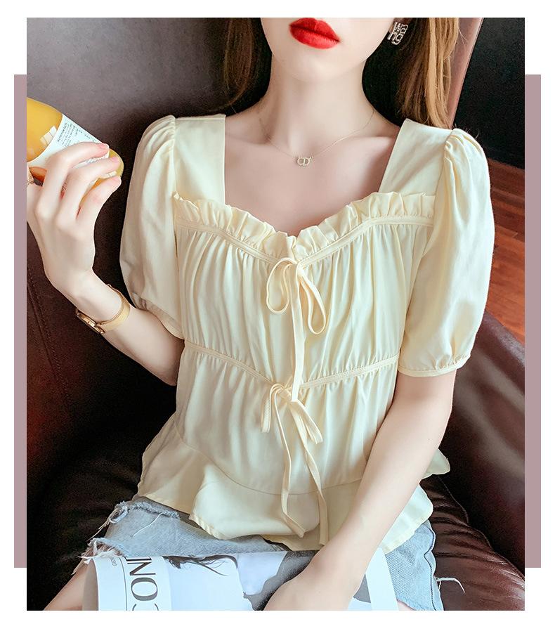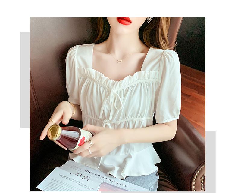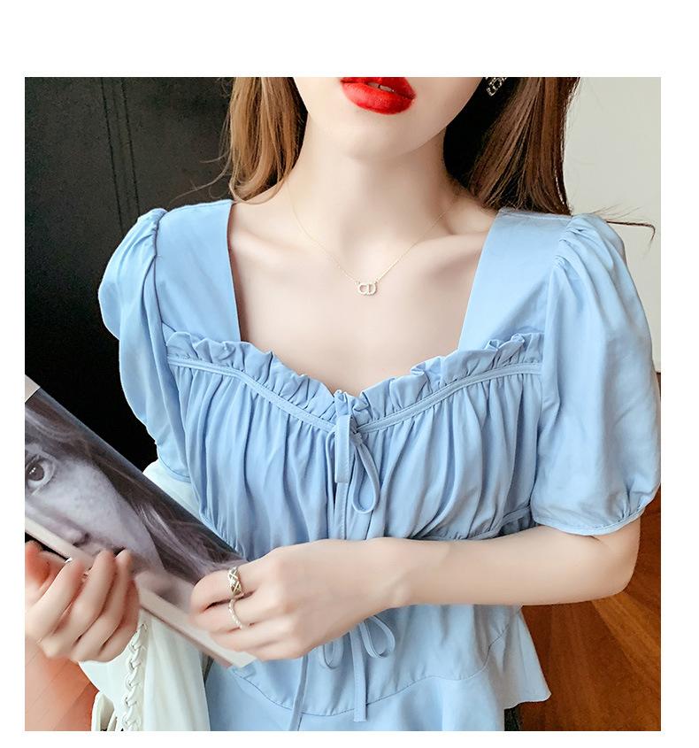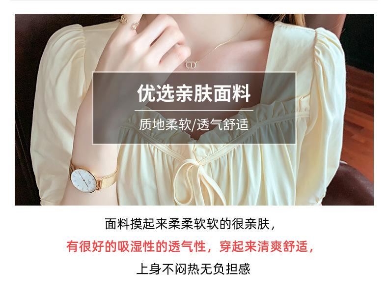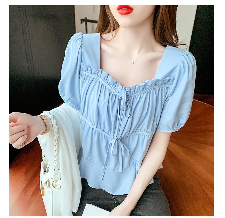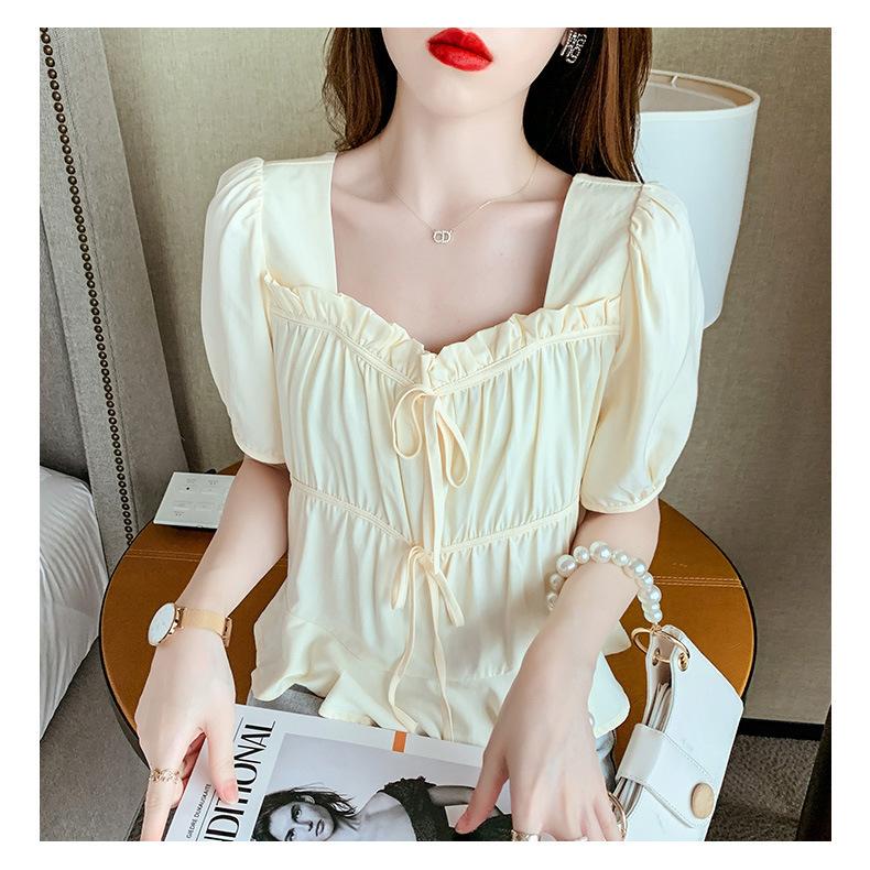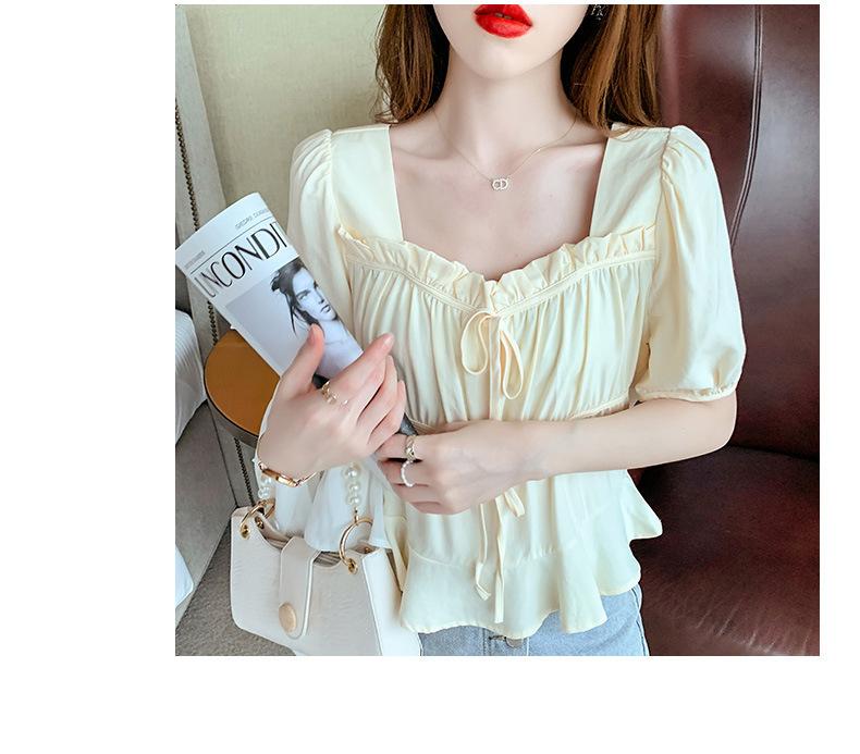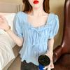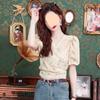 Camisa de gasa francesa con cuello cuadrado y mangas abullonadas de tiro real para mujer, diseño de verano de manga corta, camisa de gasa de cintura alta con tendencia