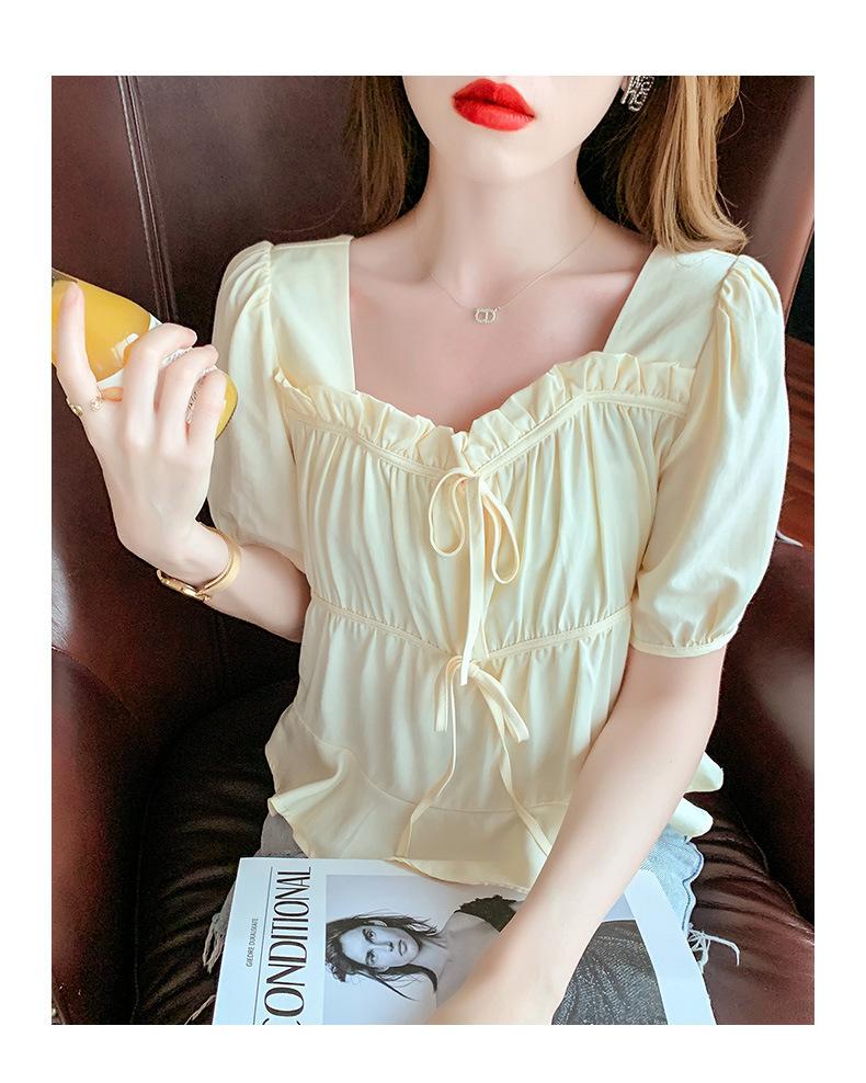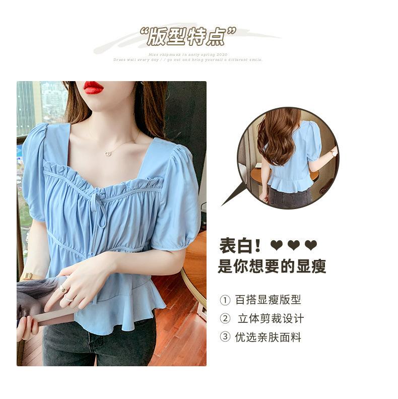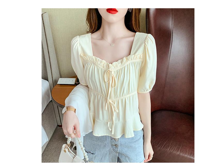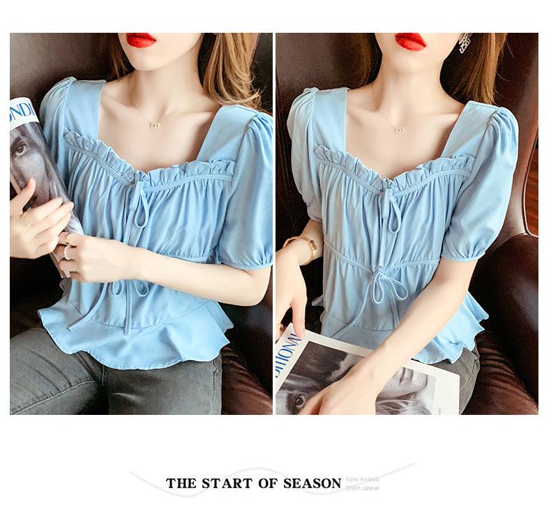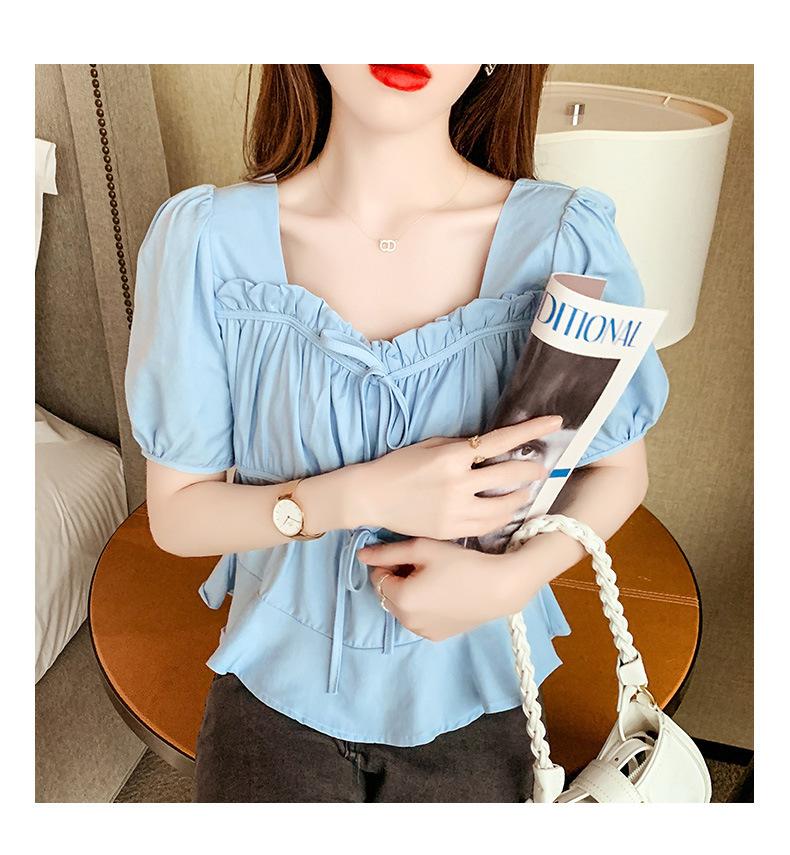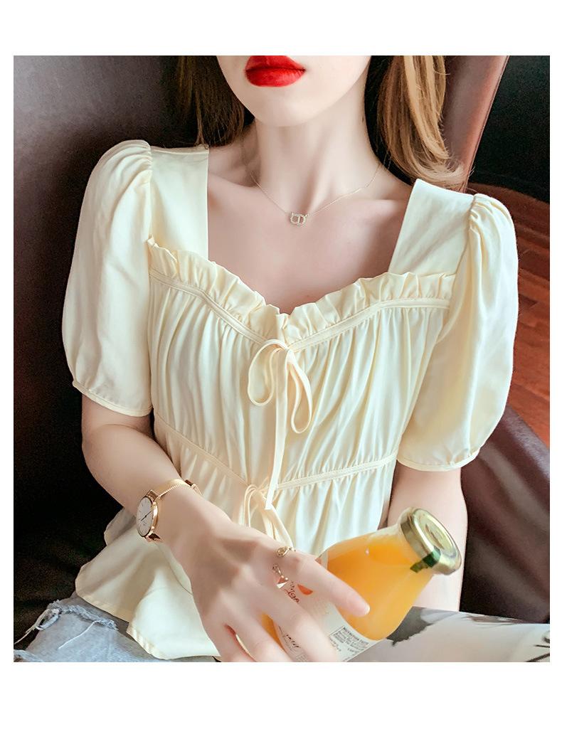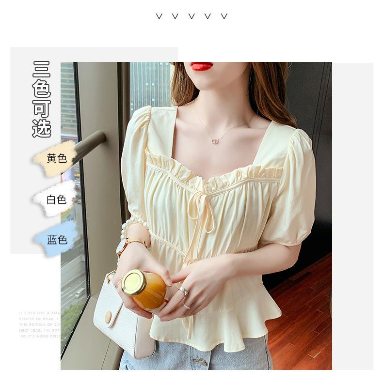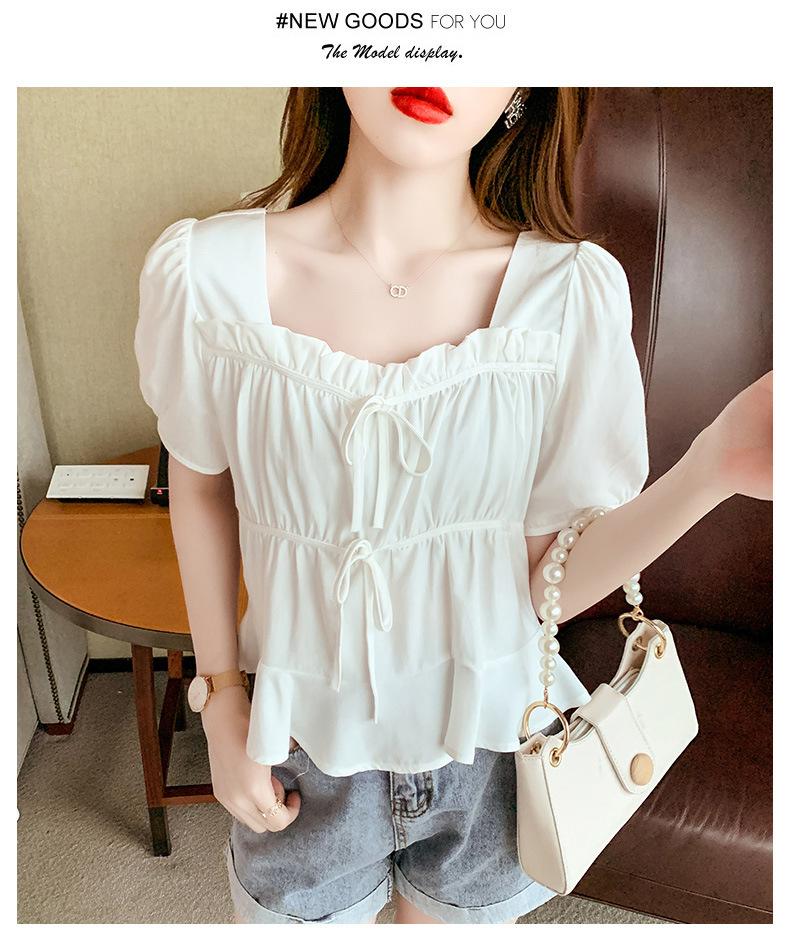 Camisa de gasa francesa con cuello cuadrado y mangas abullonadas de tiro real para mujer, diseño de verano de manga corta, camisa de gasa de cintura alta con tendencia