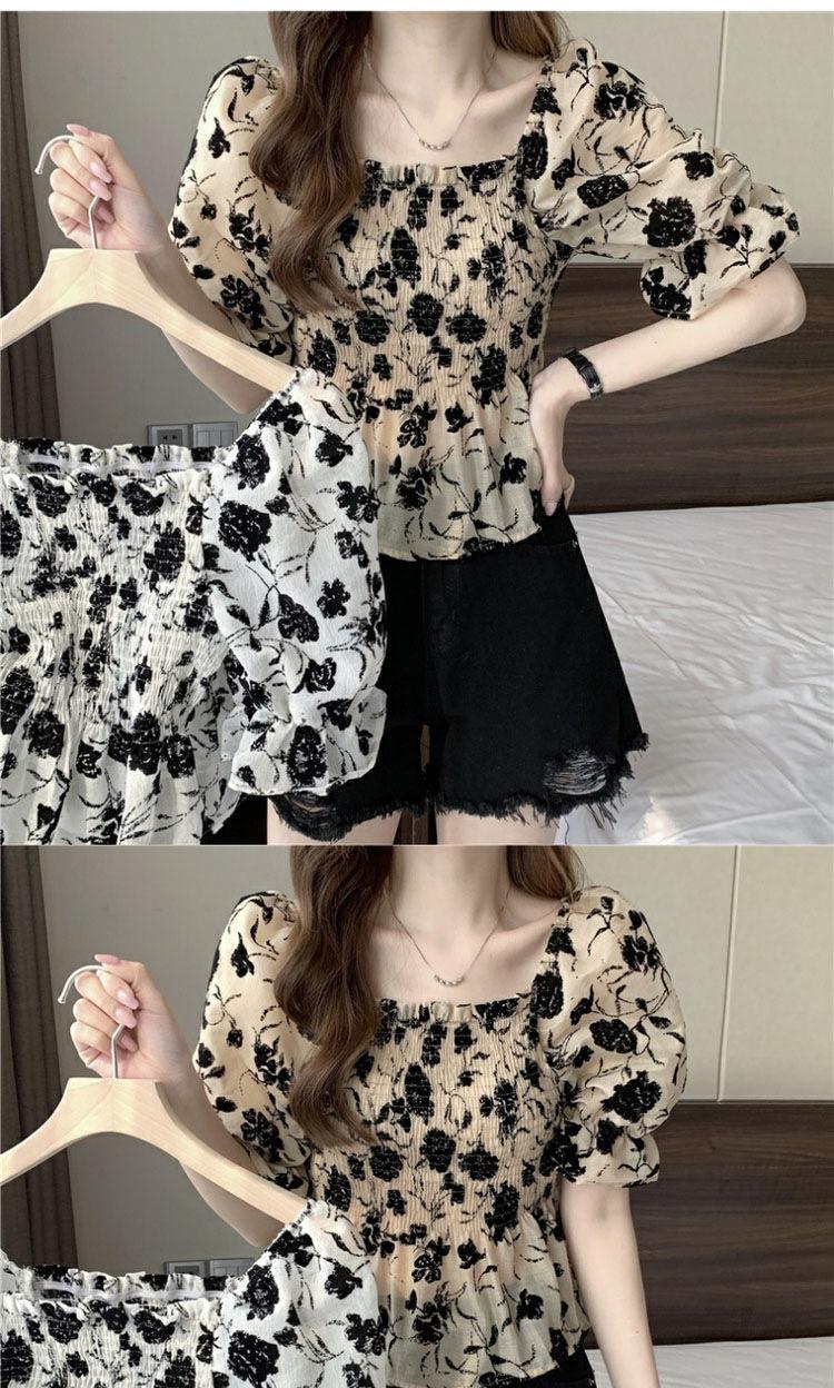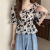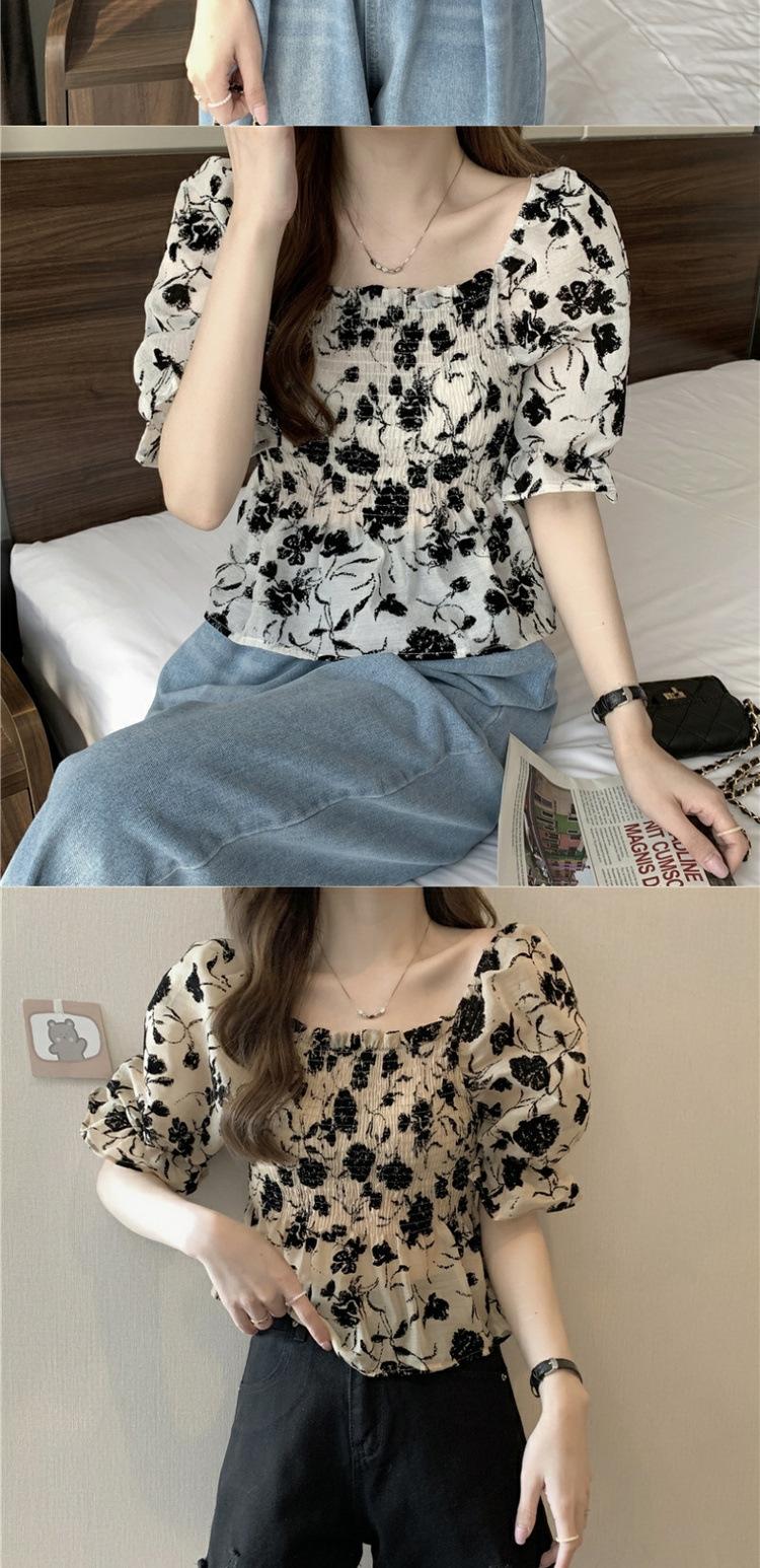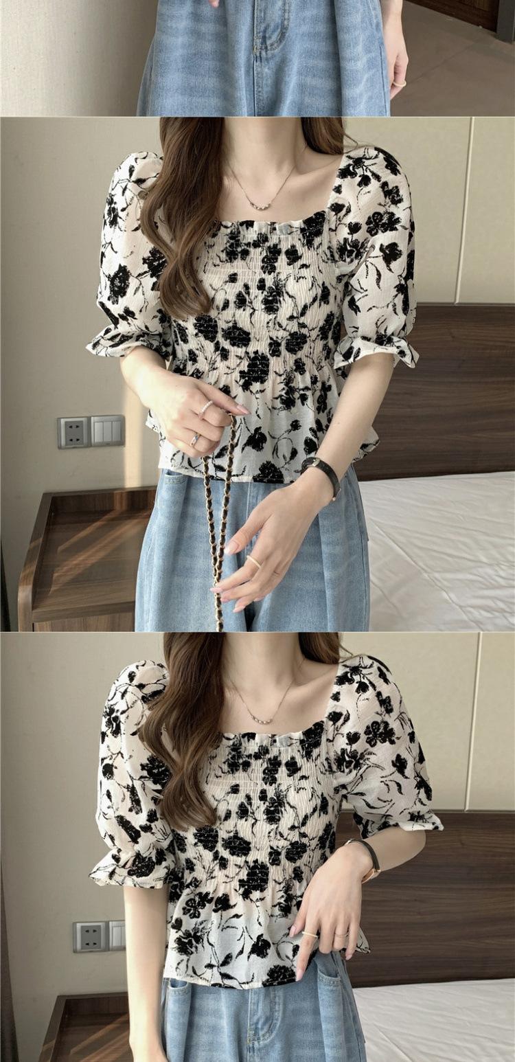 Camisa elegante de cuello cuadrado estilo francés con mangas cortas y estampado floral para mujer, diseño Sense Niche, top de verano con cintura corta y clavícula.