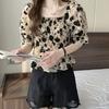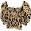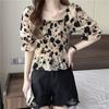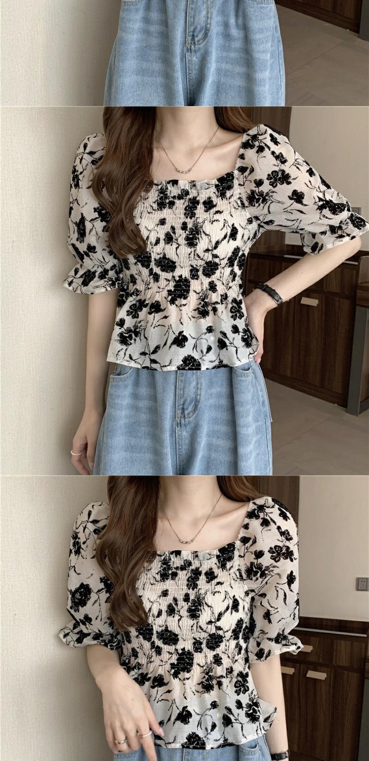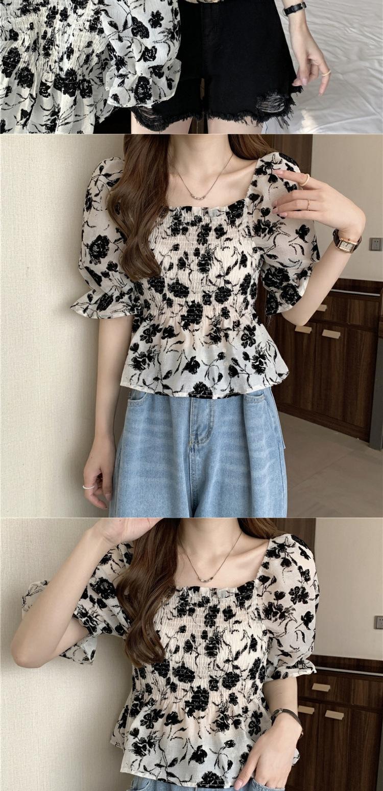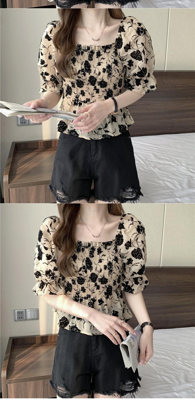 Camisa elegante de cuello cuadrado estilo francés con mangas cortas y estampado floral para mujer, diseño Sense Niche, top de verano con cintura corta y clavícula.