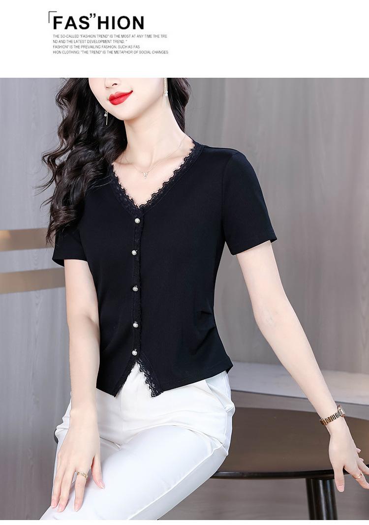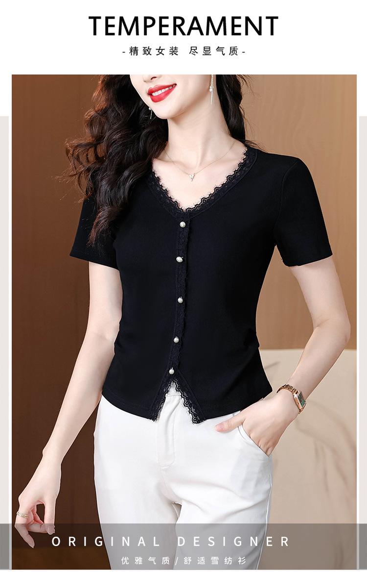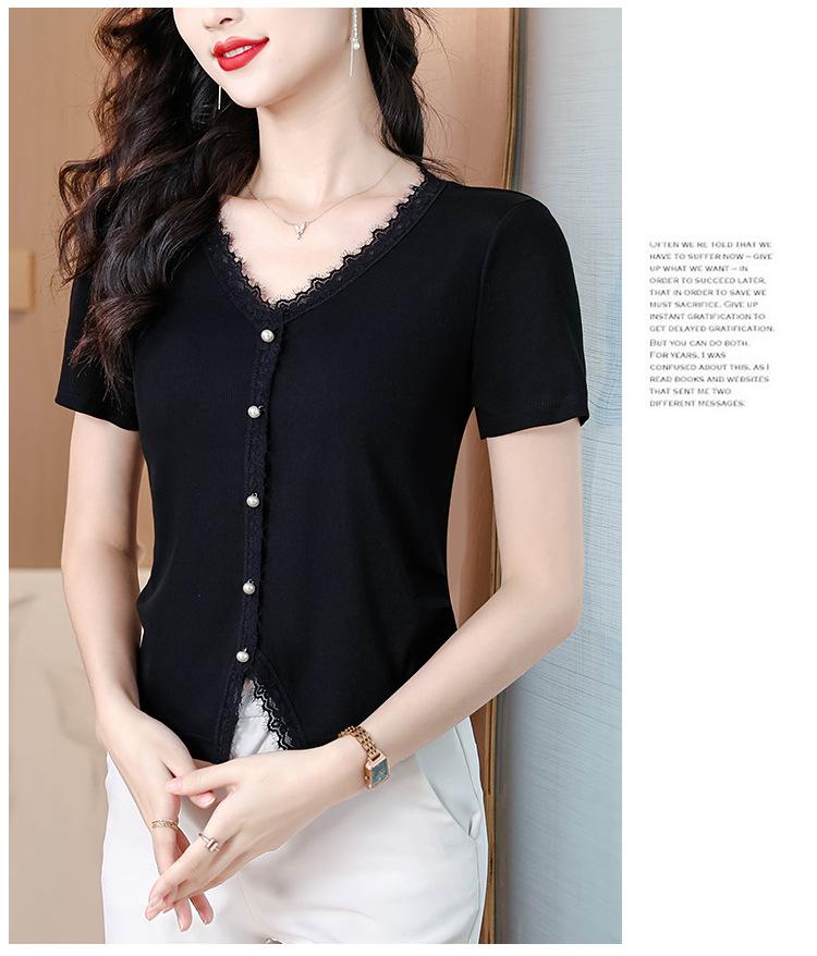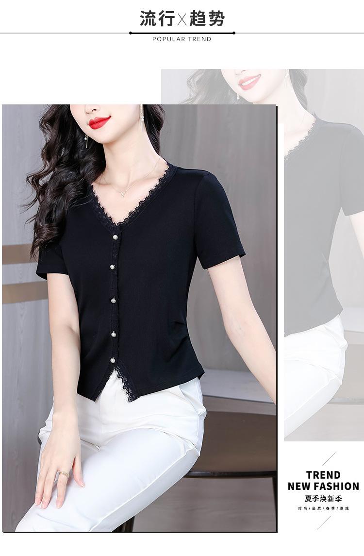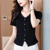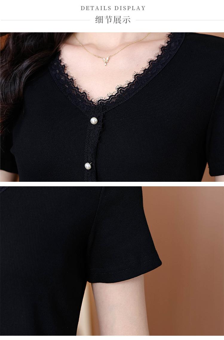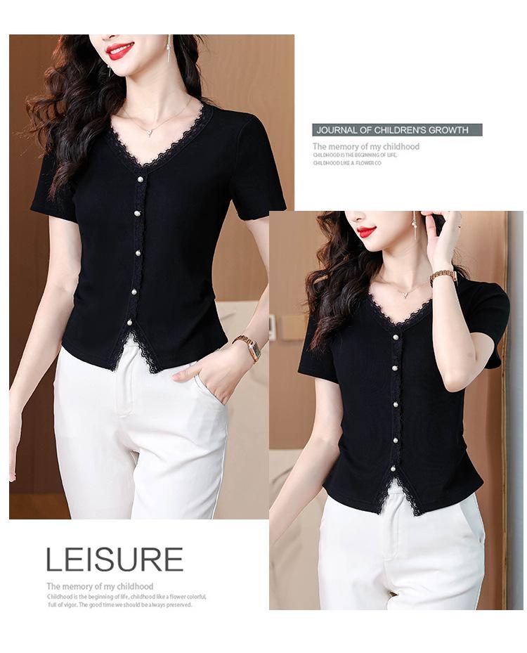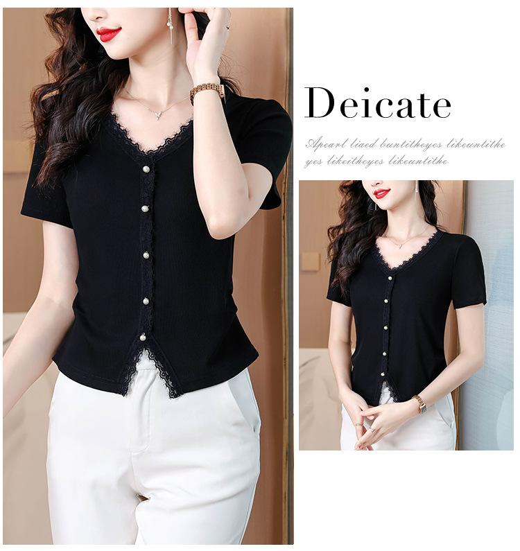 2025 Verano Nuevo Encaje Costuras Cuello en V Manga Corta Camiseta Moda de Mujer Elegante Ajustada Adelgazante Top Chic
