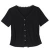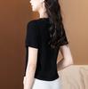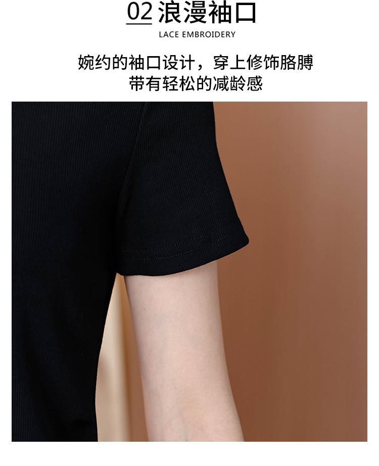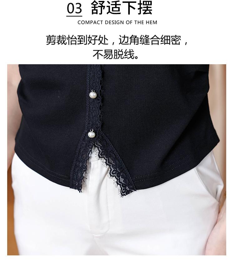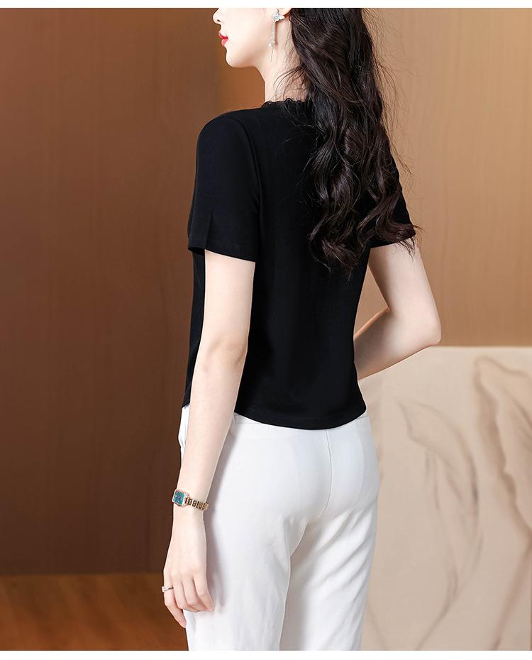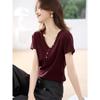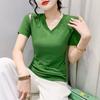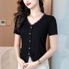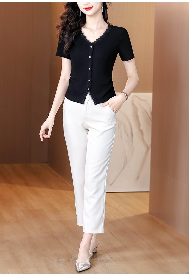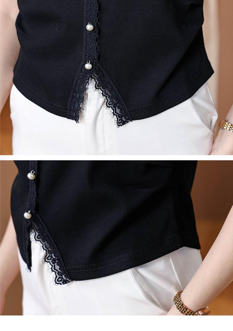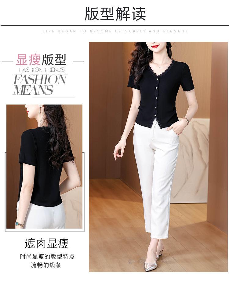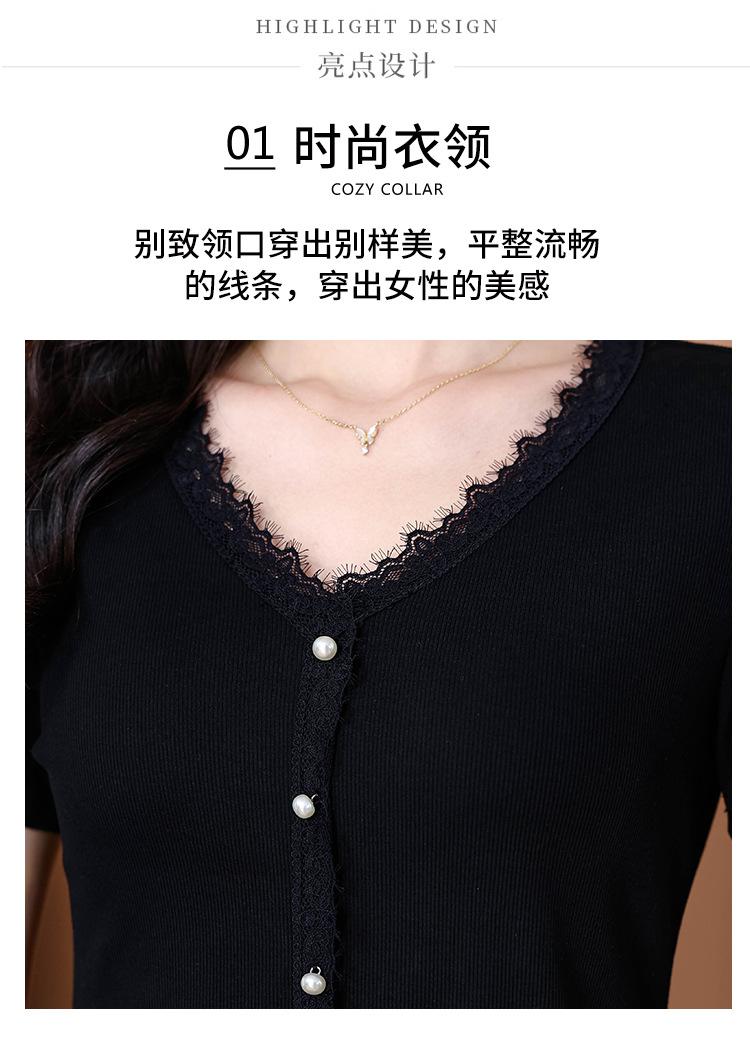 2025 Verano Nuevo Encaje Costuras Cuello en V Manga Corta Camiseta Moda de Mujer Elegante Ajustada Adelgazante Top Chic
