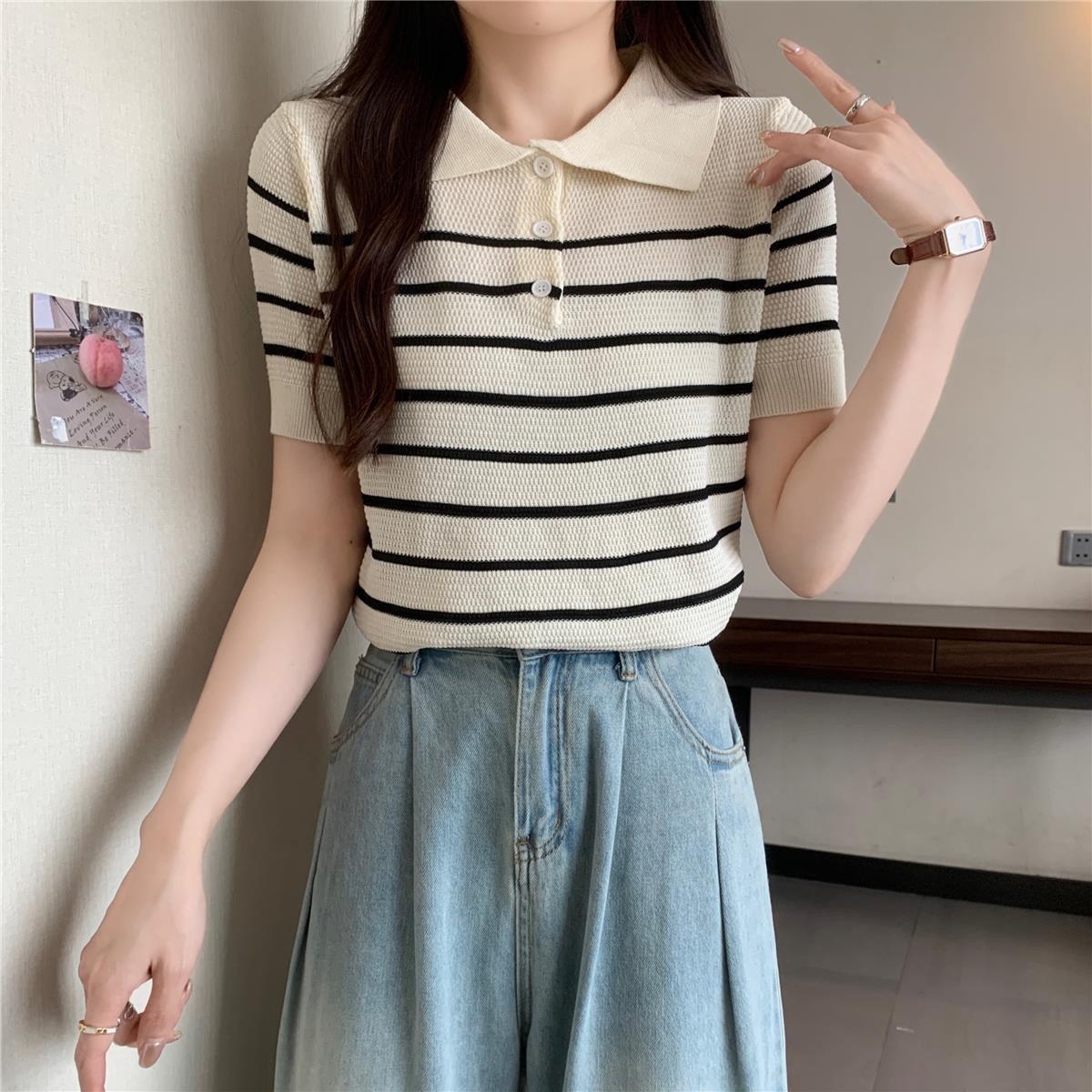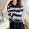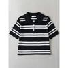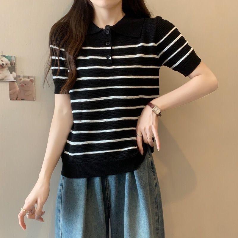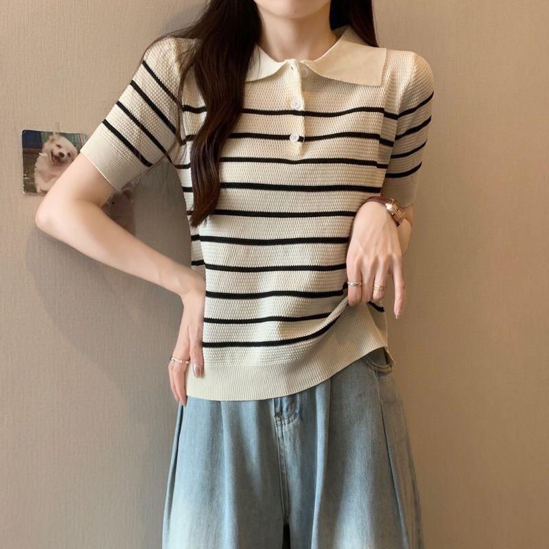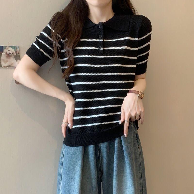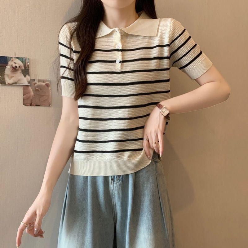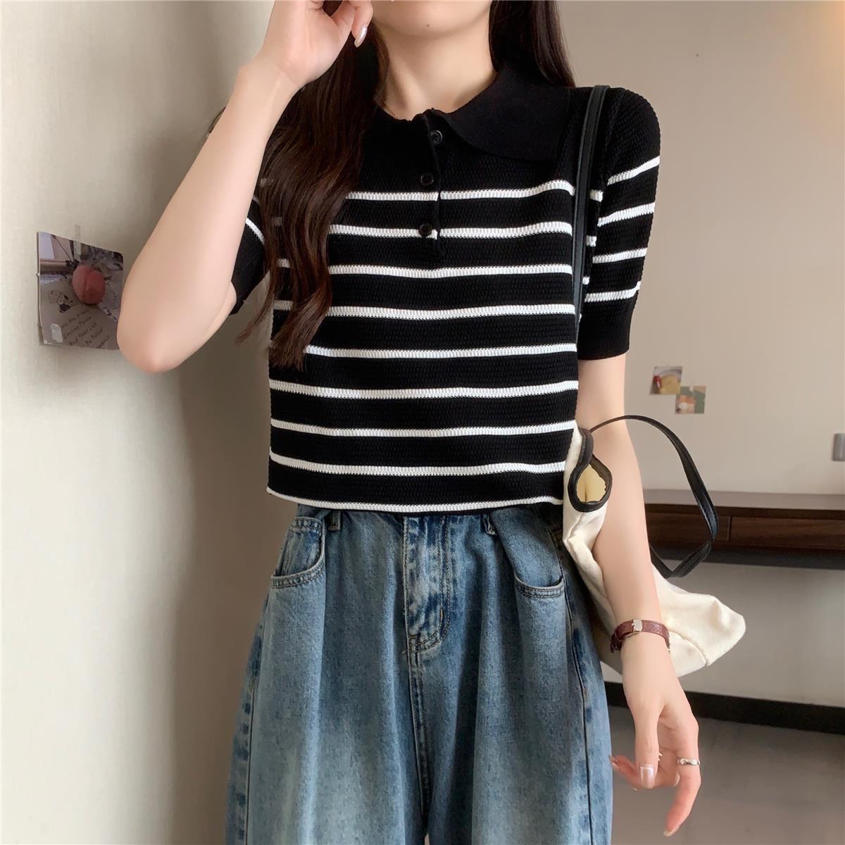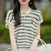 Suéter de manga corta a rayas con cuello polo para mujer, nuevo diseño de top de verano 2024, camisa corta con cintura pequeña
