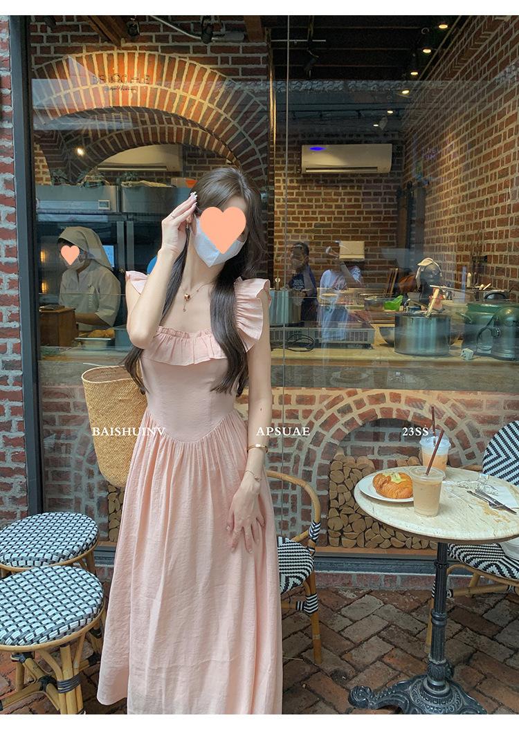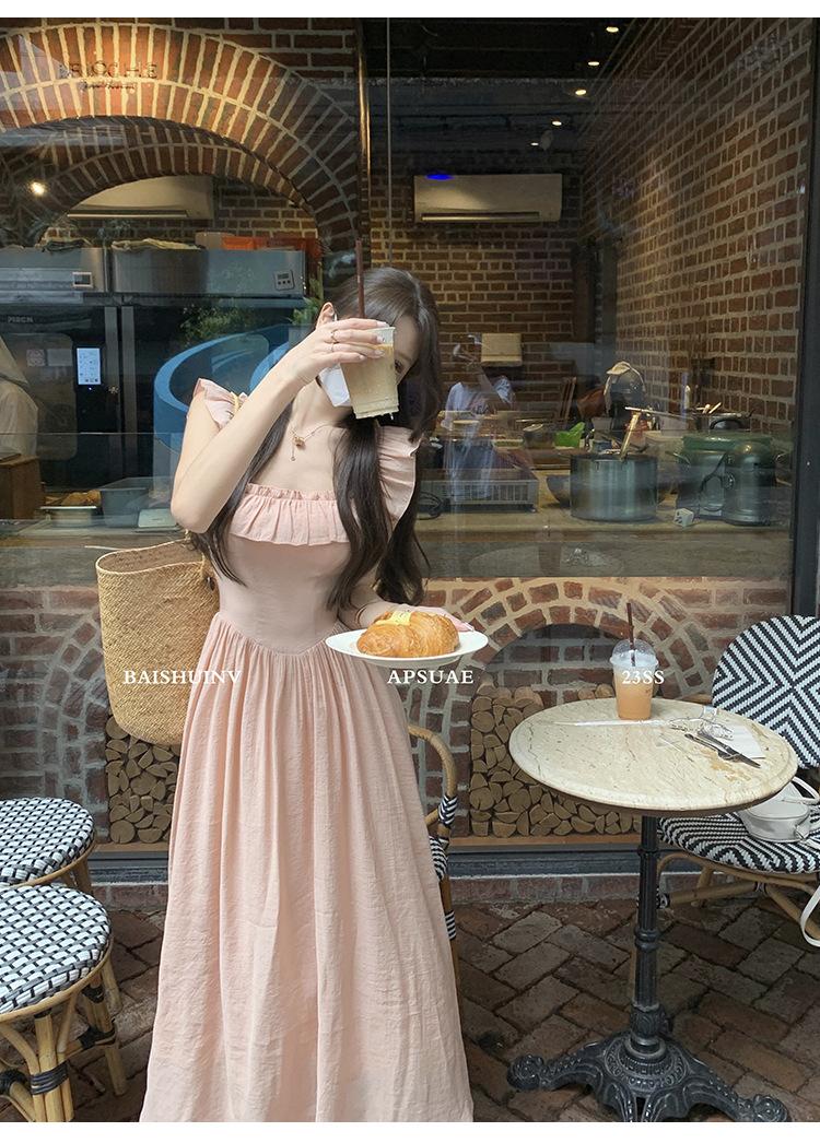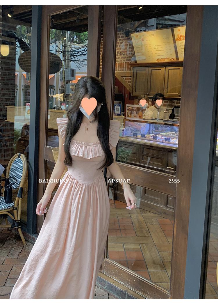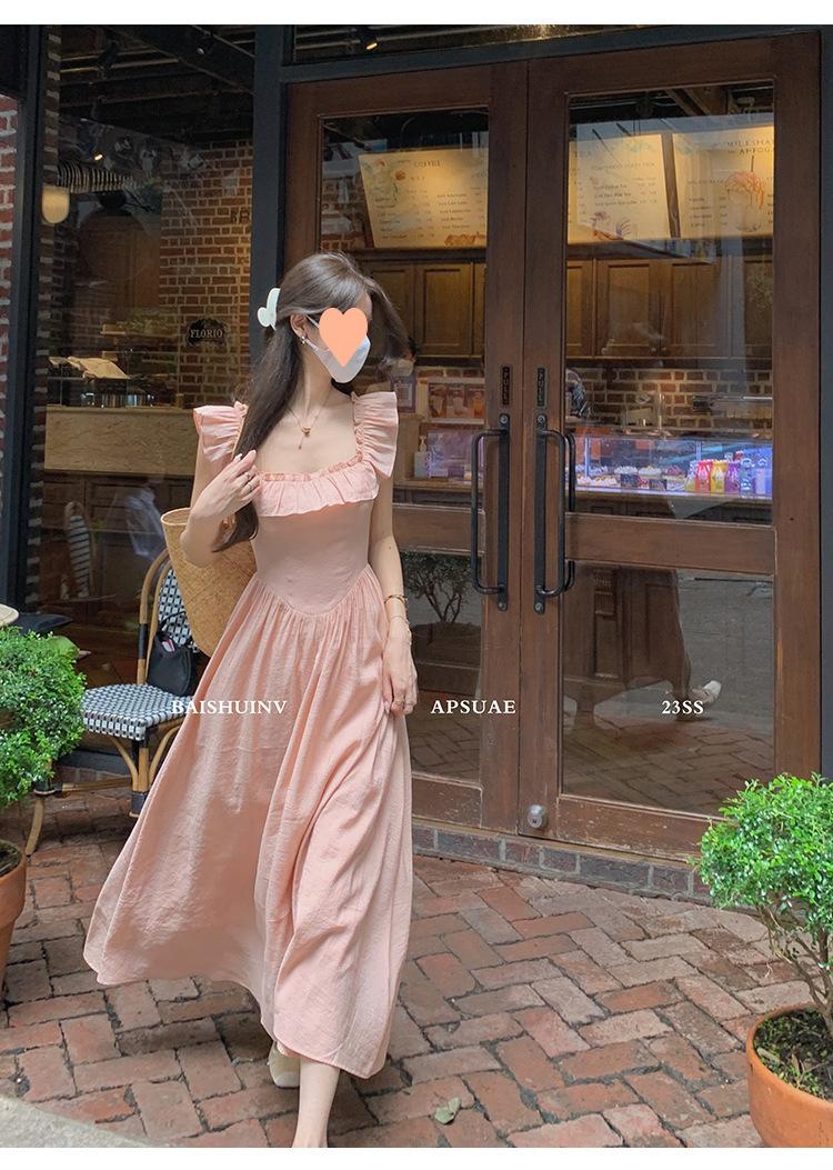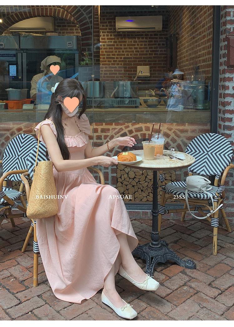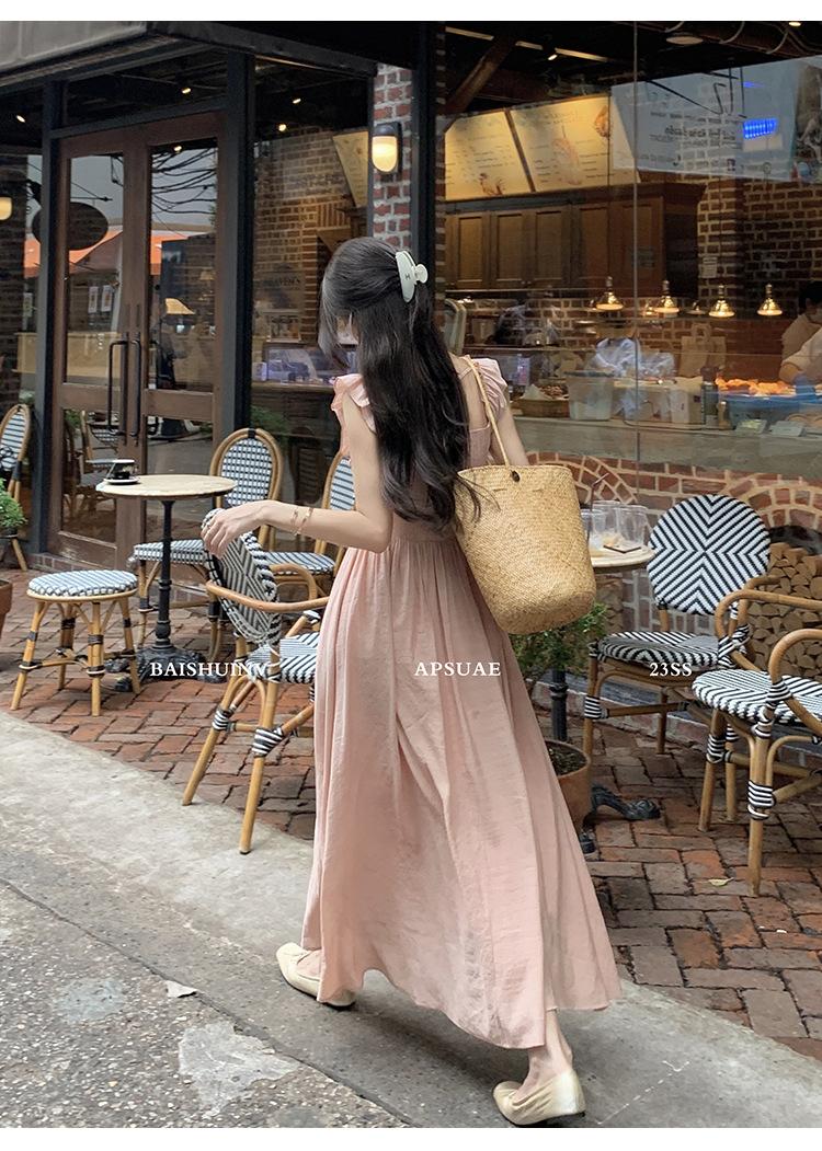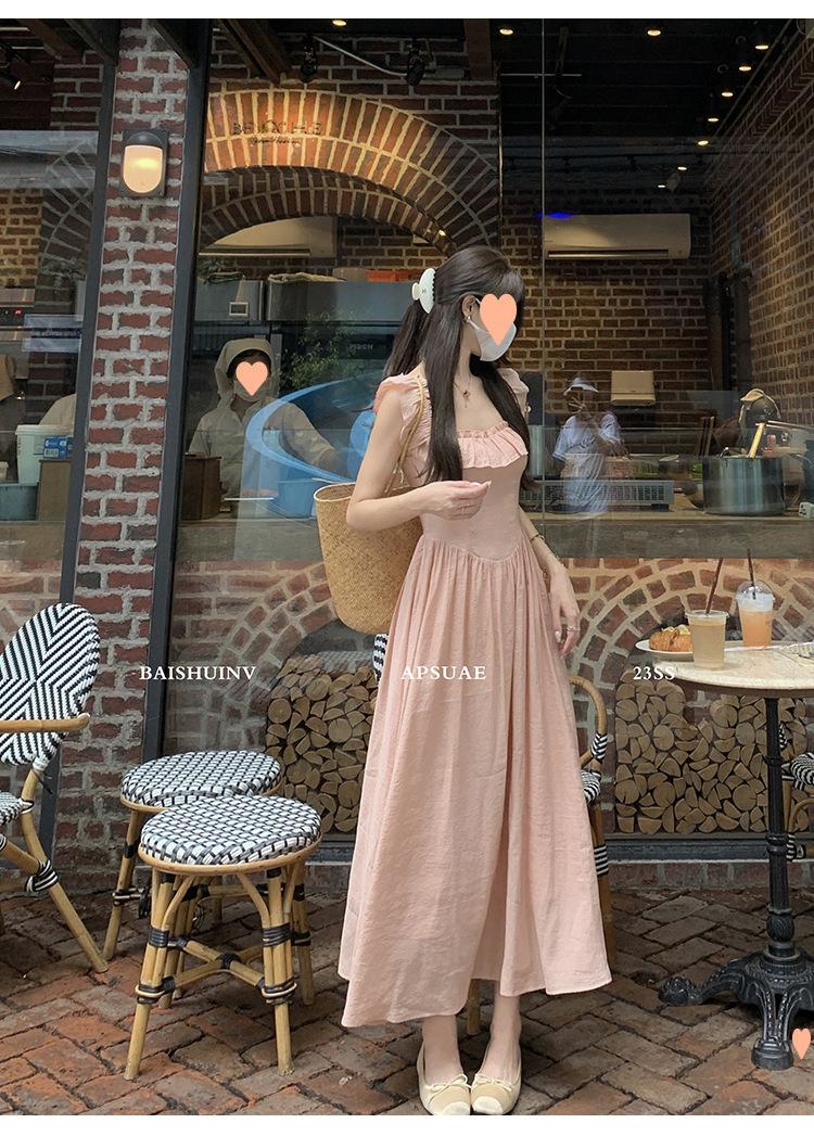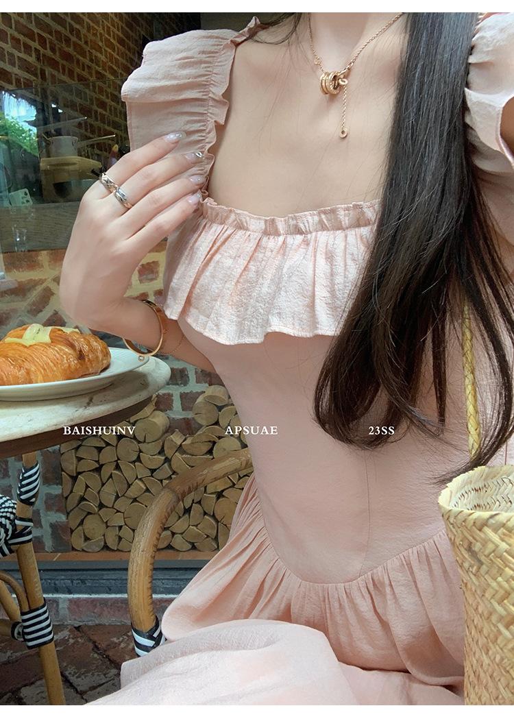 Vestido de tirantes con cuello cuadrado con volantes Vestido elegante de gasa rosa claro para mujer