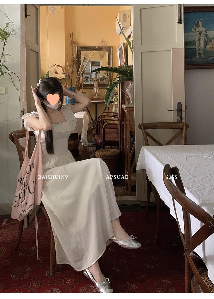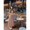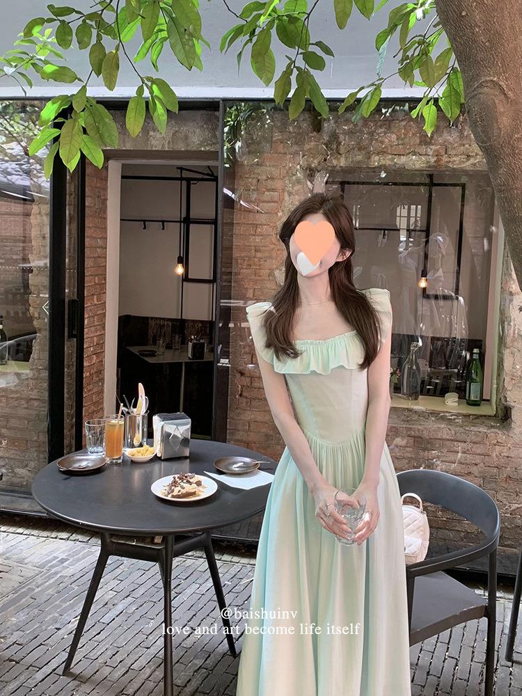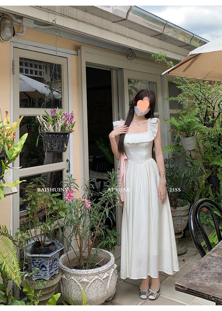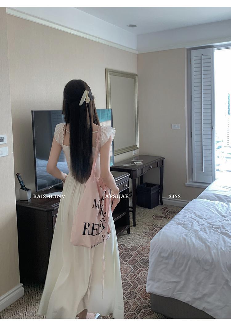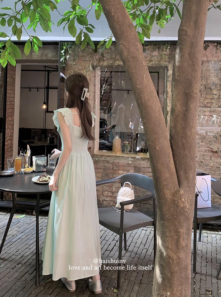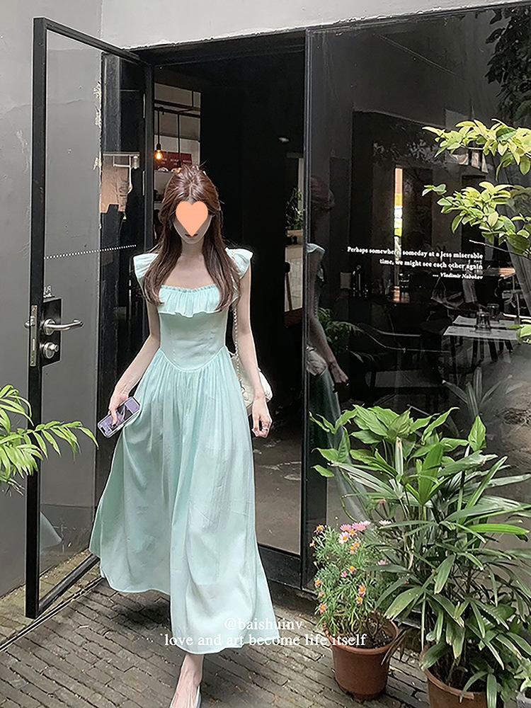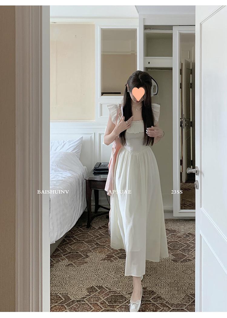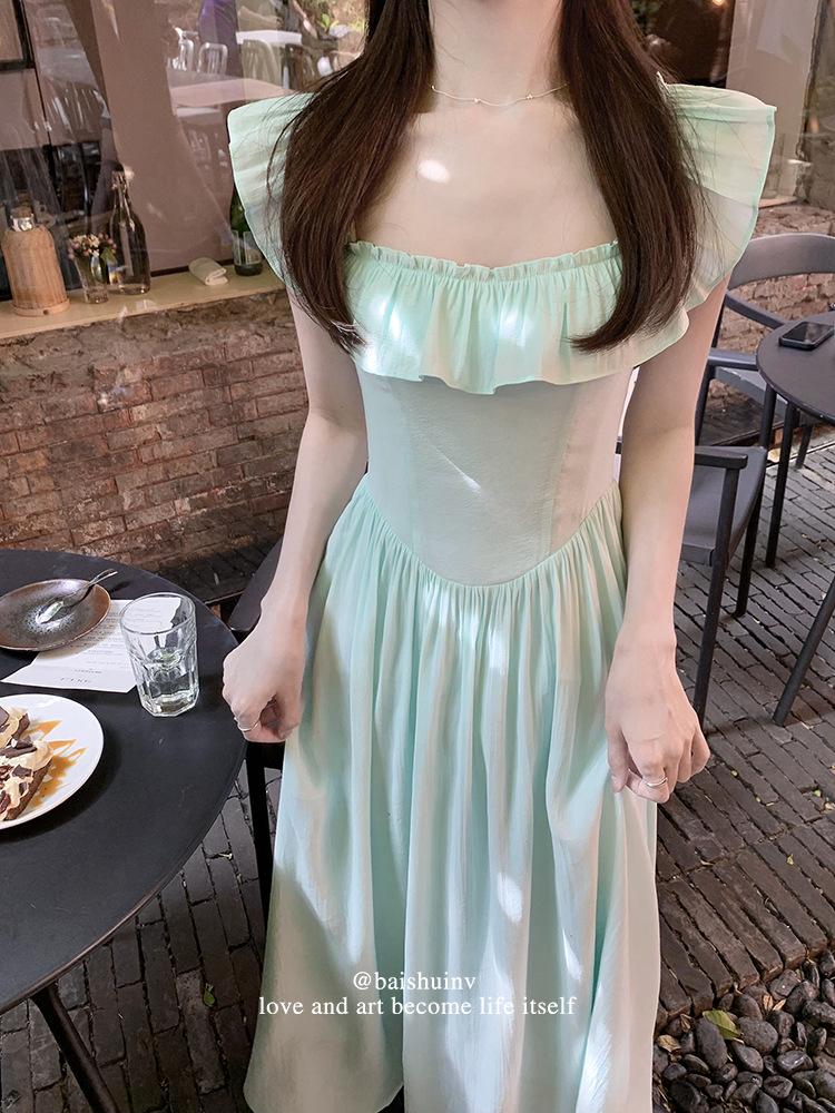 Vestido de tirantes con cuello cuadrado con volantes Vestido elegante de gasa rosa claro para mujer