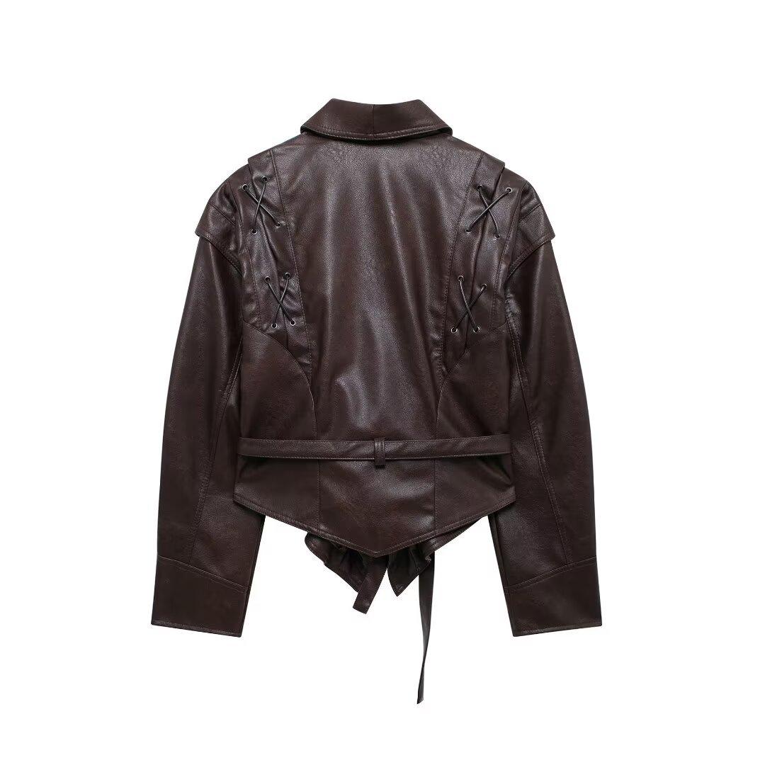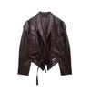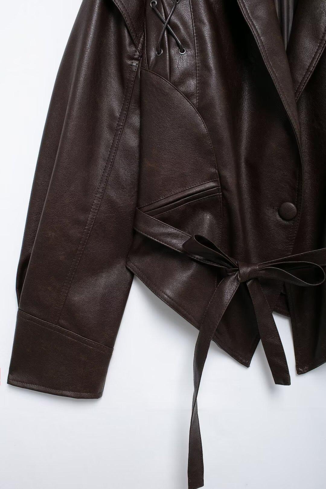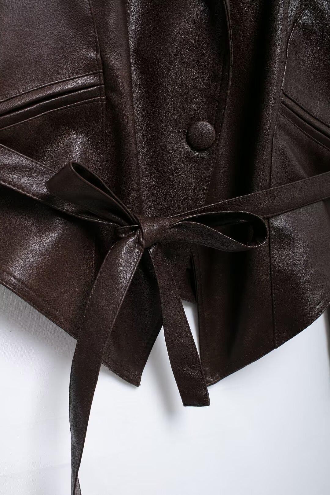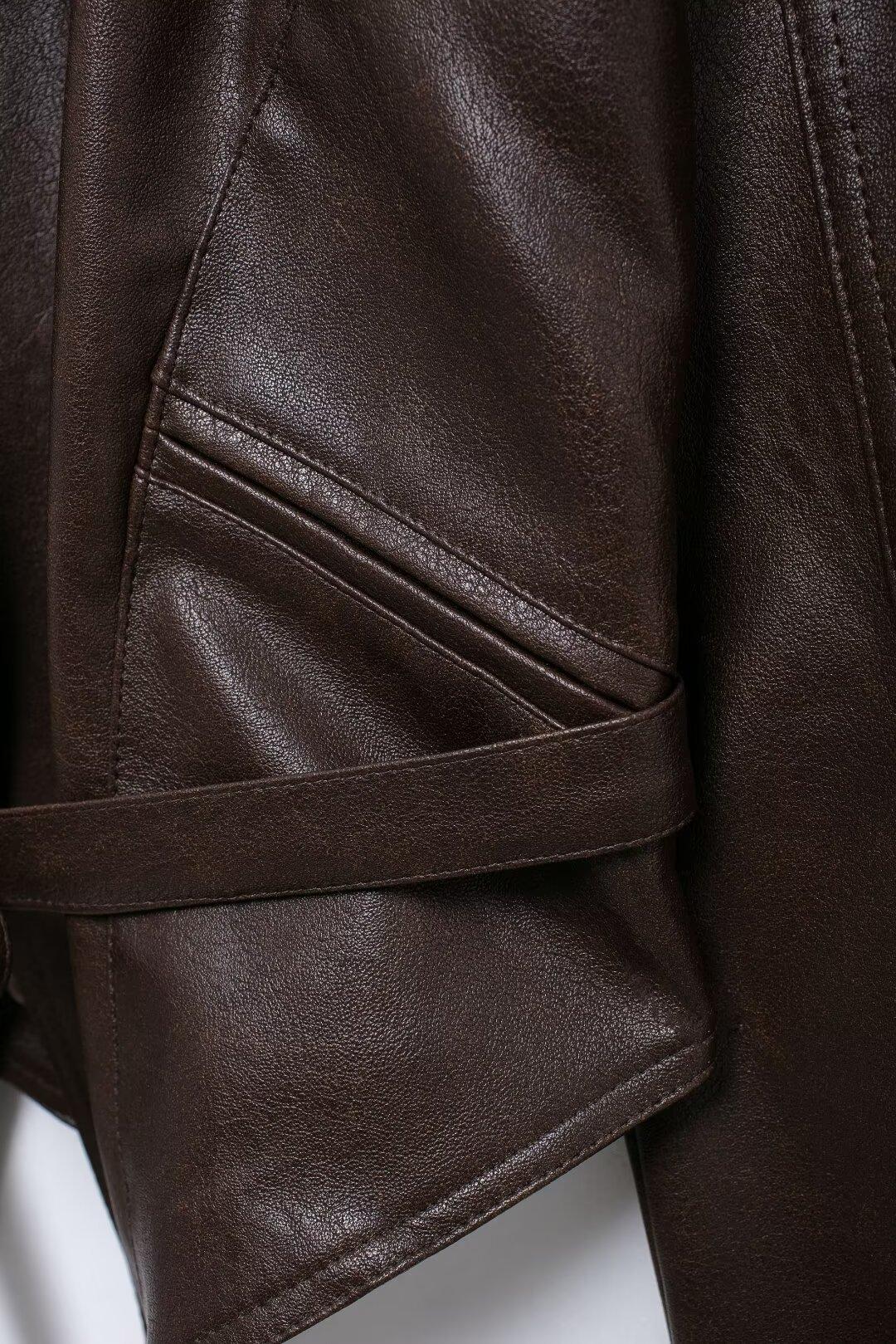 Chaqueta de Cuero Amazon de Moda de Otoño e Invierno para Mujer Venta al Por Mayor de Un Solo Botón 2024 Cinturón Versátil Verde Fruta Cuello Nuevo Retro