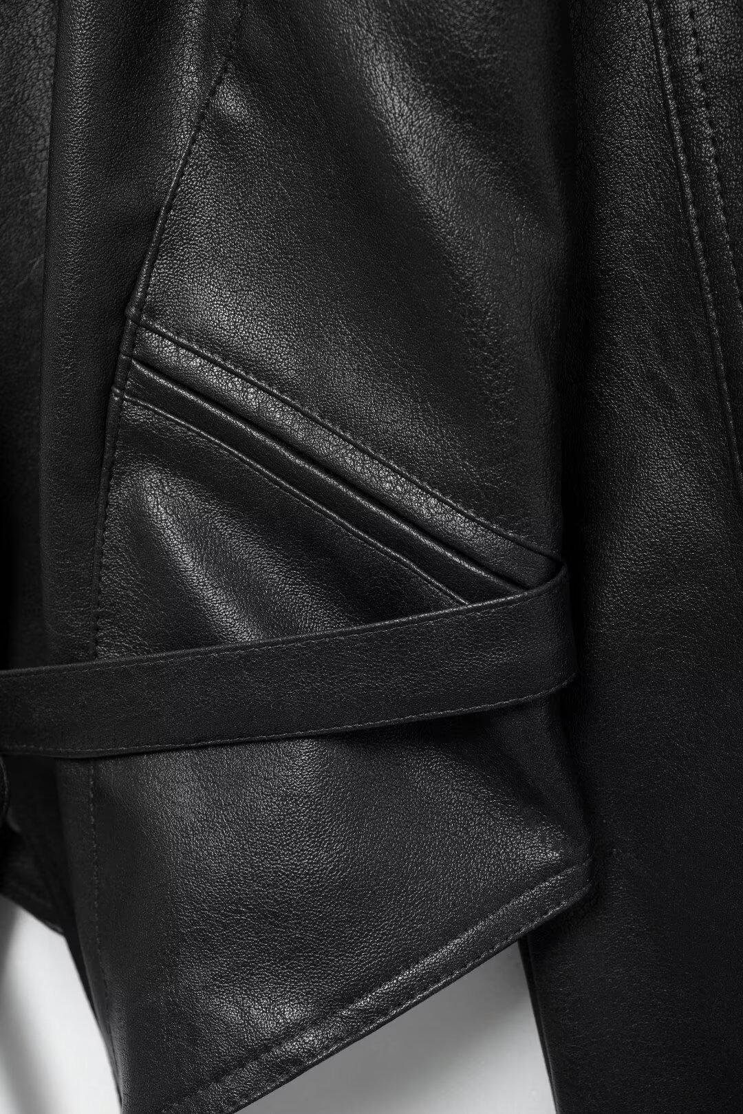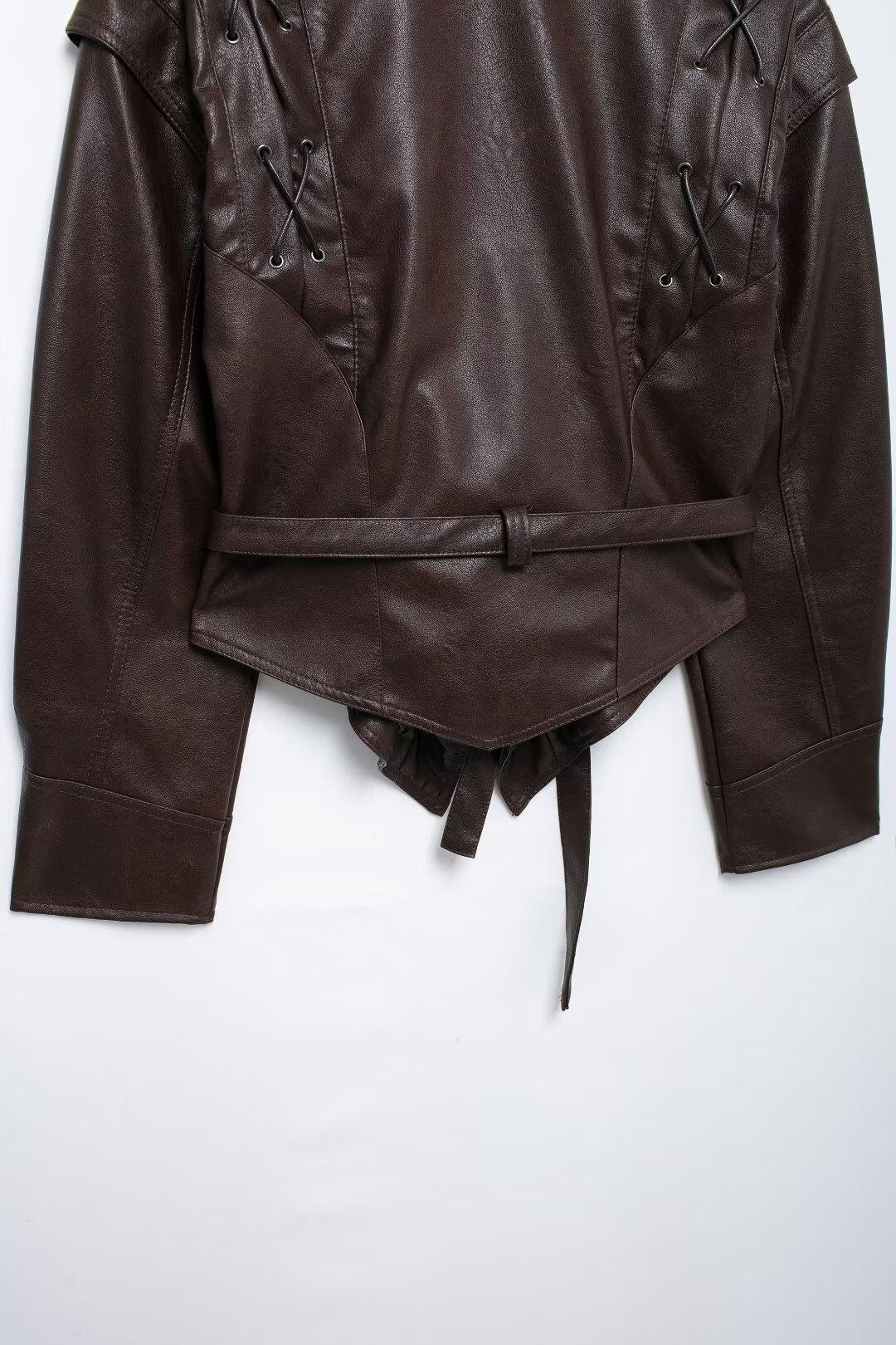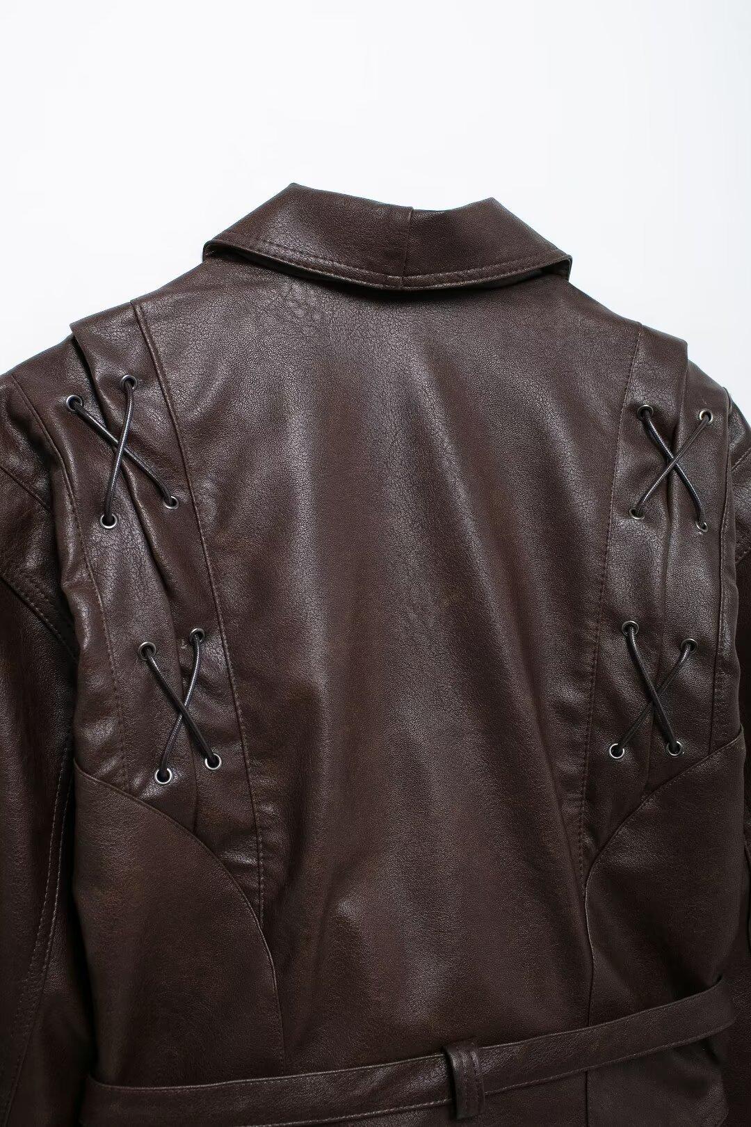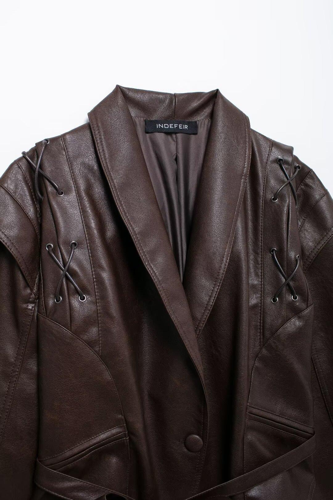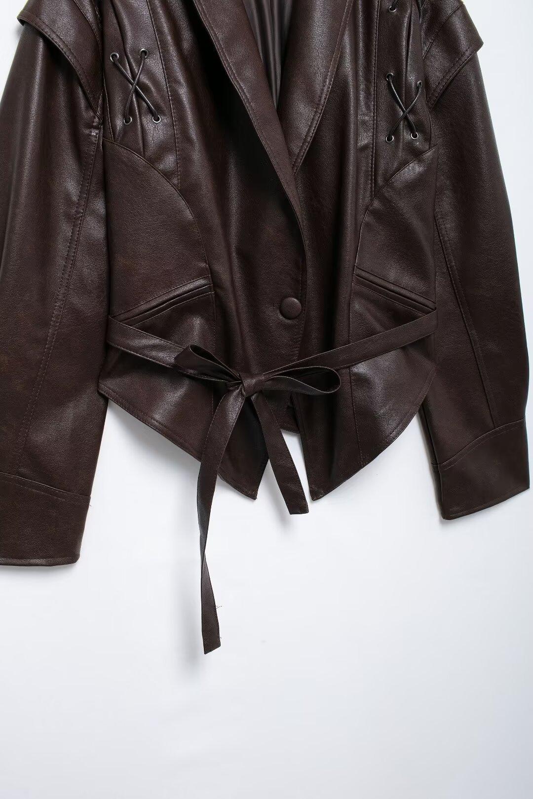 Chaqueta de Cuero Amazon de Moda de Otoño e Invierno para Mujer Venta al Por Mayor de Un Solo Botón 2024 Cinturón Versátil Verde Fruta Cuello Nuevo Retro