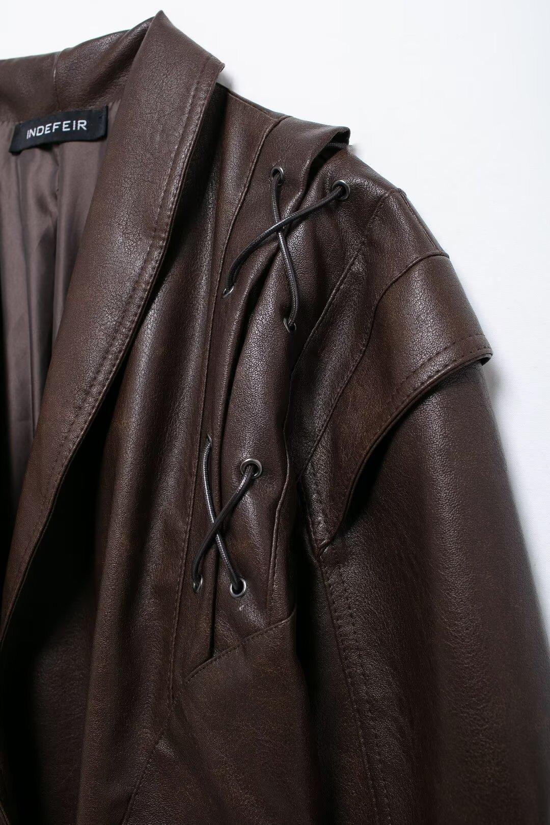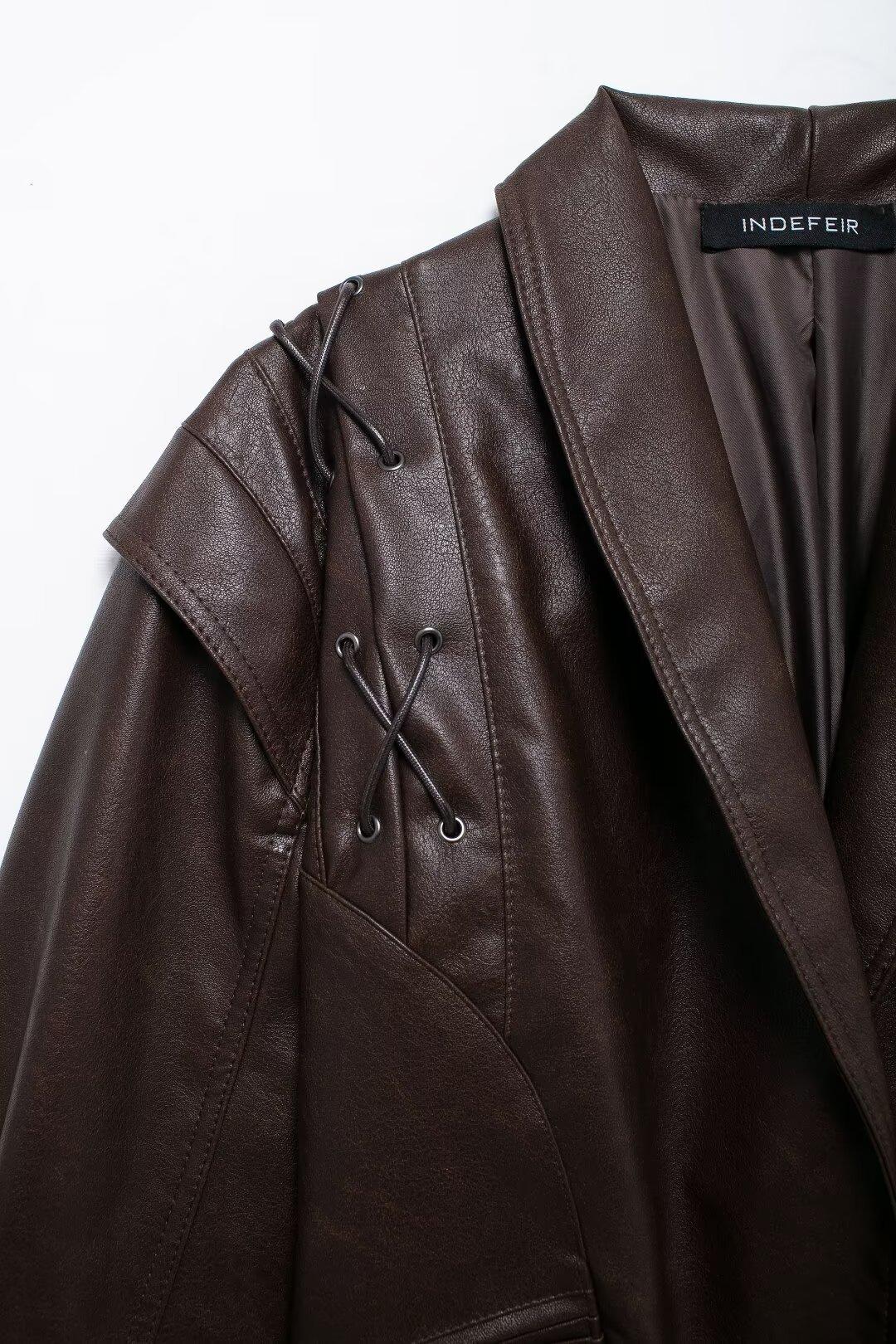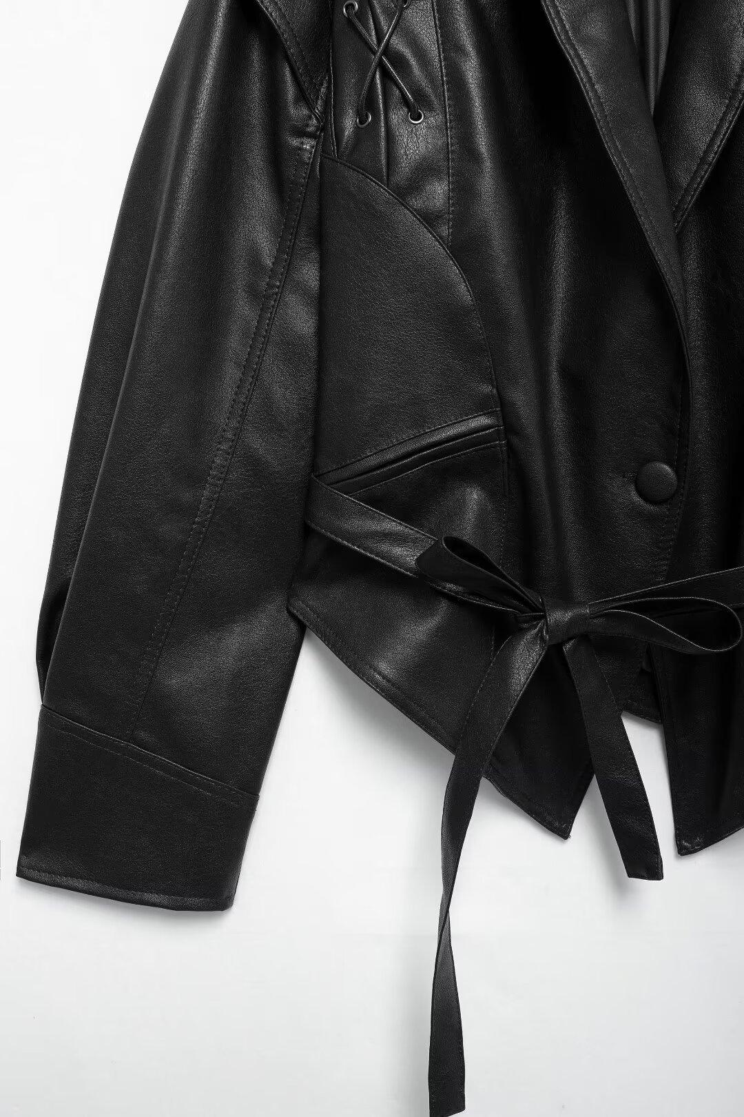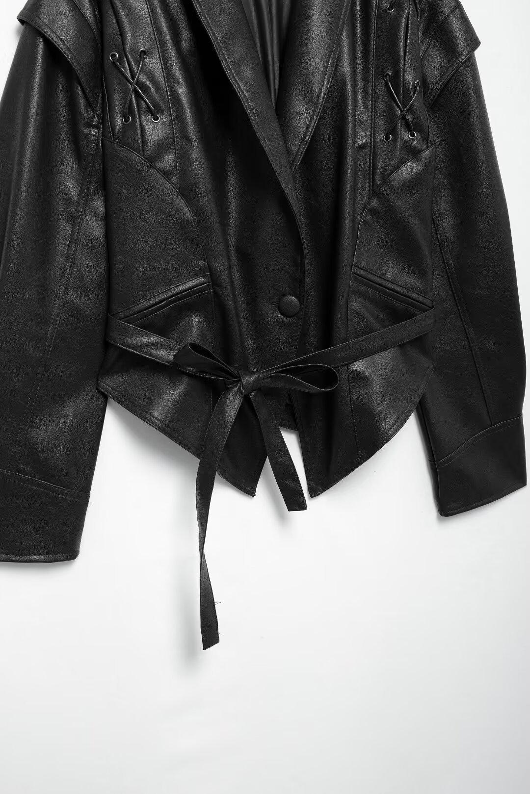 Chaqueta de Cuero Amazon de Moda de Otoño e Invierno para Mujer Venta al Por Mayor de Un Solo Botón 2024 Cinturón Versátil Verde Fruta Cuello Nuevo Retro