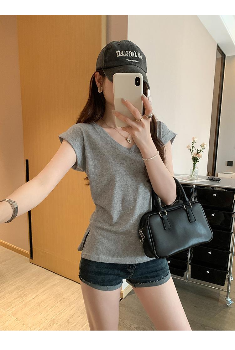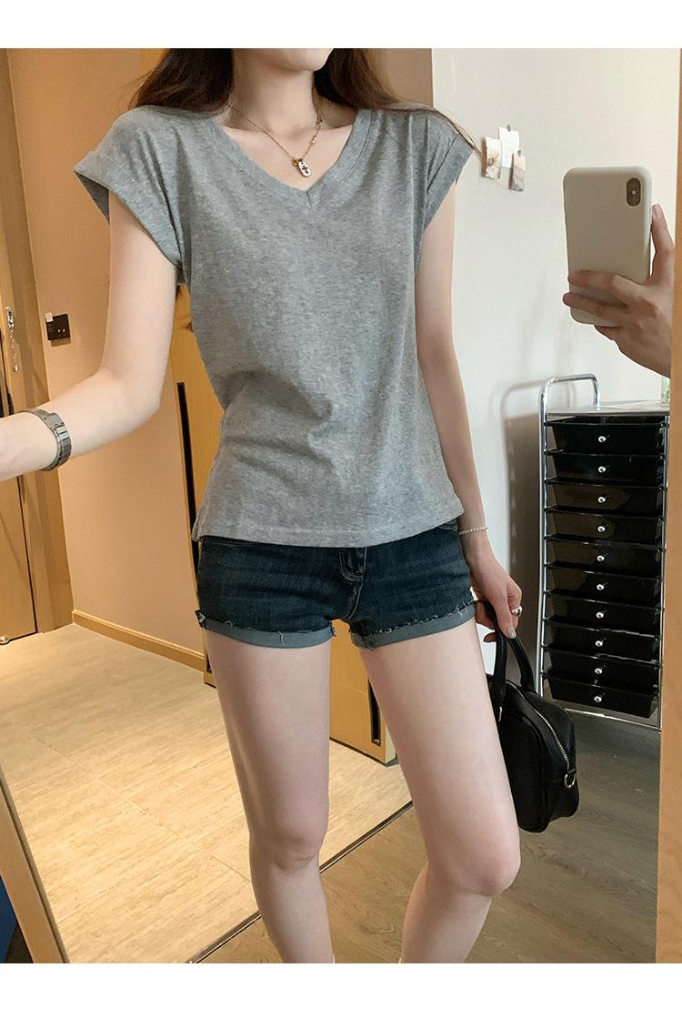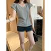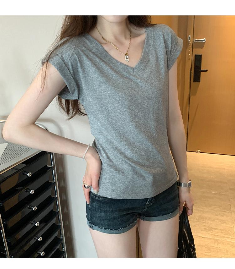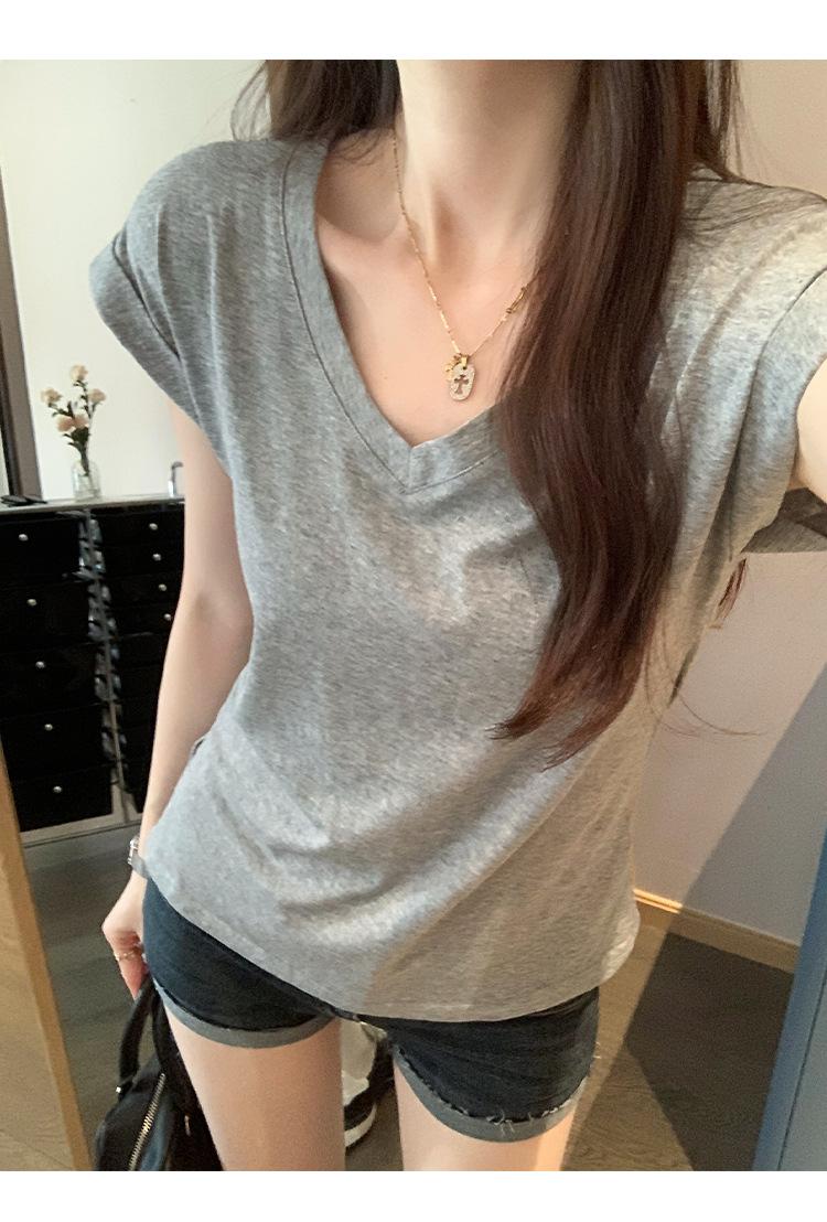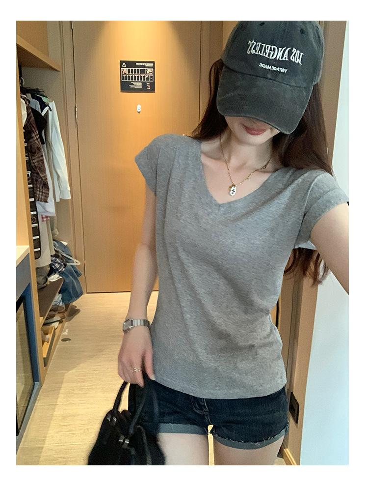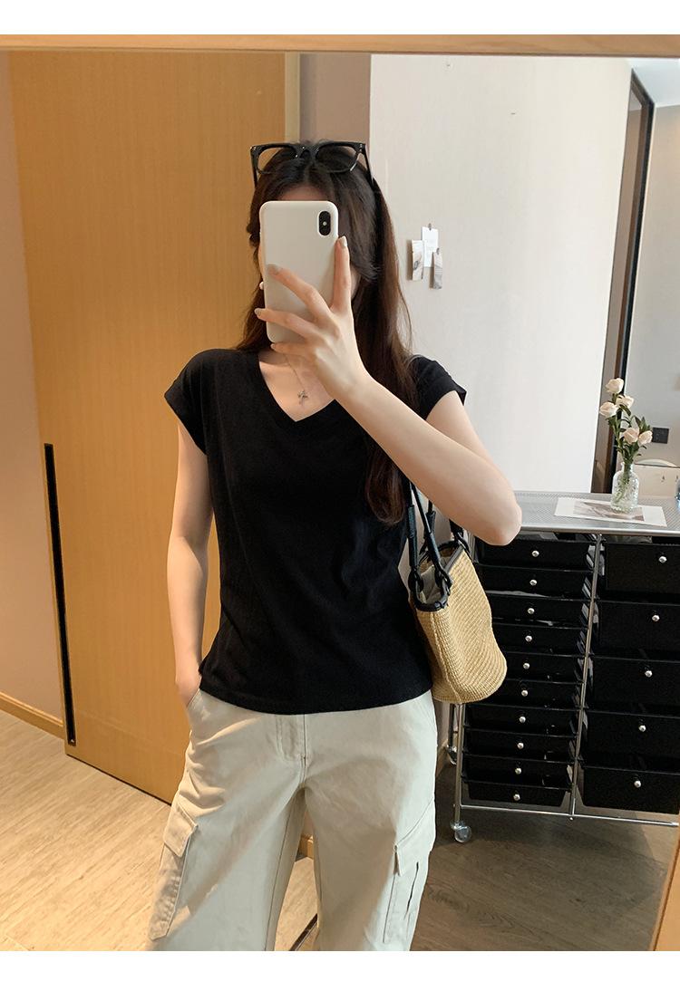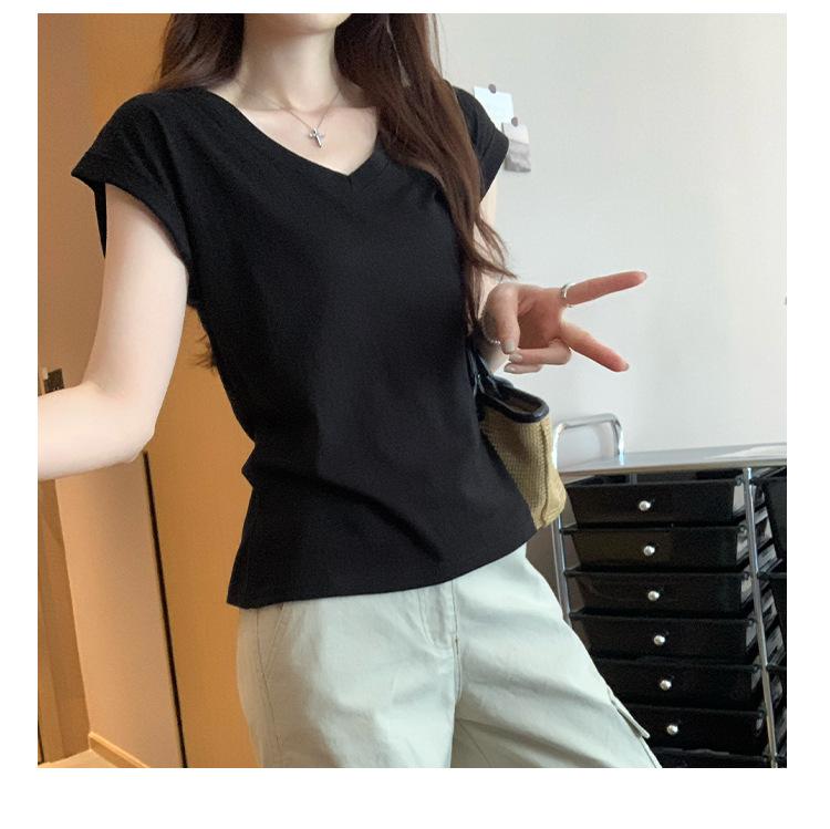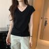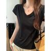 Fotos reales Camiseta de hombro estilo coreano con cuello en V y manga corta para mujer 2025 verano nuevo nicho de alta gama top sin bultos