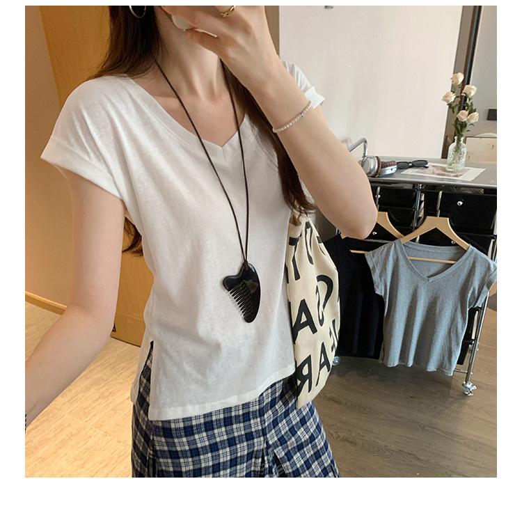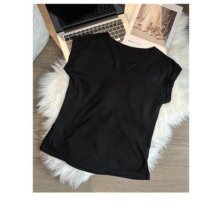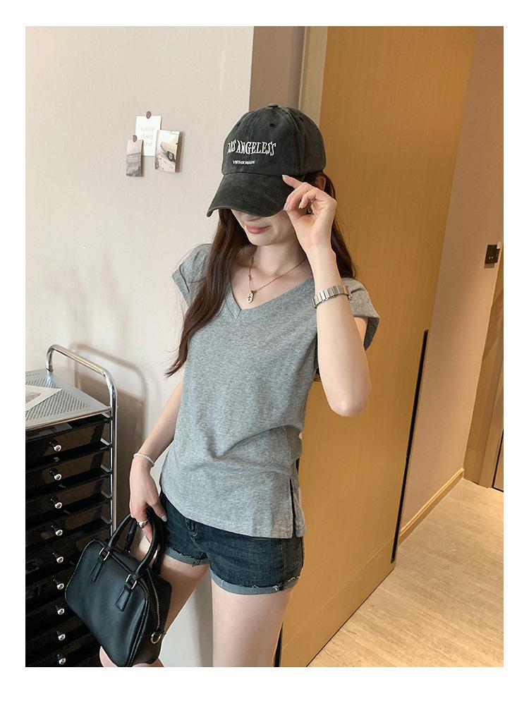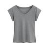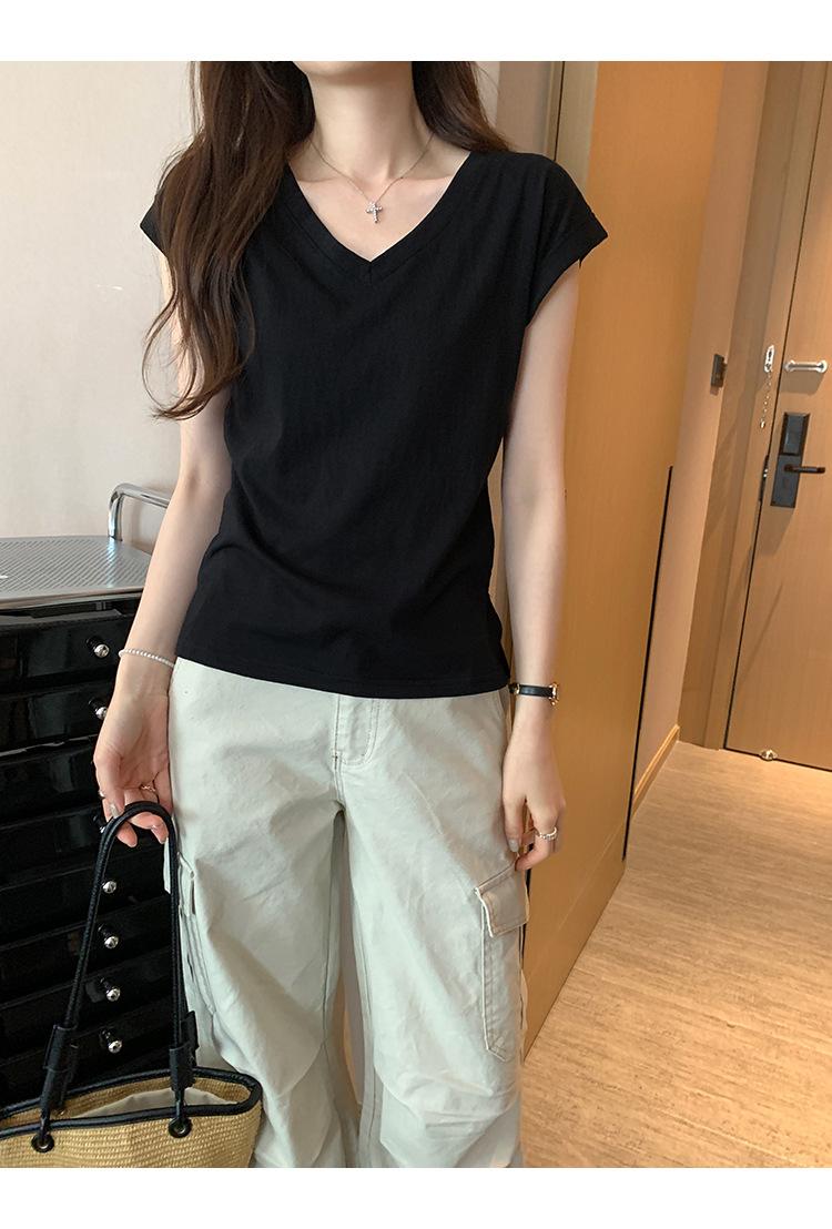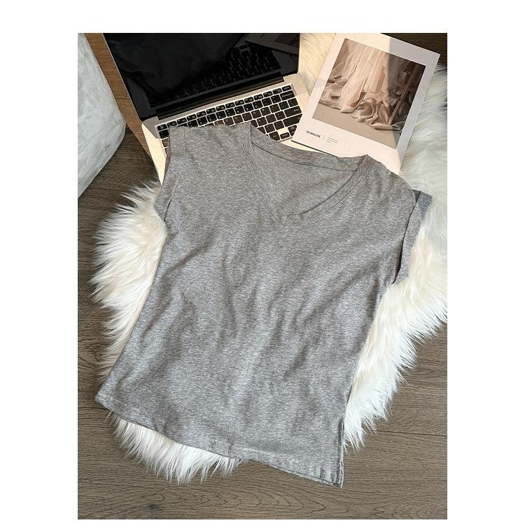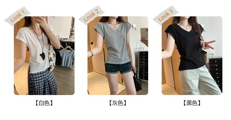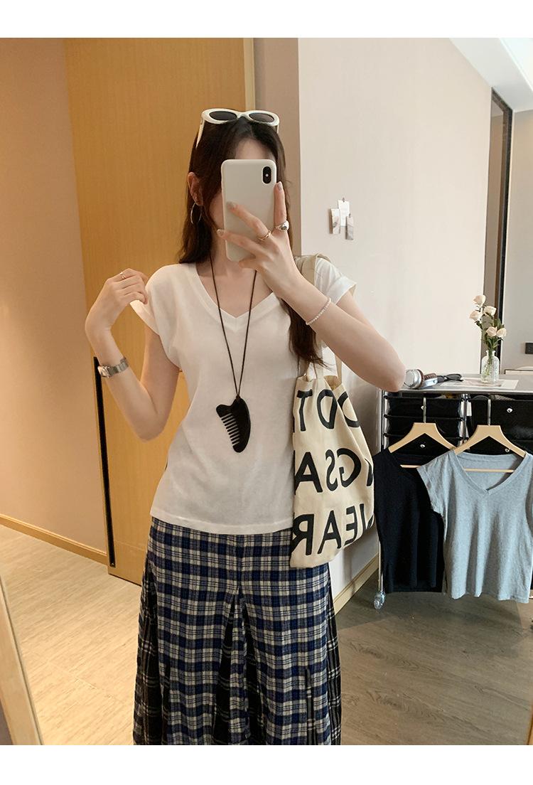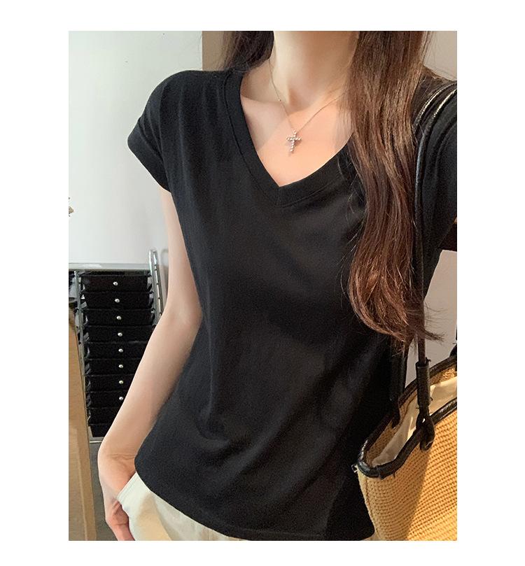 Fotos reales Camiseta de hombro estilo coreano con cuello en V y manga corta para mujer 2025 verano nuevo nicho de alta gama top sin bultos