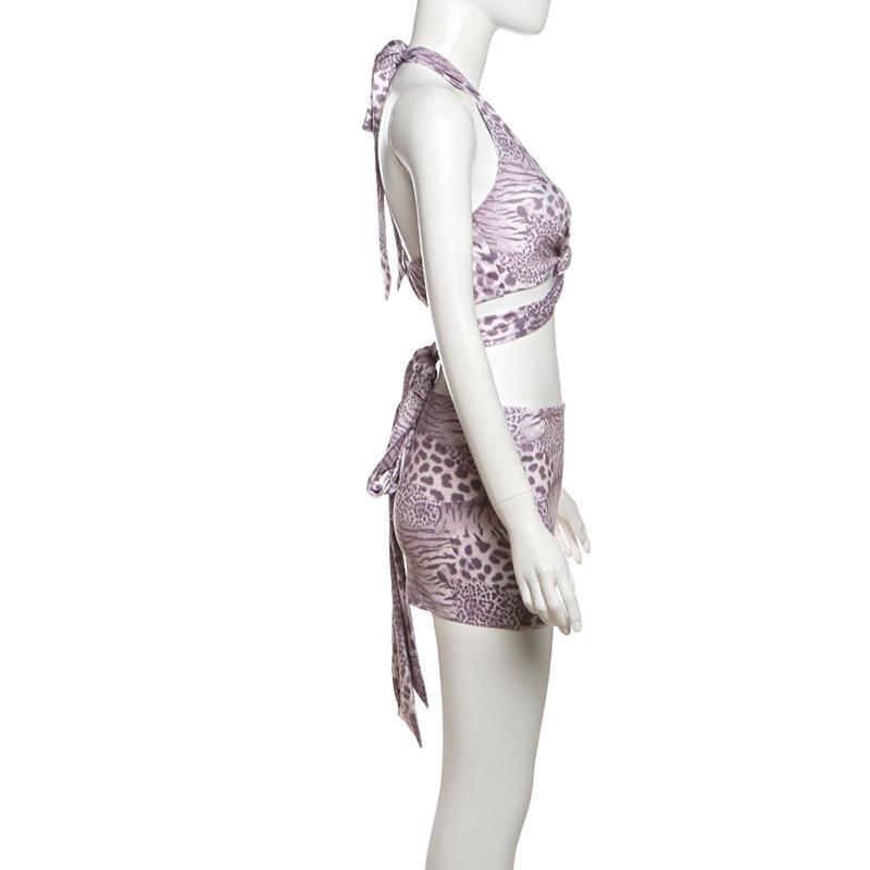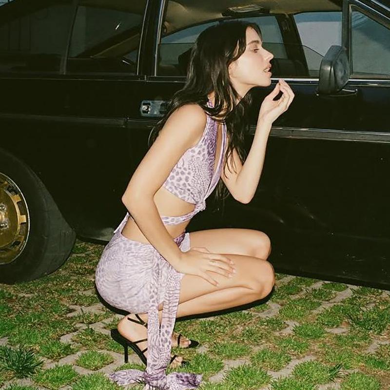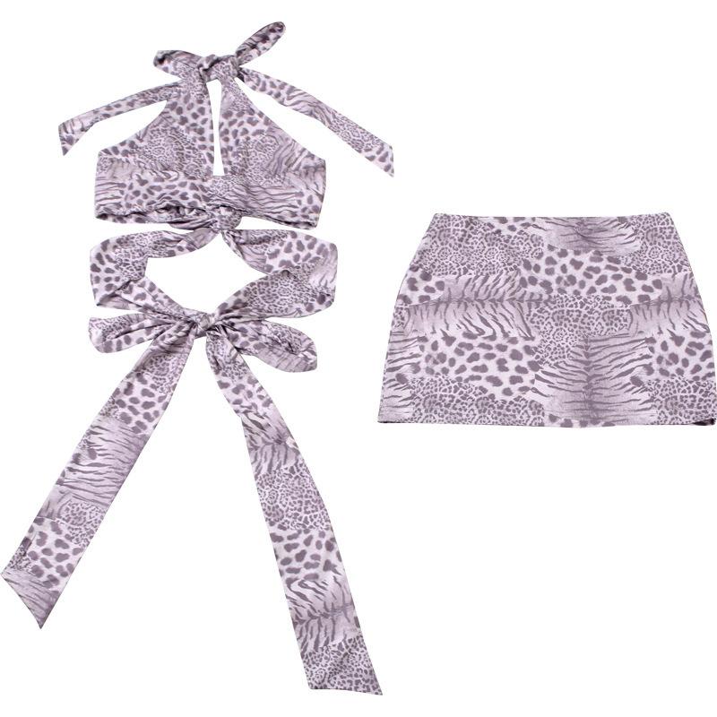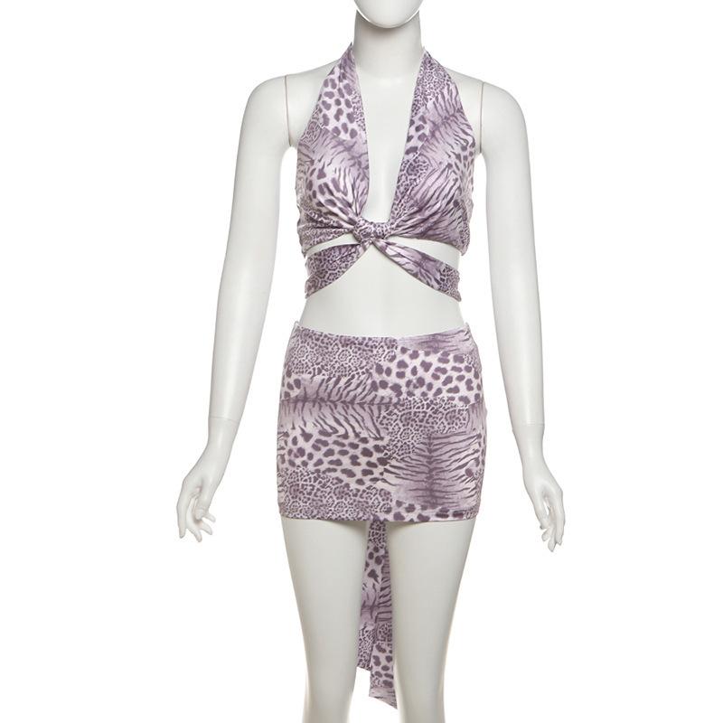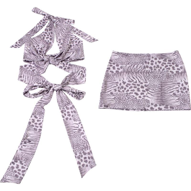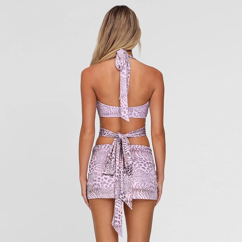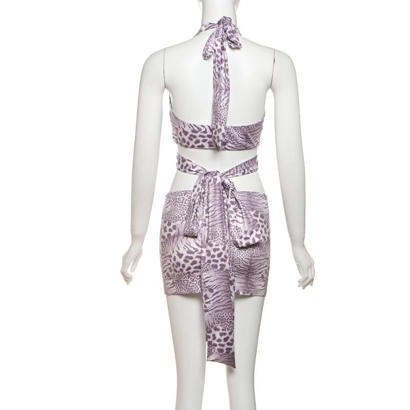Traje de Camisola Estampada Sexy de Verano 2025 para Mujer Europea y Americana con Tirantes al Cuello, Ajustado y Falda a la Cadera