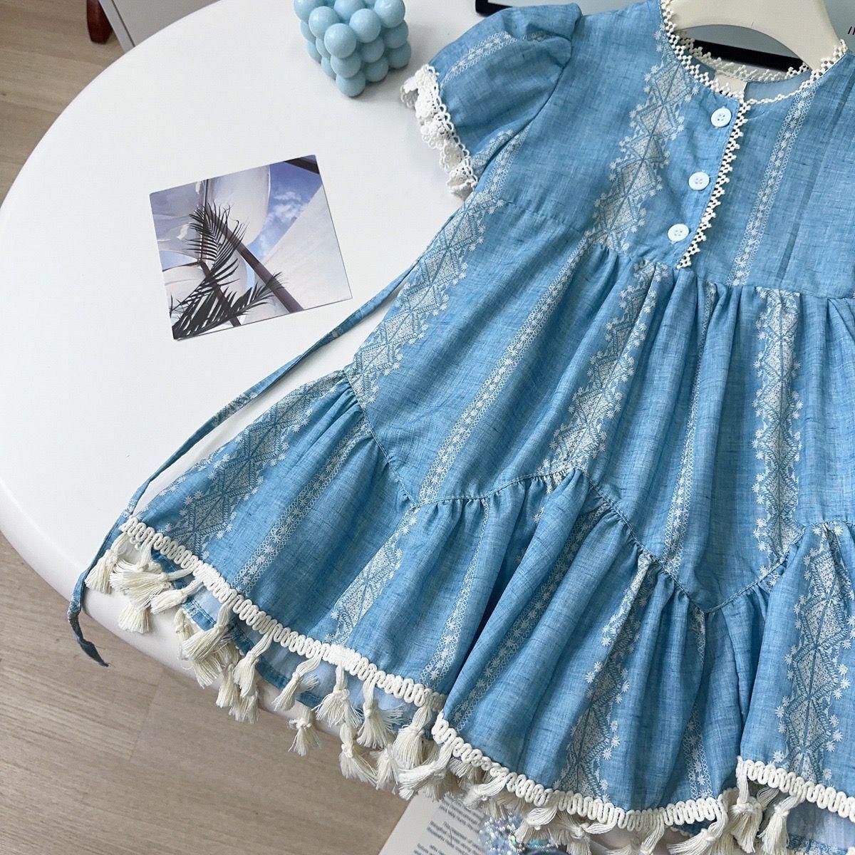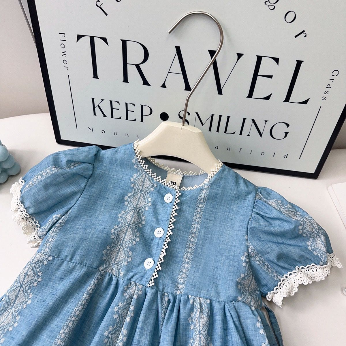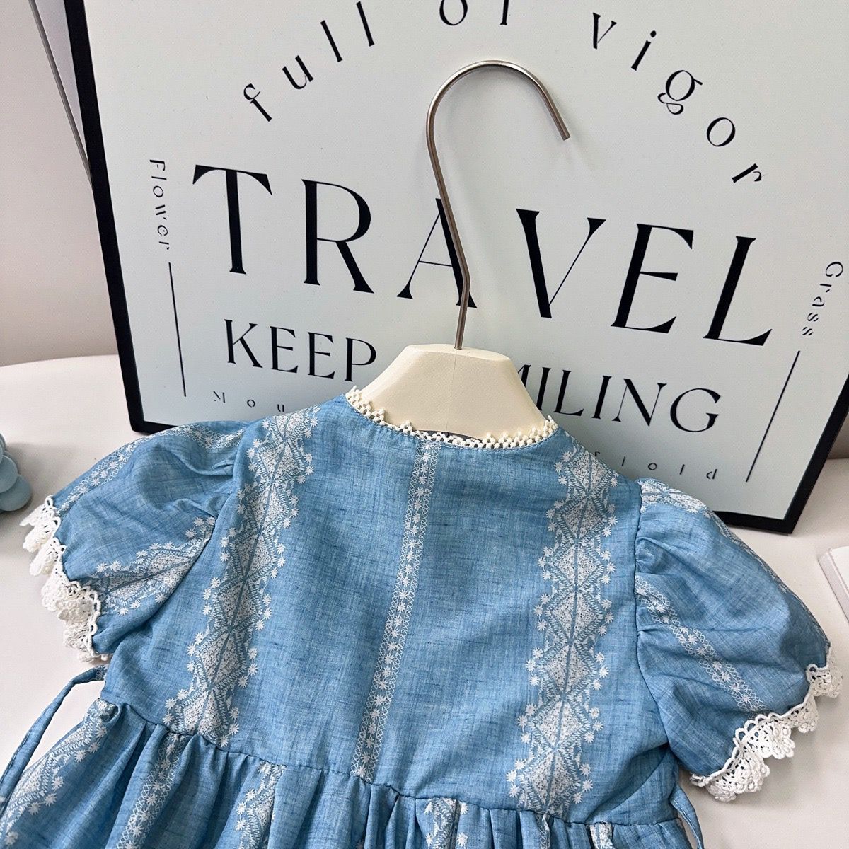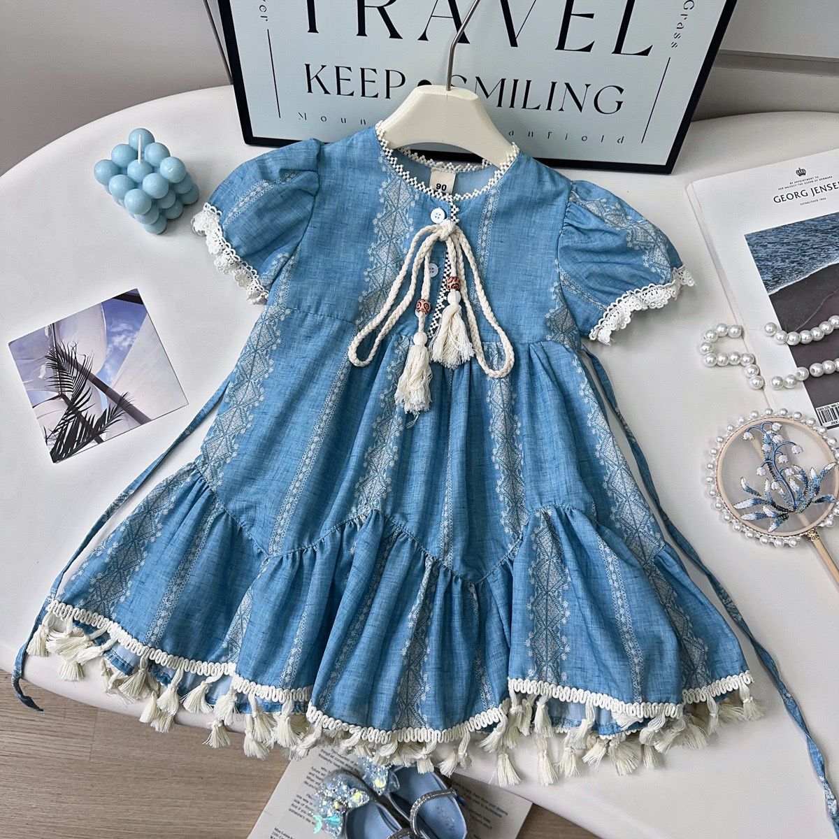 Vestido de niña 2025 Verano Nuevo Manga Corta Bordado Vestido de Princesa Estilo Étnico Vintage Vacaciones Vestido Infantil