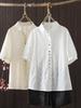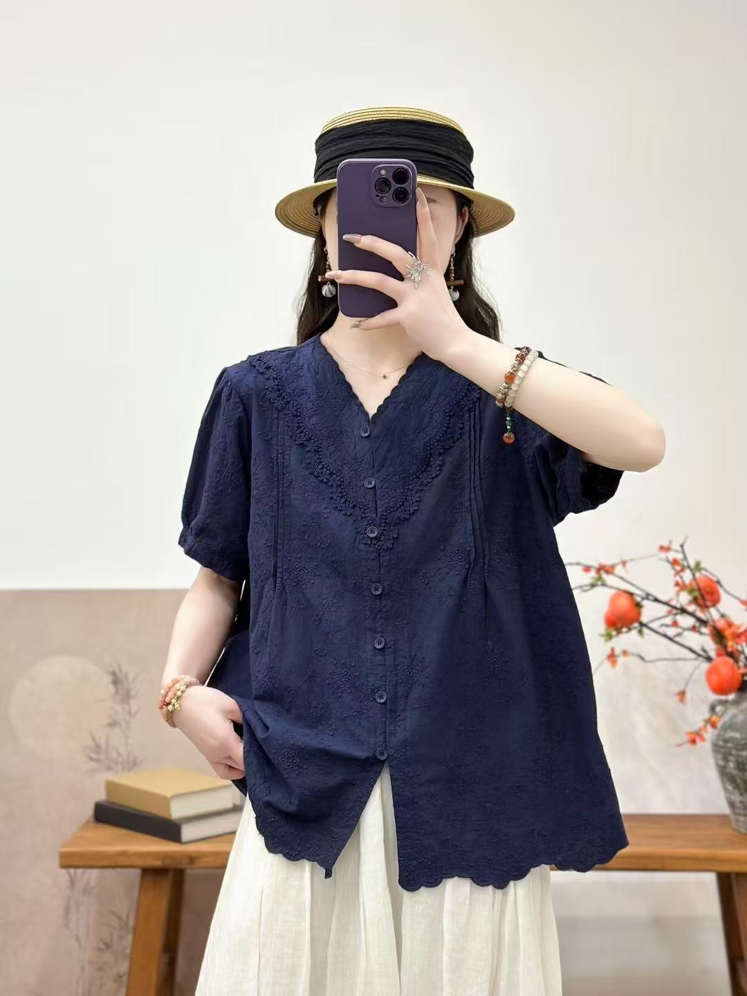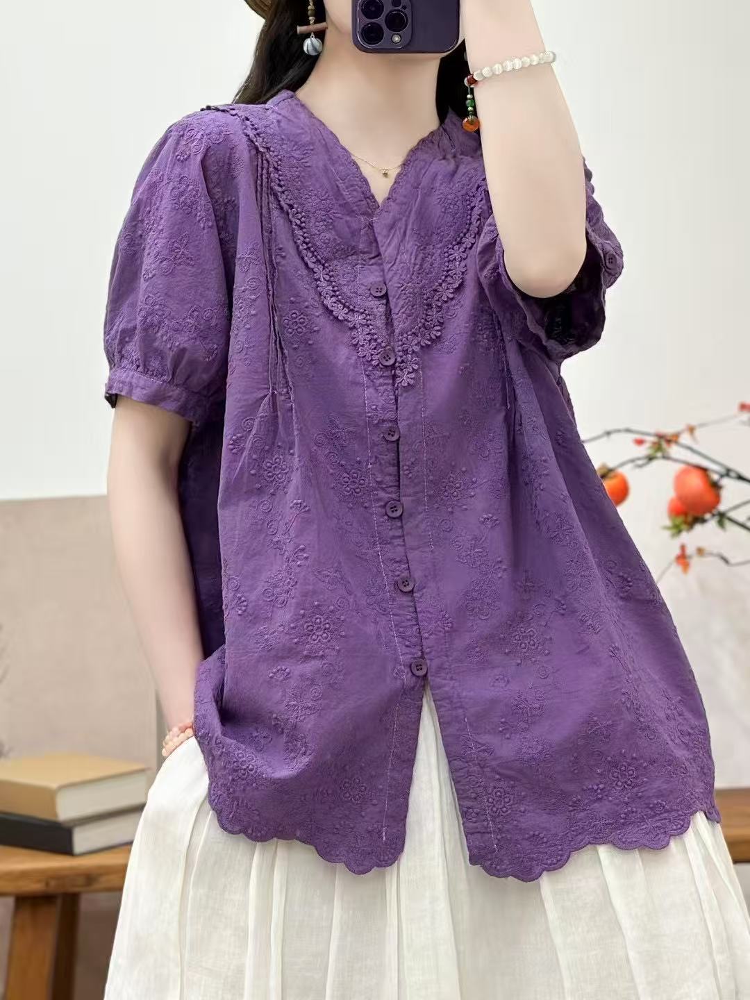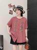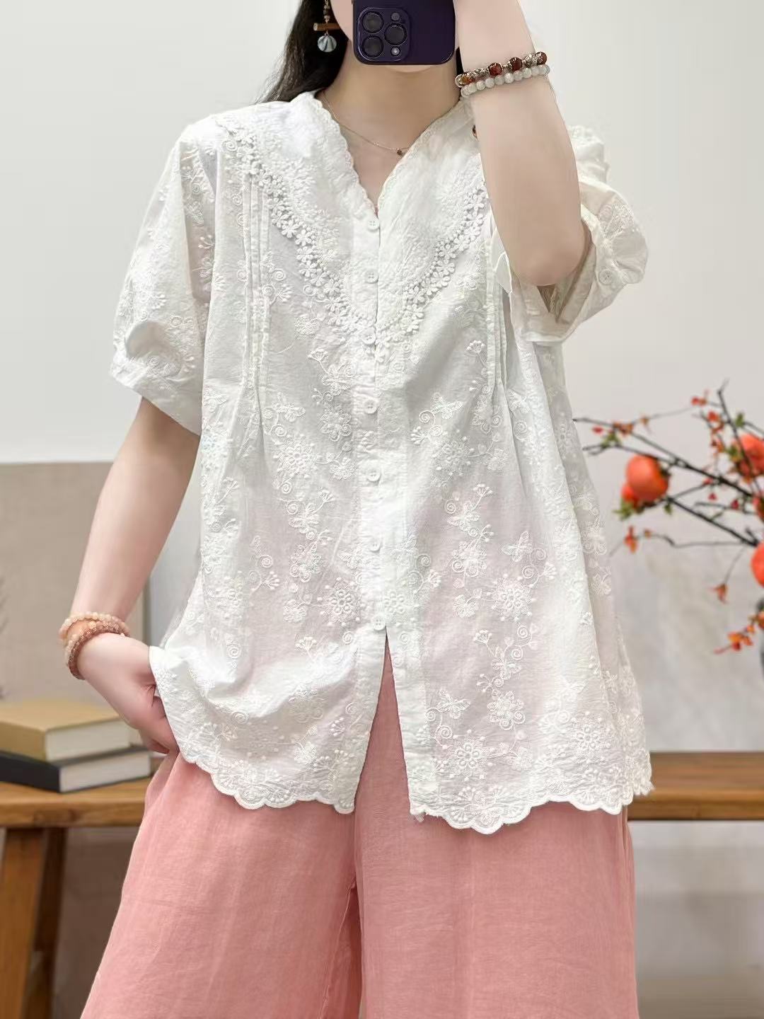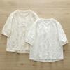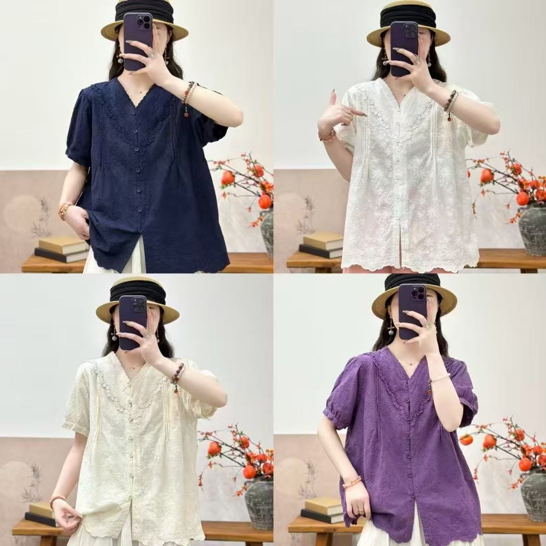 Camisa de manga corta de verano 2025 para mujer, cárdigan con bordado de flores, camiseta de color liso, top grande y holgado