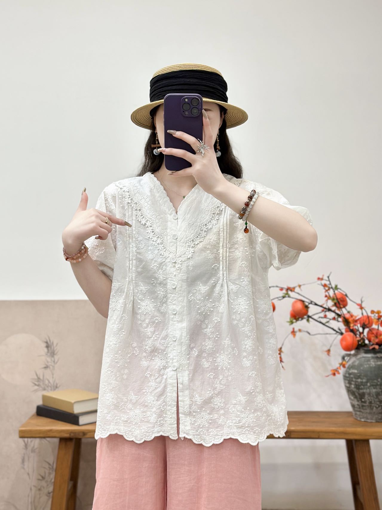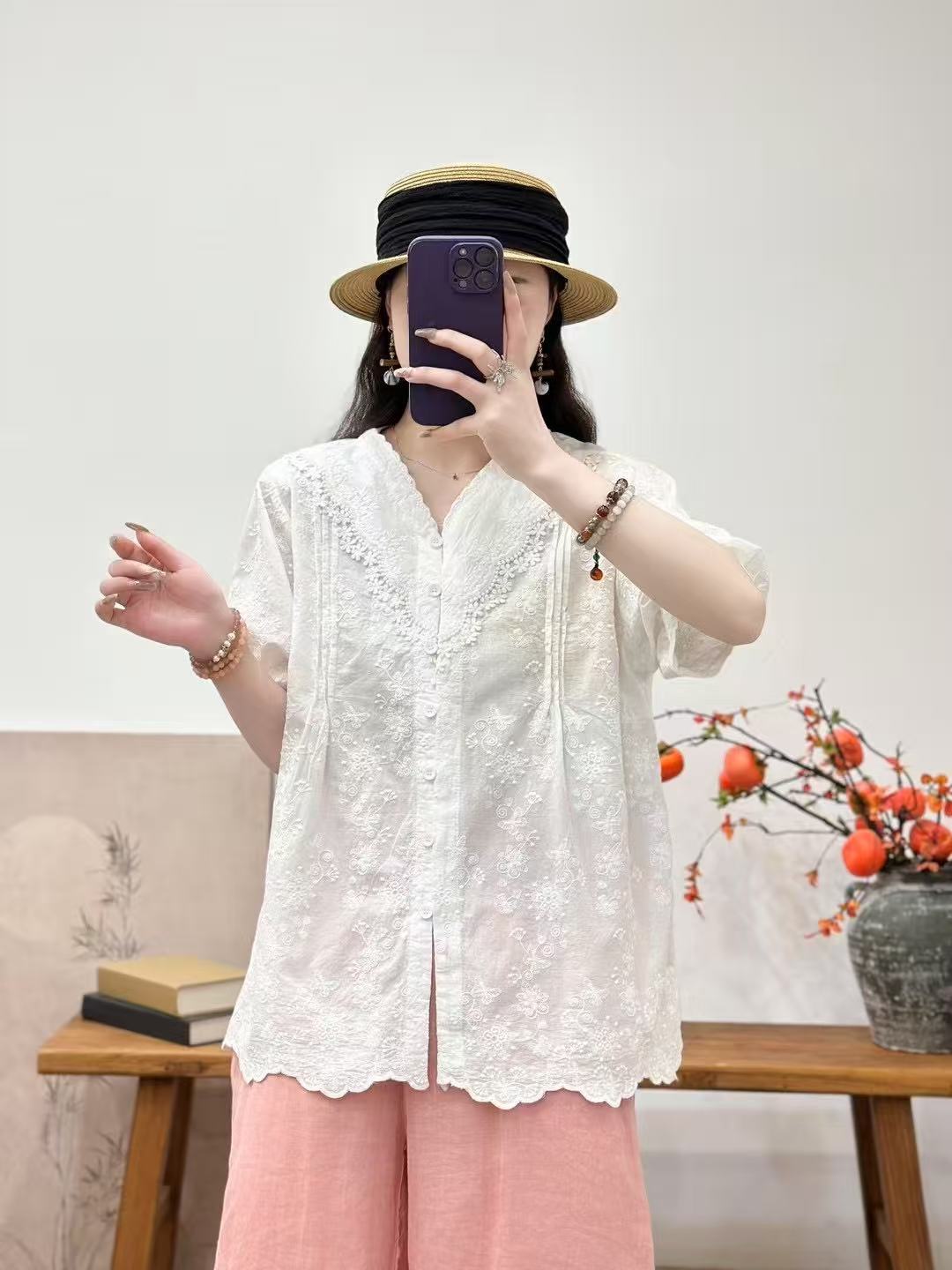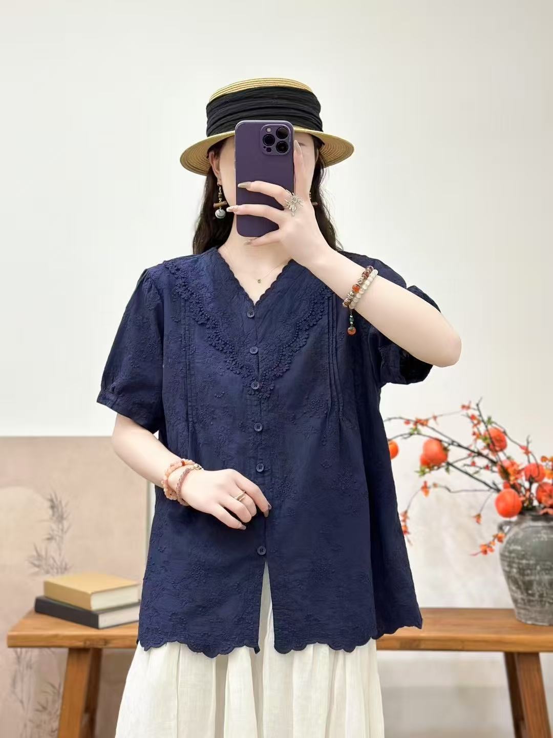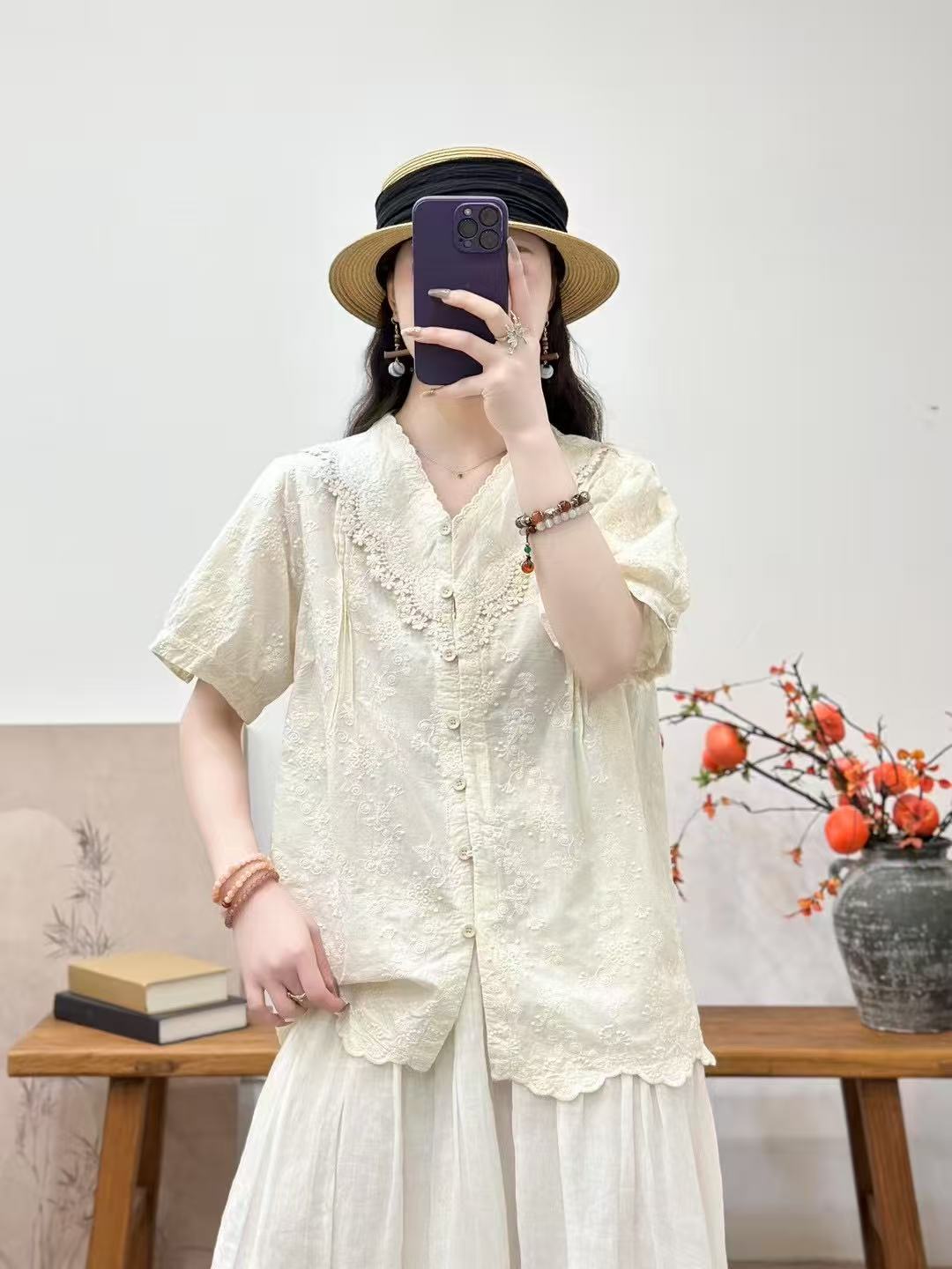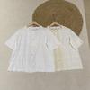 Camisa de manga corta de verano 2025 para mujer, cárdigan con bordado de flores, camiseta de color liso, top grande y holgado