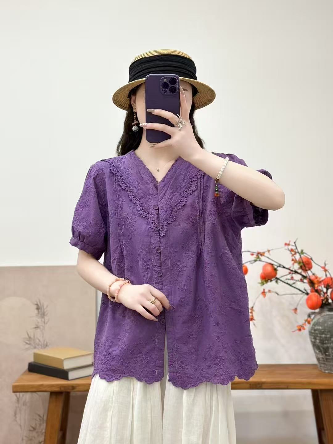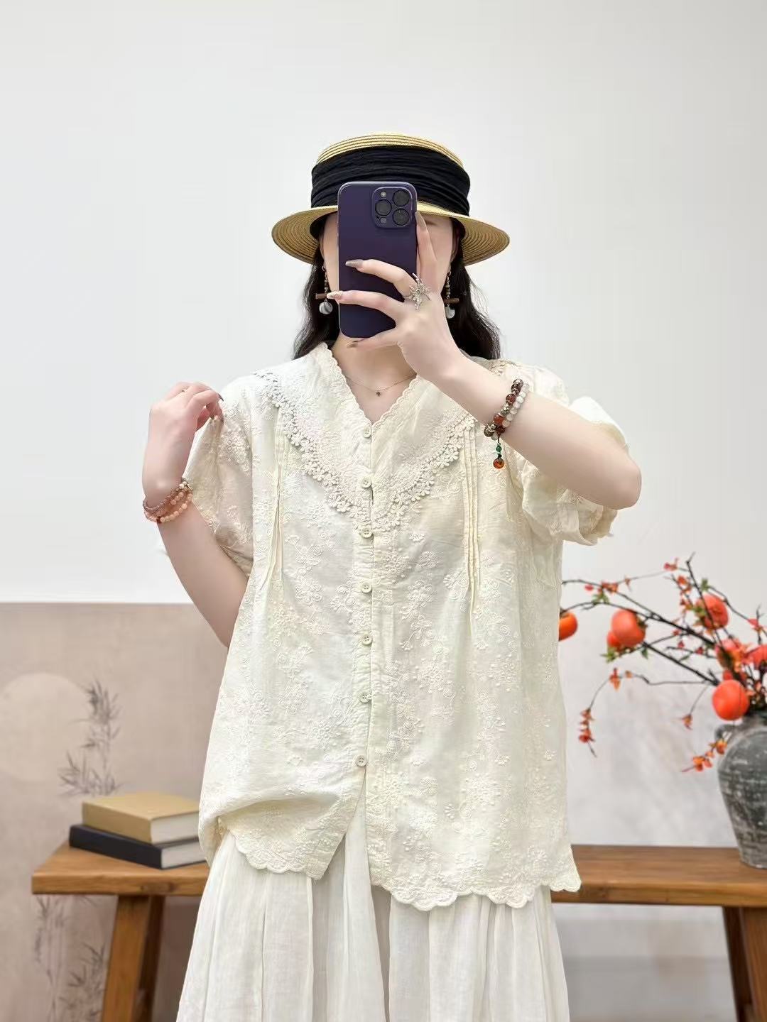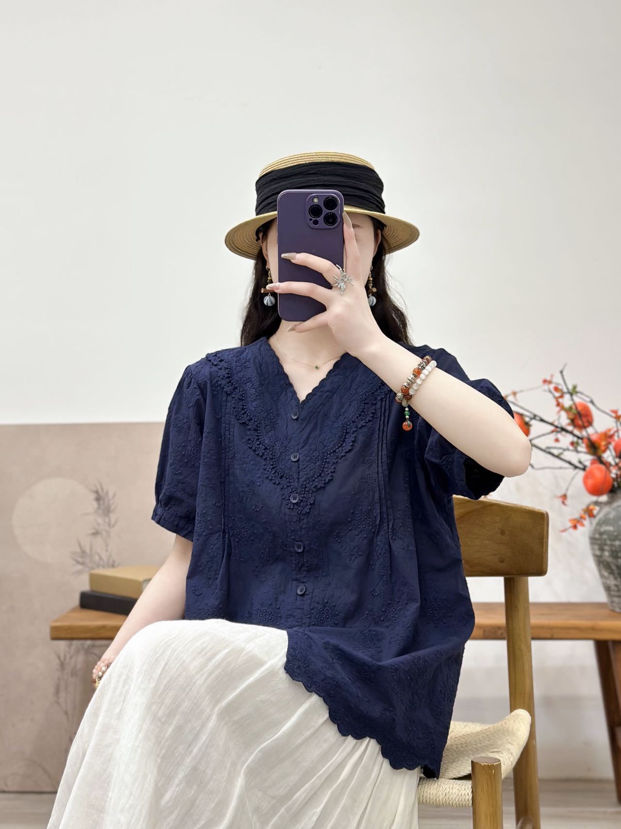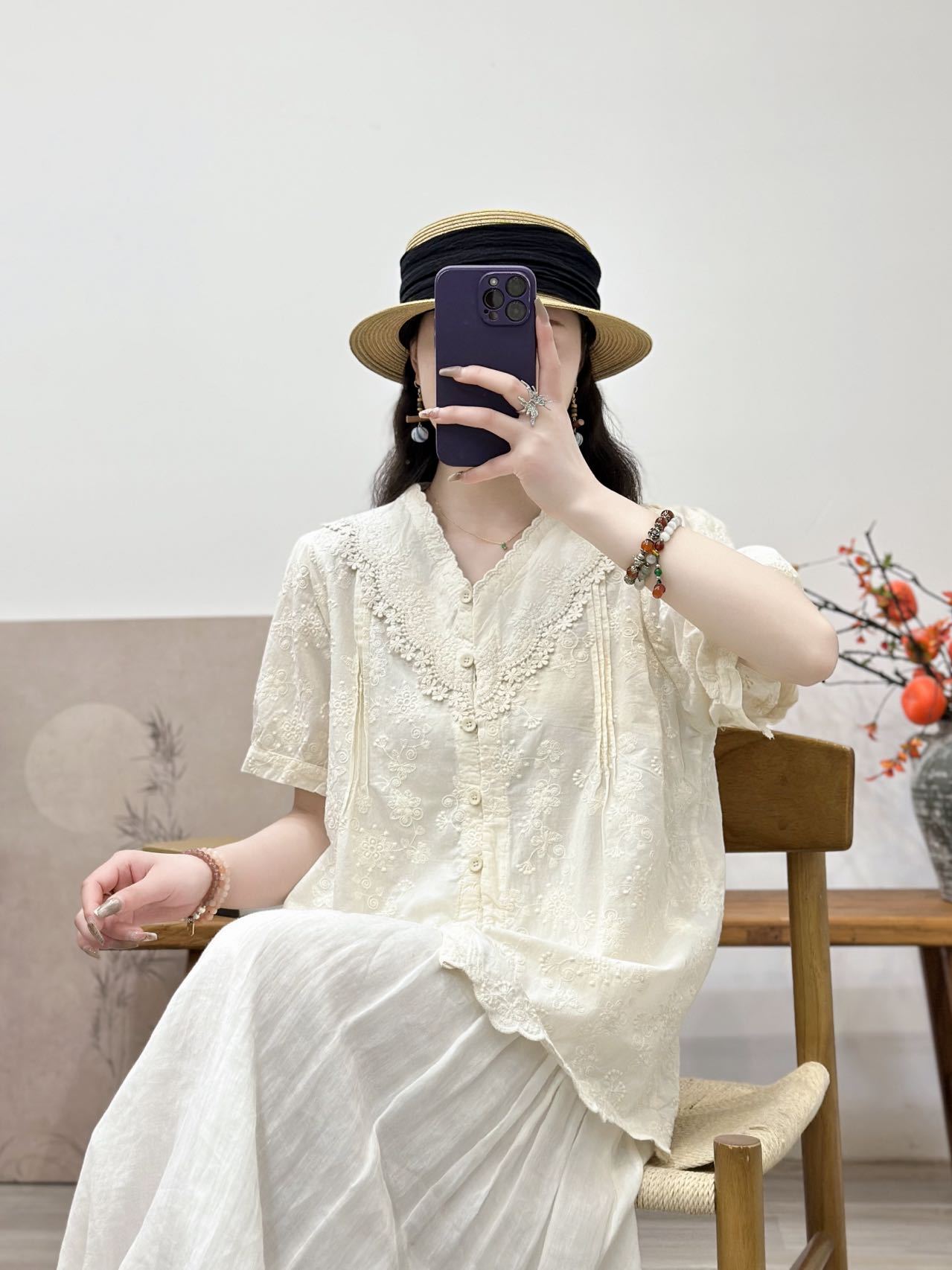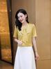 Camisa de manga corta de verano 2025 para mujer, cárdigan con bordado de flores, camiseta de color liso, top grande y holgado