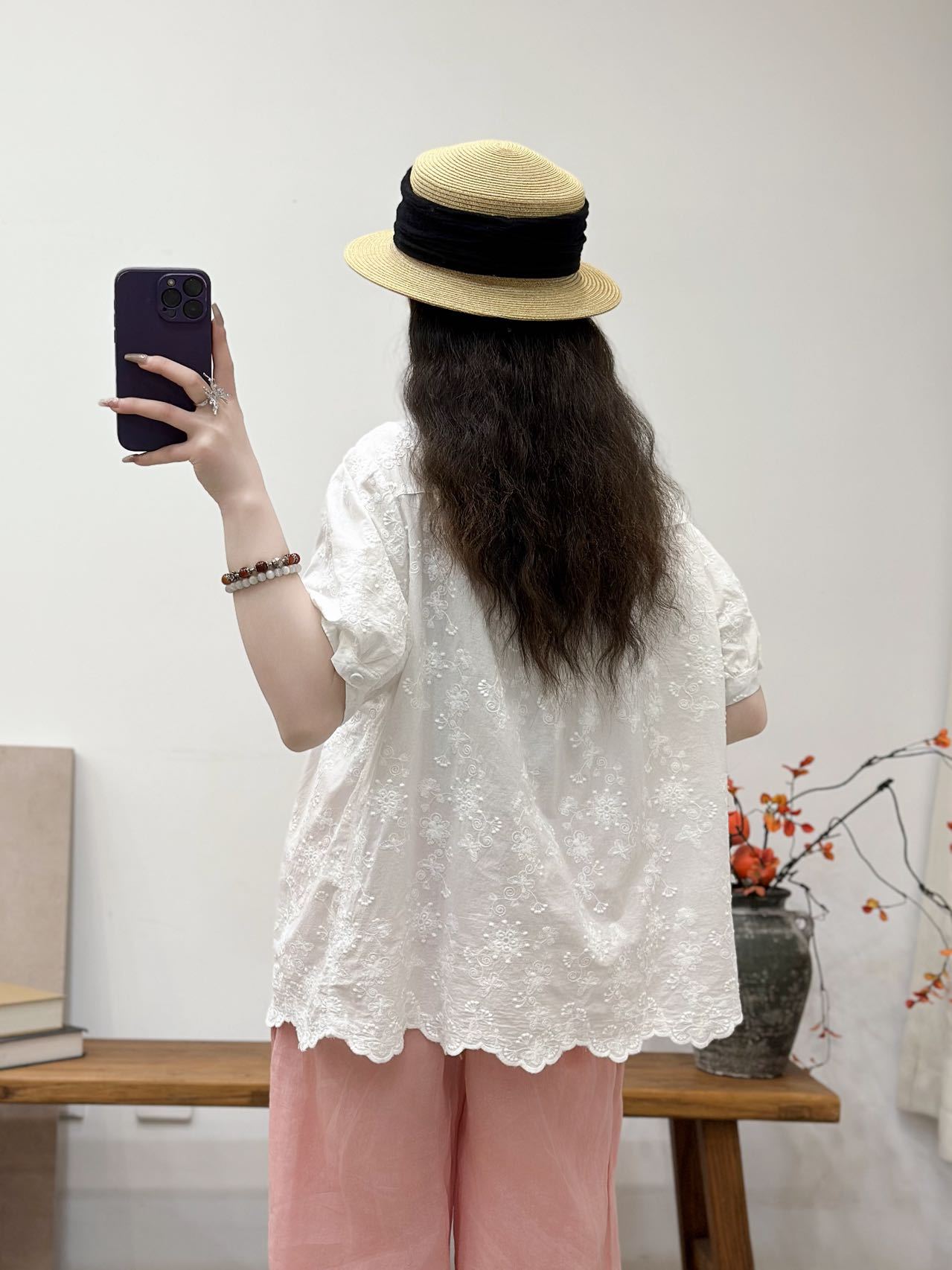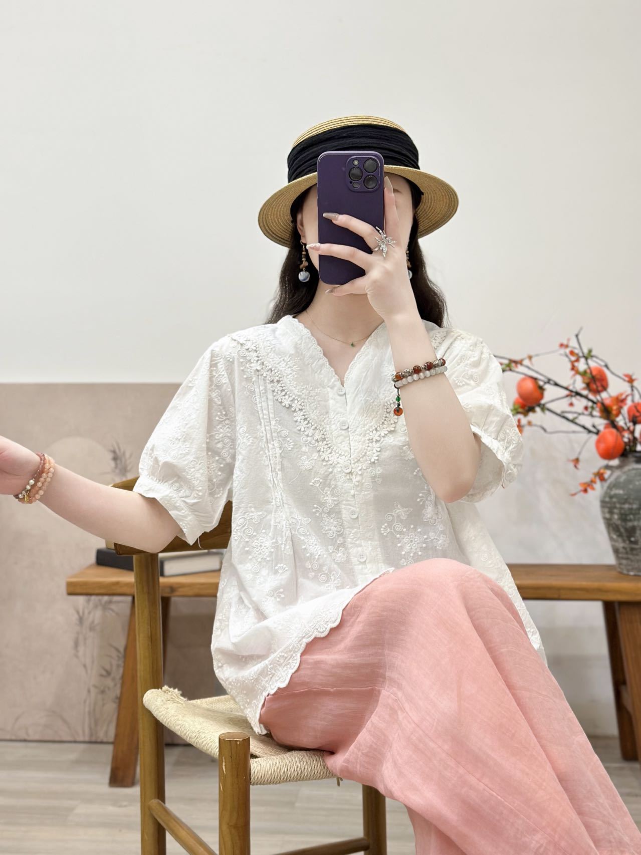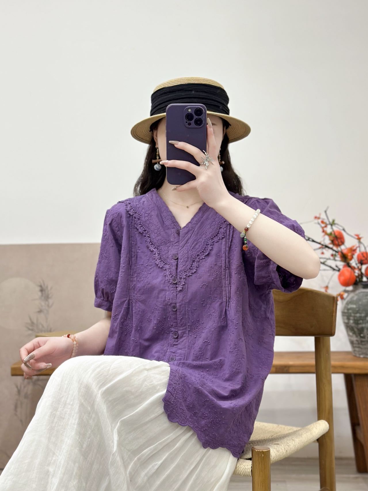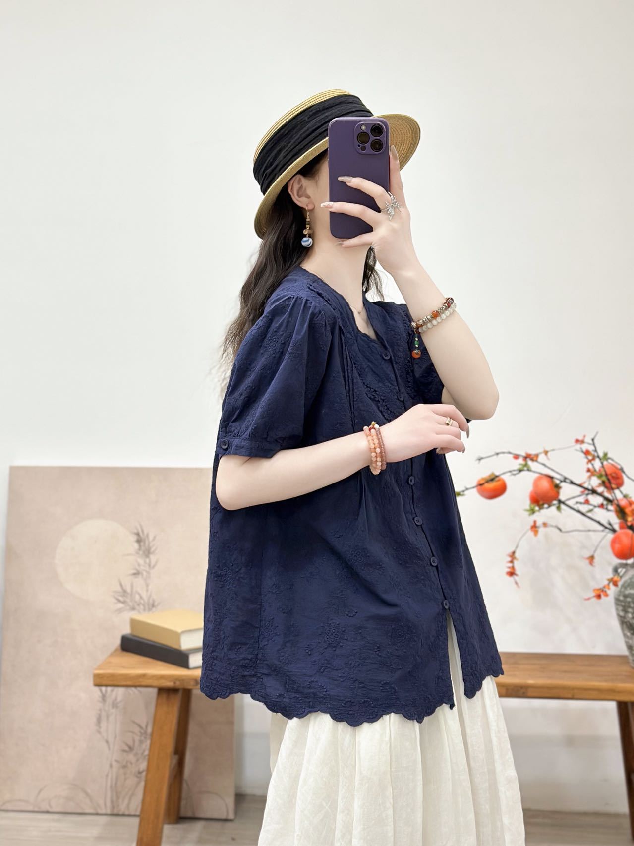 Camisa de manga corta de verano 2025 para mujer, cárdigan con bordado de flores, camiseta de color liso, top grande y holgado