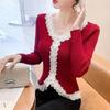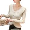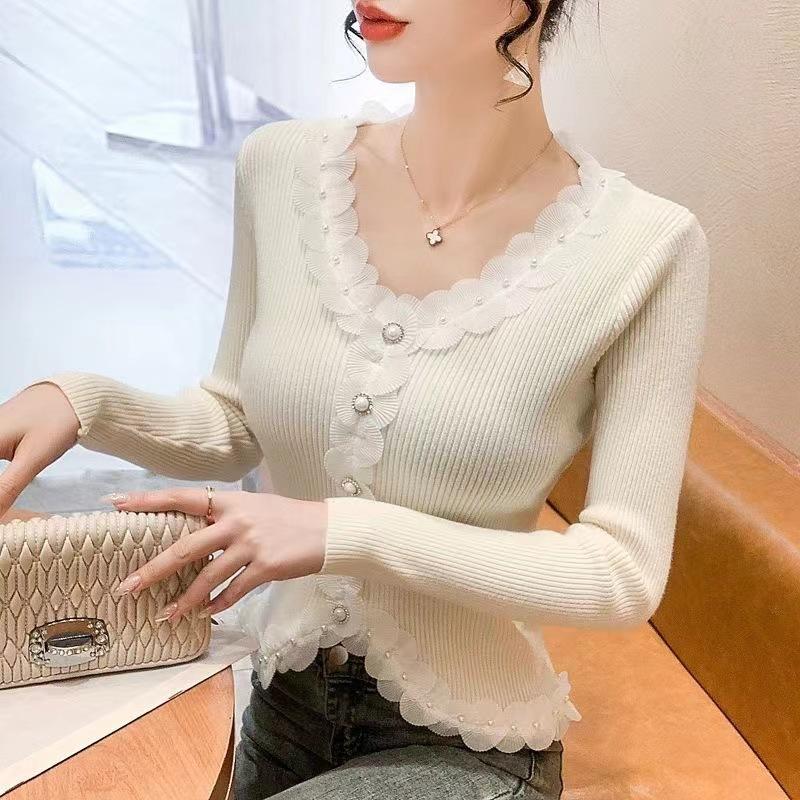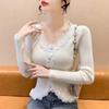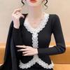 Camisa de manga larga con cuello en V y costuras de encaje tridimensionales de alta gama para primavera y otoño, top ajustado de mujer a la moda